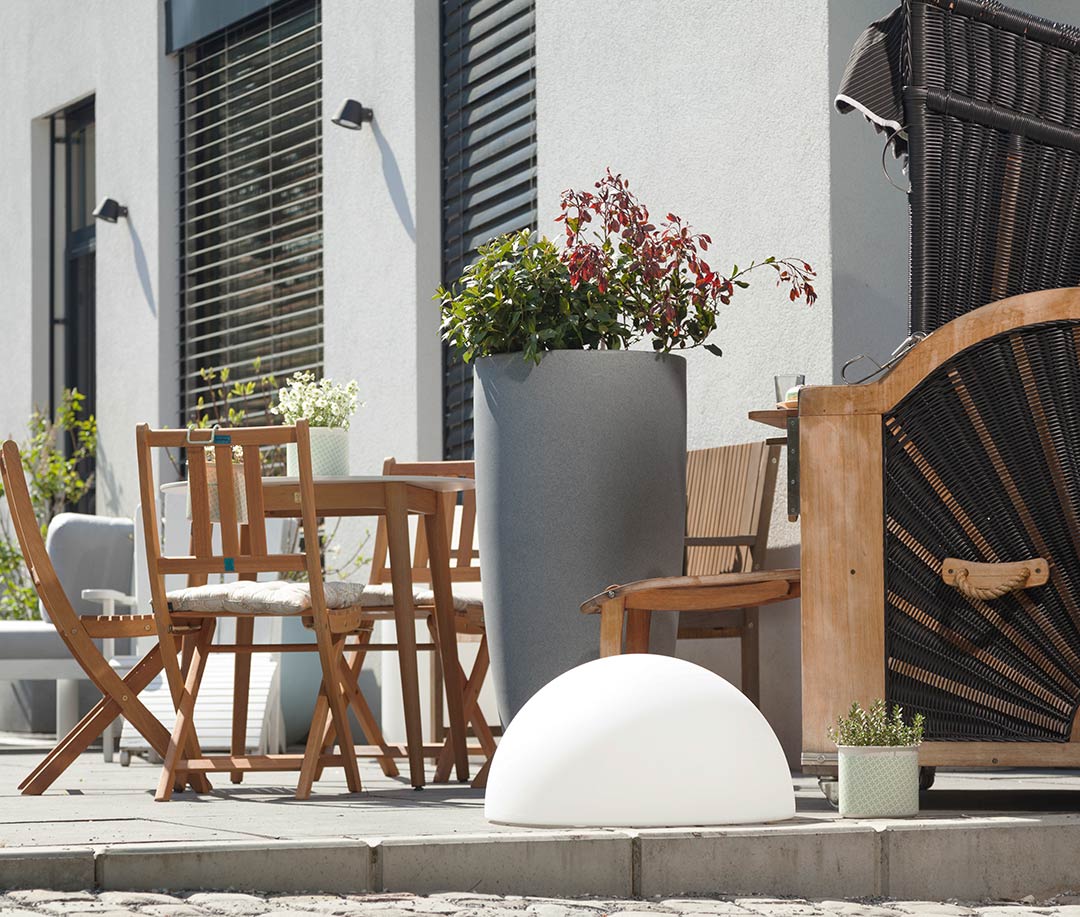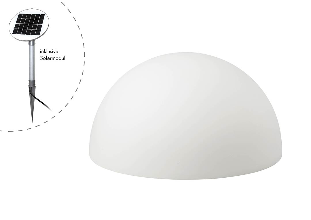 Unsere moderne Aussenlampe mit Solar Modell Sunrise lässt sich im Außenbereich mit einer Lichthelligkeit von 800 Lumen gut als Terrassenbeleuchtung oder Vorgartenbeleuchtung integrieren. Mit der zeitlosen runden Form ist die weiß beleuchtete Halbkugel sehr gut draußen als schöner Eye-Catcher einsetzbar. Auch als Gartenbeleuchtung an Wegesrändern oder in den Beetanlagen ist die ganzjährig nutzbare Außenleuchte schön anzuschauen. Die Leuchte Sunrise wirkt besonders dekorativ inmitte von Pflanzen oder anderen Dekorationsartikeln. Dank der hochwertigen Solartechnik lässt sich die Aussenlampe mit Solar Modell Sunrise ohne Aufwand und tägliches manuelles Ein-und Ausschalten bedienen. Ganz ohne Stromanschluß und lästige Verlängerungskabel kann die dekorative Bodenleuchte je nach Bedarf auch einfach mal umgesetzt werden. Damit lassen sich auch vom Haus entferntere Standorte und Ecken stimmungsvoll beleuchten. Die wetterfeste Aussenlampe mit Solar misst in der Höhe 27 cm. Der Durchmesser beträgt 50 cm. Das Gewicht der Leuchte beträgt 2,5 kg. Die hohe Belastbarkeit entsteht durch die Herstellung aus hochwertigem Polyethylen. Das macht die weiße steinförmige Außenbeleuchtung robust gegenüber Sonne, Regenwetter oder Frost. Die Außenbeleuchtung Sunrise unterliegt während der Produktion ständigen Qualitätskontrollen. Der deutsche Hersteller liefert mit einer 24-monatigen Herstellergarantie ab Werk. Die dekorative Gartenbeleuchtung ist mit der Schutzart IP 44 gut spritzwassergeschützt und natürlich regenresistent. Die Leuchte ist mit einer pflegeleichten Oberfläche ohne chemische Reiniger gut zu säubern. Etwas Spülmittel und Wasser reichen dafür völlig aus.