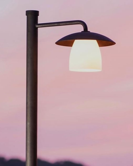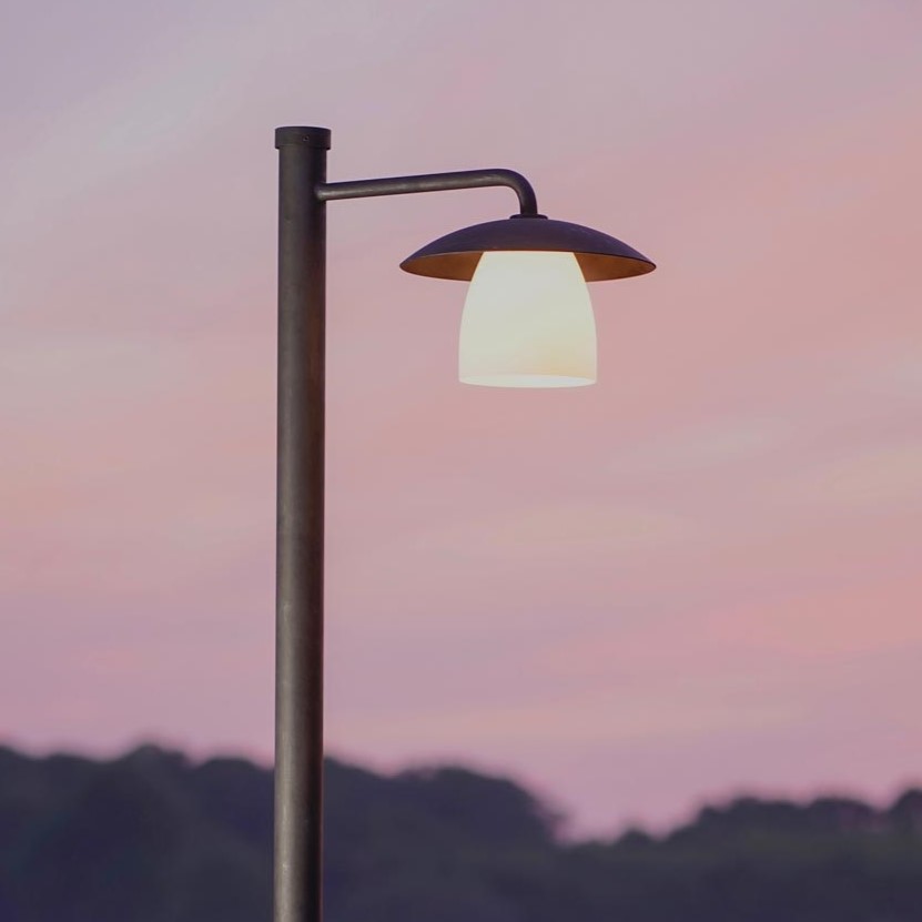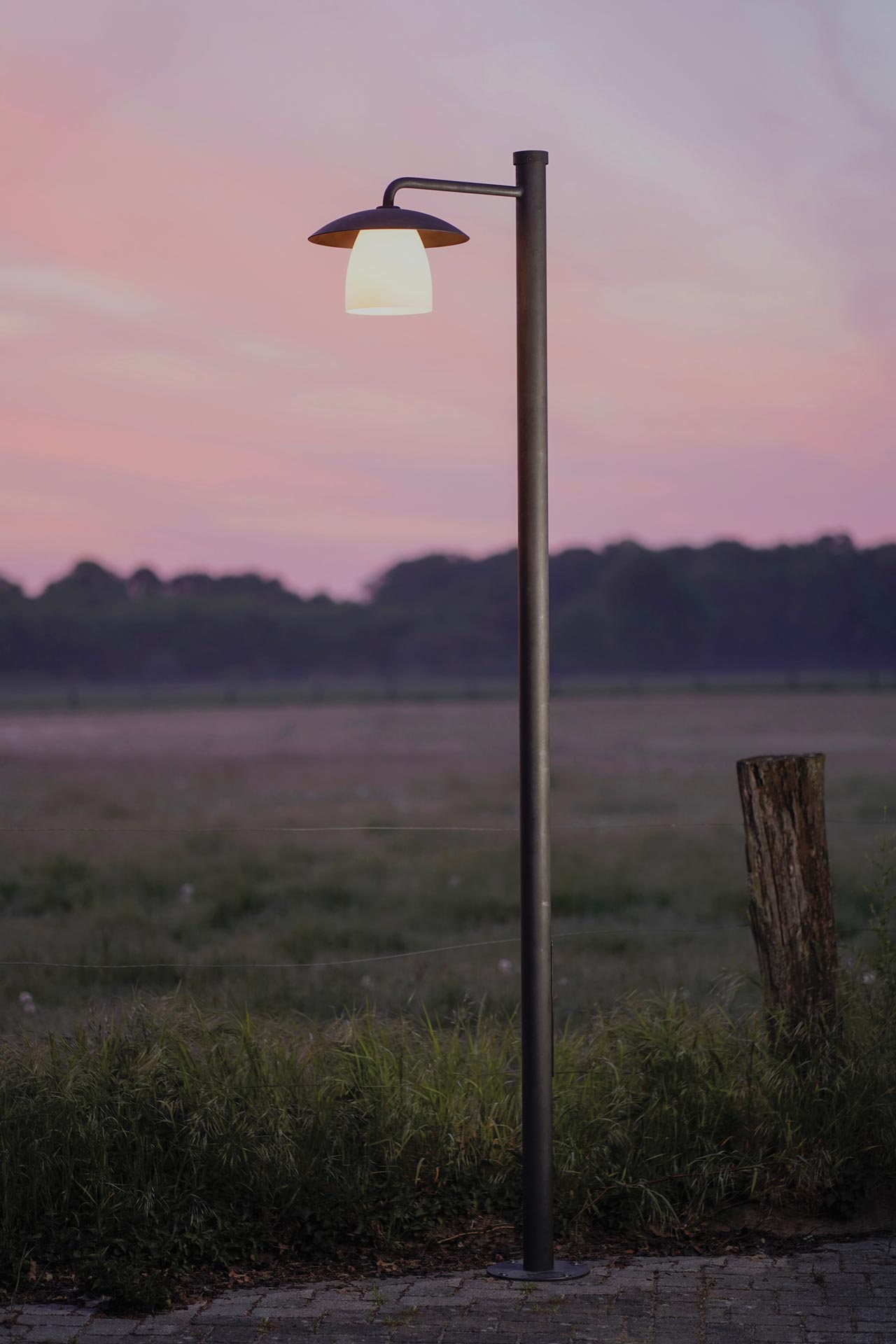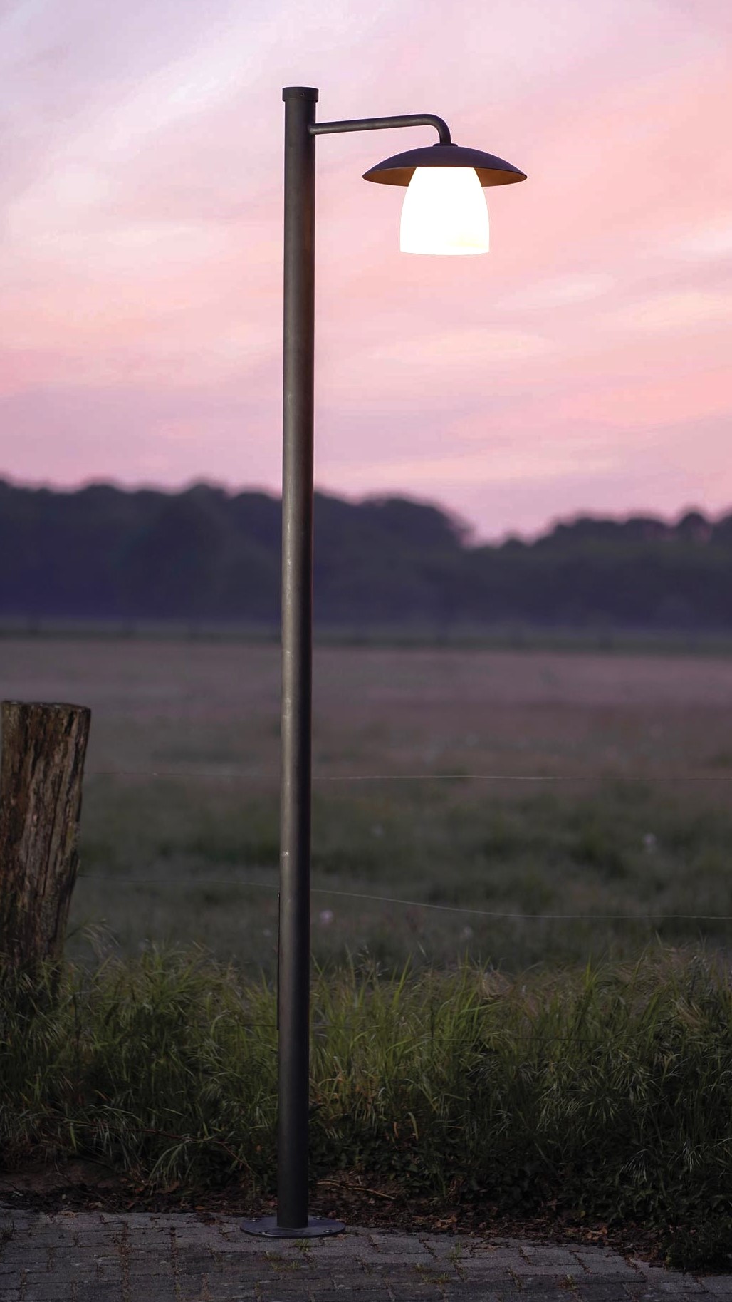Die im Design klassische Designer Aussenleuchte Landhausstil stehend eignet sich sehr gut als stilvolle Gastronomie-Außenbeleuchtung für historische Gebäude und Landhäuser. Auch in Kombination mit moderner Architektur ist diese Outdoor-Stehleuchte ein schöner Hingucker. Mit ihrem schmiedeeisernen Look in der Farbe Eisen natur und dem nach unten offenen rundförmigen Opalglas überzeugt die Leuchte im Design, ist aber auch qualitativ eine sehr gute Wahl. Die aus hochwertigen Materialien gefertigte Outdoor-Stehleuchte wird für eine besondere Langlebigkeit aus feuerverzinktem Stahl hergestellt. Die stilvolle Aussenleuchte Landhausstil stehend lässt mit ihrem nach unten gerichteten Lichtschein in Ihren Außenanlagen tolle Lichtakzente entstehen. Die qualitativ hochwertige Designer Aussenleuchte ist von ihren Maßen 2,81 Meter hoch cm hoch und misst eine Breite von 63,3 cm. Die hohe Gartenleuchte Verona eignet sich ebenso als Beleuchtung im vorderen Hausbereich wie auch als Wegeleuchte oder im weitläufigen Garten als Lichtquelle in dunklen Ecken. Das Finish Eisen natur verleiht der exklusiven Gartenbeleuchtung einen authentischen Look, der sich harmonisch in jede Umgebung einfügt. Die hochwertige Aussenleuchte Landhausstil stehend besteht aus dem massiven verzinkten Stahlmast mit einem L-förmigen Arm und einer tellerförmigen Leuchtenhaube ebenfalls aus robustem feuerverzinkten Stahl sowie dem mundgeblasenen echten Opalglas in Form eines nach unten geöffneten Kelches. Dabei wird in der deutschen Leuchtenmanufaktur viel Wert auf eine detailgetreue und fachmännische Herstellung gelegt. Die verwendete E27-Lampenfassung wird bei der Aussenleuchte Landhausstil stehend mit Leuchtmitteln bis 60 Watt Leistung bestückt. Wir empfehlen als Lichtfarbe warmweißes Licht (2900 bis 3200 Kelvin). Leuchtmittel sind bei der Lieferung nicht enthalten.