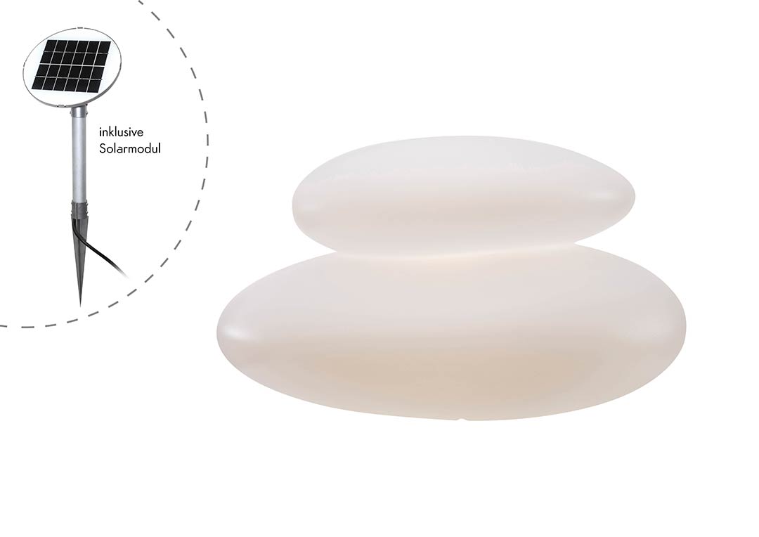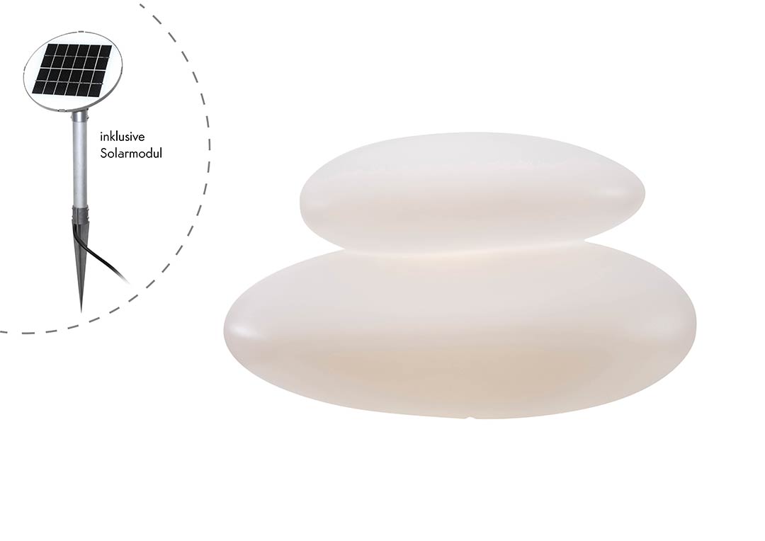 Die Aussenleuchte Stein mit Solar gehört zu unserer Leuchtenserie ZEN. Die vom Design moderne Außenbeleuchtung besteht aus zwei aufeinander gesetzten Flachsteinen in hochwertiger Kunststoffausführung, die von innen heraus leuchten. Die dekorative Steinleuchte sorgt dabei nicht nur in japanischen Gärten für schöne Lichtmomente, sondern setzt mit ihrer weiß satinierten Oberfläche dekorativ und kreativ auch in Ihren Außenanlagen moderne bis zeitlose Lichtakzente. Die Design-Gartenleuchte überzeugt mit weichen Linien und lässt eine durchaus entspannte Lichtstimmung entstehen. Ob zum Anlaß eines Events, kleinerer und größerer Feiern oder einfach als den Abend begleitendes stimmungsvolles Lichtambiente, die im Design moderne Aussenleuchte Stein mit Solar aus unserer Leuchtenserie ZEN erweckt Ihre Außenanlagen mit aufkommender Dunkelheit zum Leben.