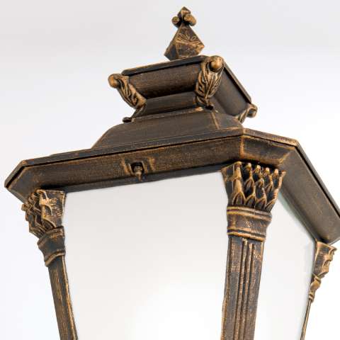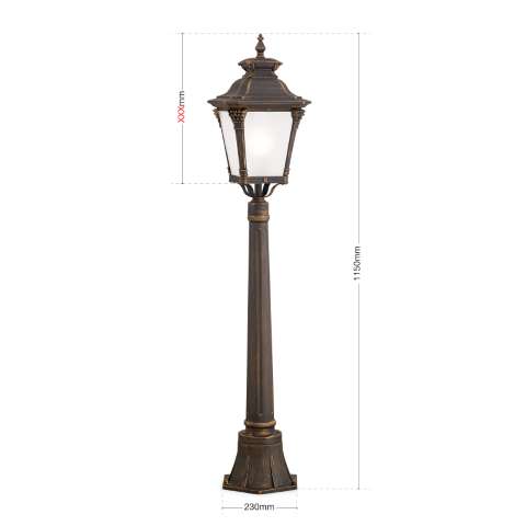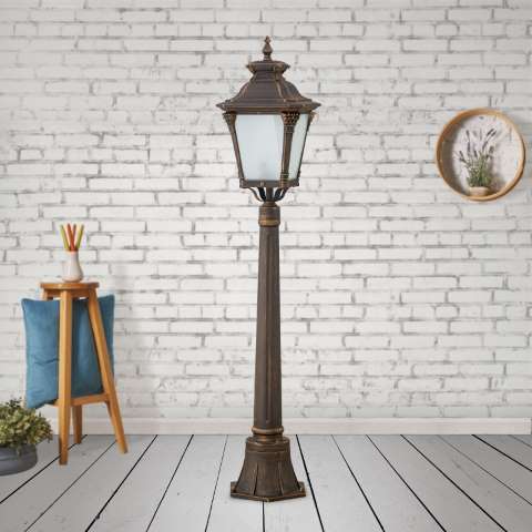 Die im Design klassisch-antike Aussenleuchte für Restaurant verleiht Ihrem Außenbereich ein nostalgisches Flair. Postieren Sie die dekorative Vintage-Aussenleuchte an Ihren Wegesrändern oder Kreuzungen, im Vorgarten oder auch als stilvolle Terrassenbeleuchtung. Bringen Sie mit dieser nostalgischen Gartenlaterne Licht in dunkle Ecken. Die antik-messingfarbene Gartenbeleuchtung im Vintage Schmiededesign ist Teil unserer Außenleuchtenserie Bregenz. Die stilvolle Außenbeleuchtung ist von ihren Maßen 117 cm hoch und 23 cm breit bzw. tief. Die viereckige Laterne wird von einem dekorativen Mastfuß mitzahlreichen Verzierungen getragen, der sich in der Form nach oben hin verjüngt. Feine Zierelemente und eine kannelierte Montur runden das antike Design ab. Eine einbrennlackierte, handgewischte Patinafarbe veredelt den langlebigen Siluminguss, der besonders korrosionsbeständig ist und verleiht ihr ein antikes Aussehen. Die dekorative Aussenleuchte für Restaurant ist mit weiß satiniertem Echtglas versehen. Dank des verarbeiteten satinierten Echtglases erzeugt die stilvolle Aussenleuchte für Restaurant ein absolut blendfreies Licht, welches seitlich in vier Richtungen abgestrahlt wird. Satiniertes Glas schützt vor Blendeffekten und ermöglicht damit eine hohe Flexibilität bei der Wahl des bevorzugten Leuchtmittels. Denn auch LED Lichtpunkte werden durch den Diffusor als homogenes Licht wahrgenommen und eignen sich perfekt für die Beleuchtung ihrer Außenflächen. Für eine besondere Lichtatmosphäre sorgt auch die Möglichkeit des Dimmens, die Ihren Außenbereich in der gewünschten Lichtintensität erstrahlen lässt. (Phasenanschnittsdimmer erforderlich). Bis zu 60 Watt Leistung sind hier mit einer E 27-Fassung möglich. Je nach Bestimmungsort und Erforderlichkeit wählen Sie die für Sie passenden Leuchtmittel. Ob LED-Leuchtmittel oder auch Energiesparlampe, ob warmweißes Licht für eine stimmungsvolle Beleuchtung oder lieber eher kaltweißes Licht (höhere Kelvinzahl) für mehr Helligkeit, Sie bestimmen mit der Leuchtmittelwahl die Lichtwirkung Ihrer neuen Außenbeleuchtung. Leuchtmittel sind bei der Lieferung daher nicht enthalten. Mit der vom Hersteller angegeben Schutzart IP 23 empfehlen wir den Einsatz eher für etwas geschütztere Außenbereiche.
