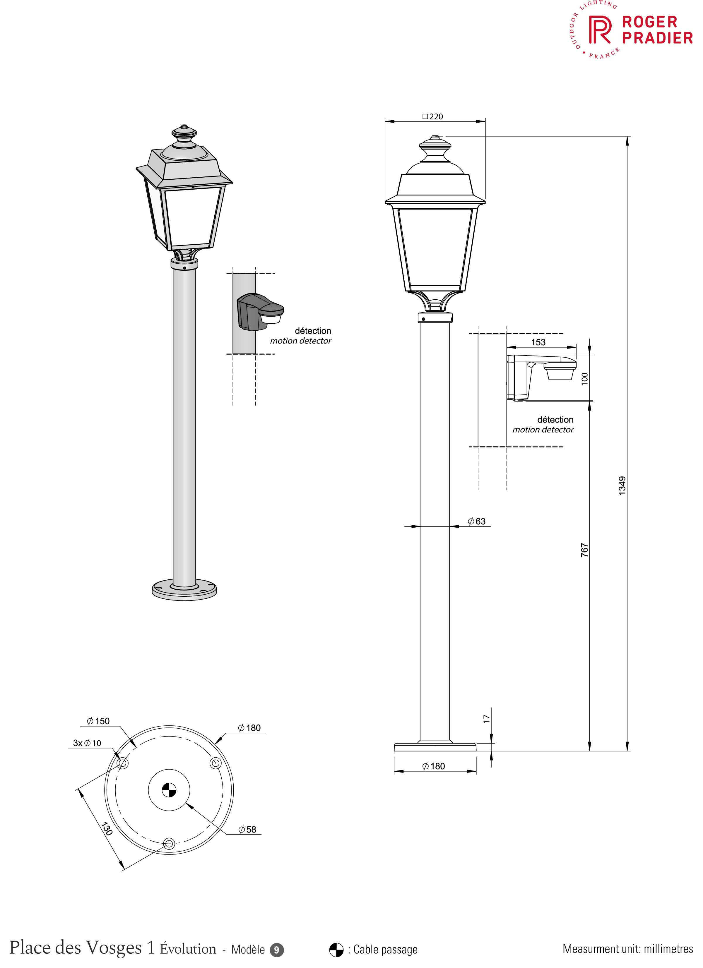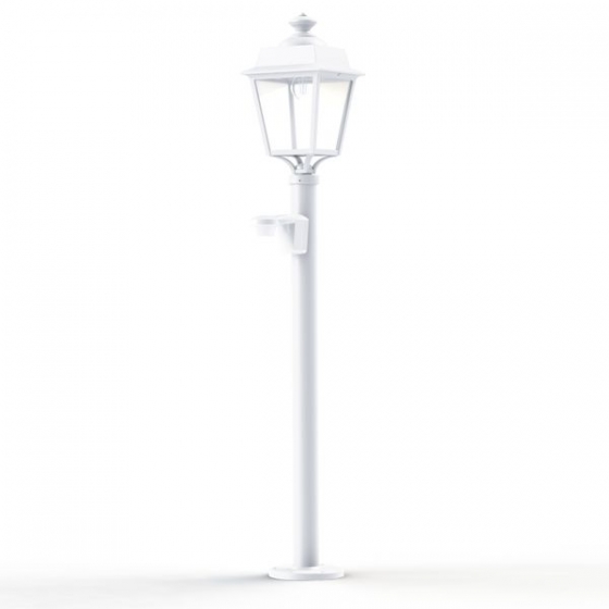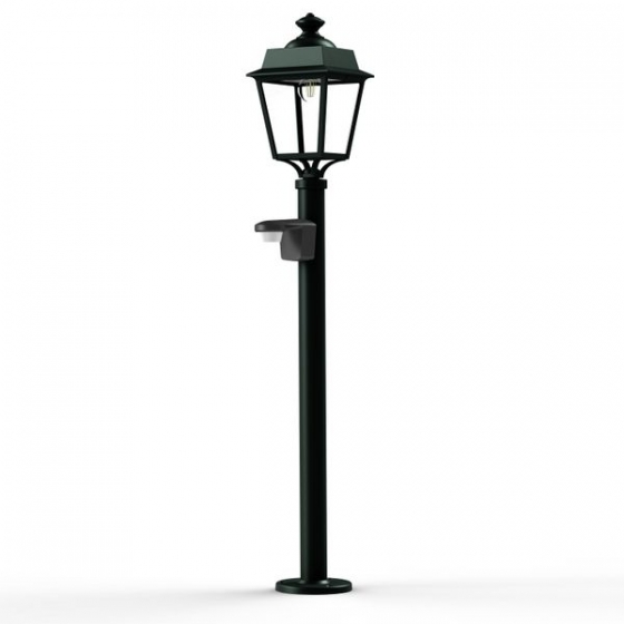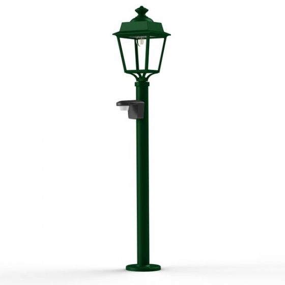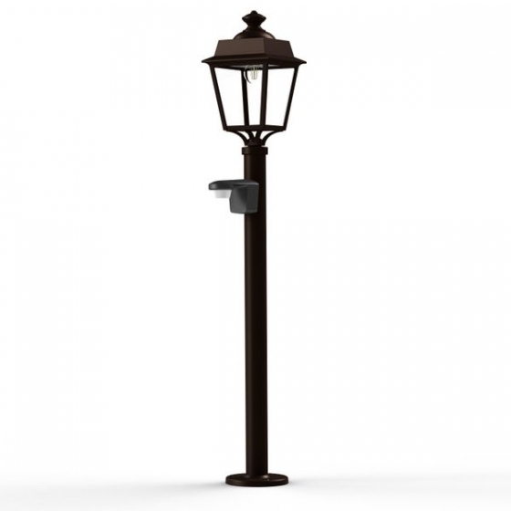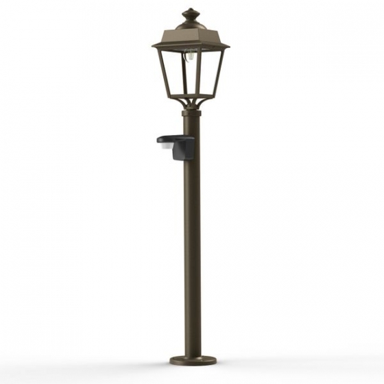 Die stilistisch klassisch antike Aussenleuchte mit Bewegungsmelder 135cm aus der Leuchtenserie Vogese 1 überzeugt sowohl mit einem stilvollen Design als auch in Puncto Qualität und Verarbeitung. Die wetterfeste Gartenlaterne ist von ihren Maßen 134,9 cm (1,35 Meter) hoch und 22 cm breit. Der rundförmige Sockelfuß ist am Boden im Durchmesser 18 cm groß. Die hochwertig verarbeitete Designer Gartenleuchte wird aus langlebigem Aluminium gefertigt. Die Außenstehleuchte zeichnet sich insbesondere durch den integrierten, an der Seite befindlichen, Bewegungsmelder aus. Die Reichweite des Bewegungsmelders beträgt maximal 5 Meter. Eine zeitliche Einstellung der Beleuchtung ist von einer Sekunde bis zu 20 Minuten Leuchtdauer möglich. Bei der weißen Leuchte ist der Bewegungsmelder weiß. Bei den farbigen Leuchten ist der Bewegungsmelder dagegen schwarz. Bei Bedarf kann der Bewegungsmelder laut Herstellerangaben auch entfernt werden. Bei der im Design klassischen Außenbeleuchtung stehen Ihnen je nach Geschmack und örtlichen Vorgaben bis zu 8 verschiedene Farben/RAL-Farben zur Verfügung. Wählen Sie bei der Designer Aussenleuchte mit Bewegungsmelder zwischen den Farben tiefschwarz (RAL 9005), weiß, schiefergrau, tannengrün (RAL 6009), sandsteinfarben, alt-rustikal (braun), grün-Patina oder gold-Patina. Der französische Hersteller gibt ab Werk auf das beschichtete Aluminium eine 25-jährige Anti-Korrosionsgarantie*. Die vier Fenstereinsätze werden bei der vierseitigen Gartenlaterne aus klarem oder aus opalfarbenen PMMA gefertigt. PMMA ist ein Kunststoff, der sich insbesondere durch seine Brillianz und Kratzfestigkeit auszeichnet. Wer ein blendfreies Licht bevorzugt, sollte sich für die Variante PMMA opalfarben entscheiden. Die wetterfeste Aussenleuchte mit Bewegungsmelder entspricht der Schutzart IP 65 (absolut wasserbeständig) sowie der Schutzklasse 1. Bringen Sie mit der hochwertigen Gartenbeleuchtung Vogese 1 stilvoll Licht ins Dunkle Ihrer Außenanlagen. Die dekorative Außenleuchte macht aber auch bei Tage eine gute Figur. Mit zunehmender Dämmerung und bei Bewegung wird dann dank des Bewegungsmelder die Beleuchtung automatisch aktiviert.