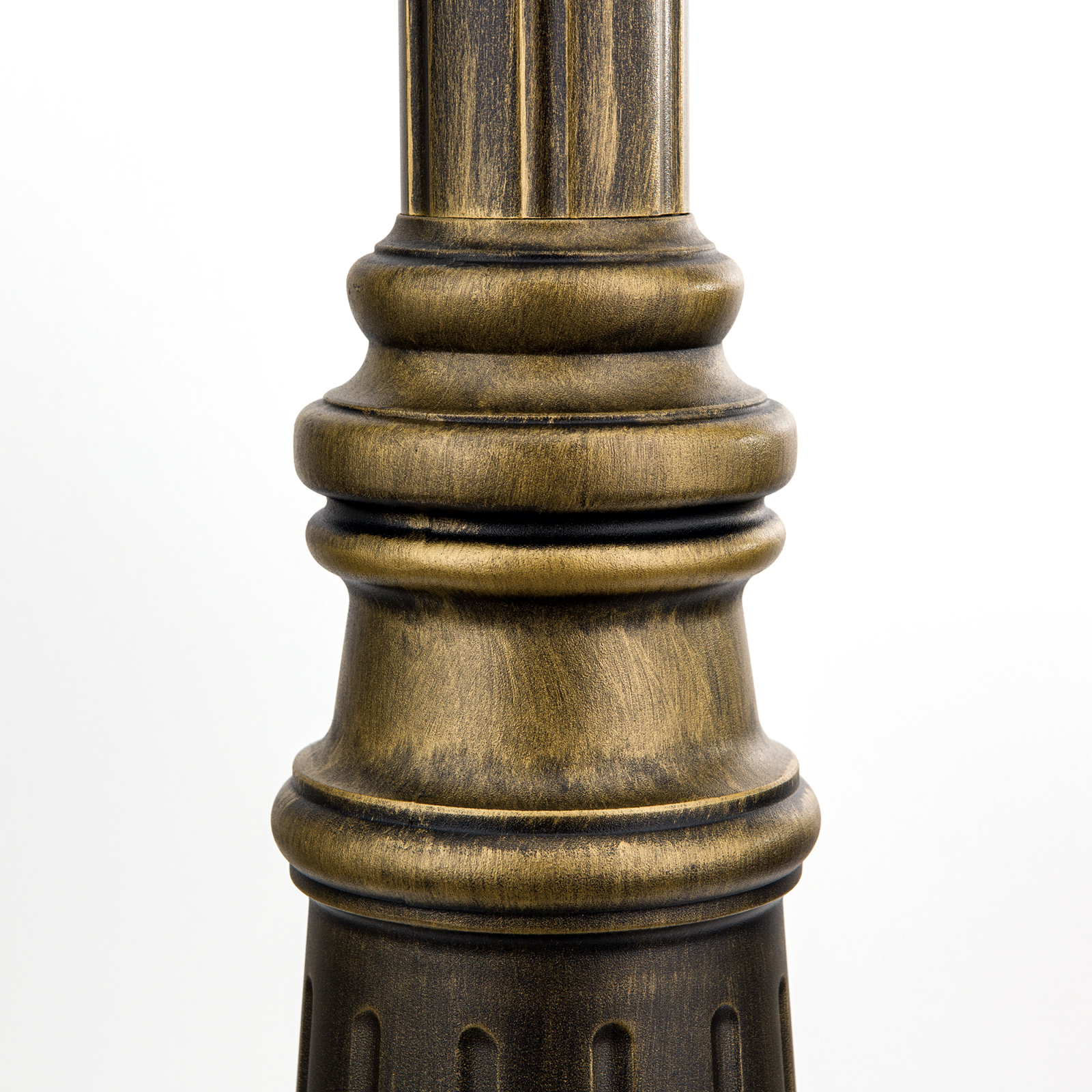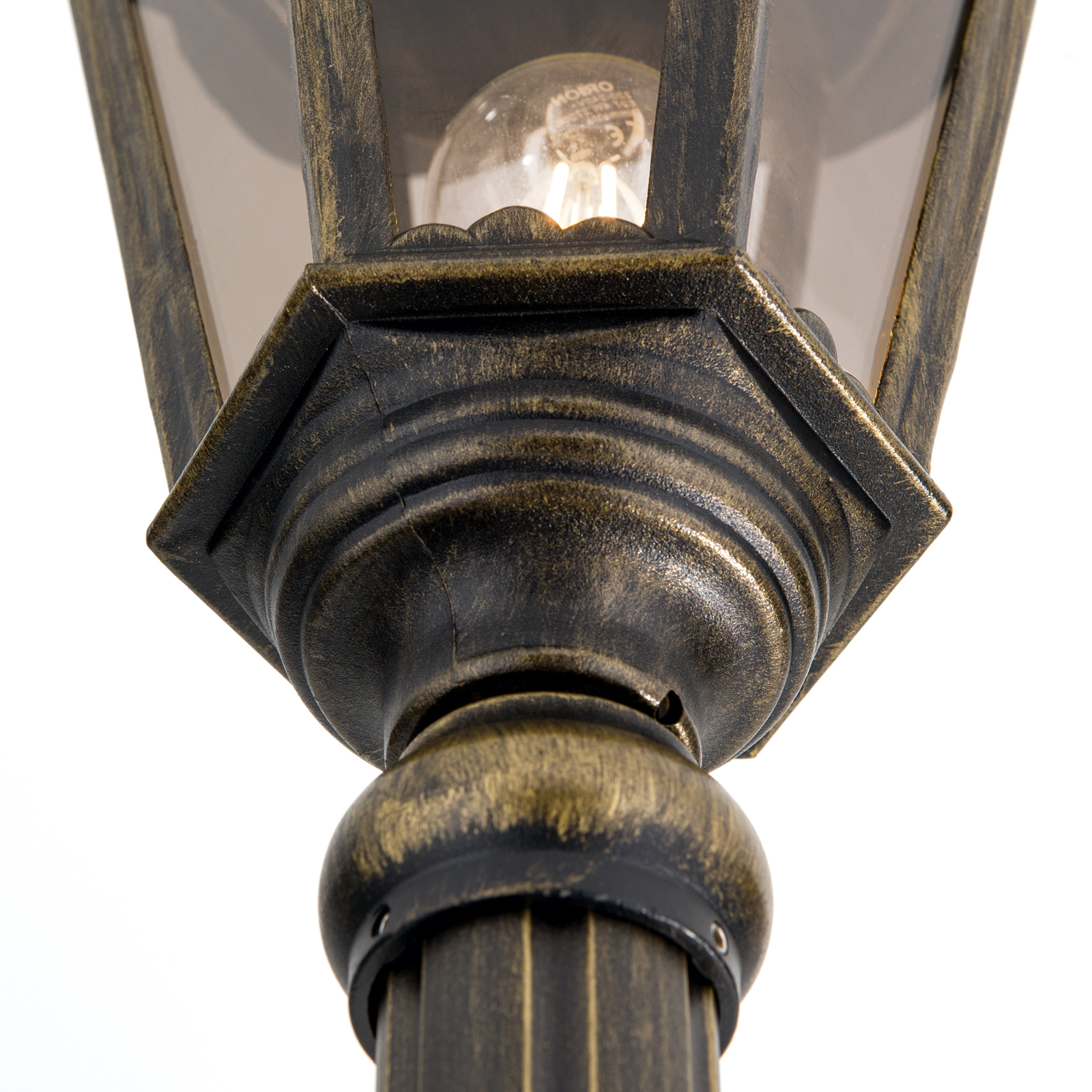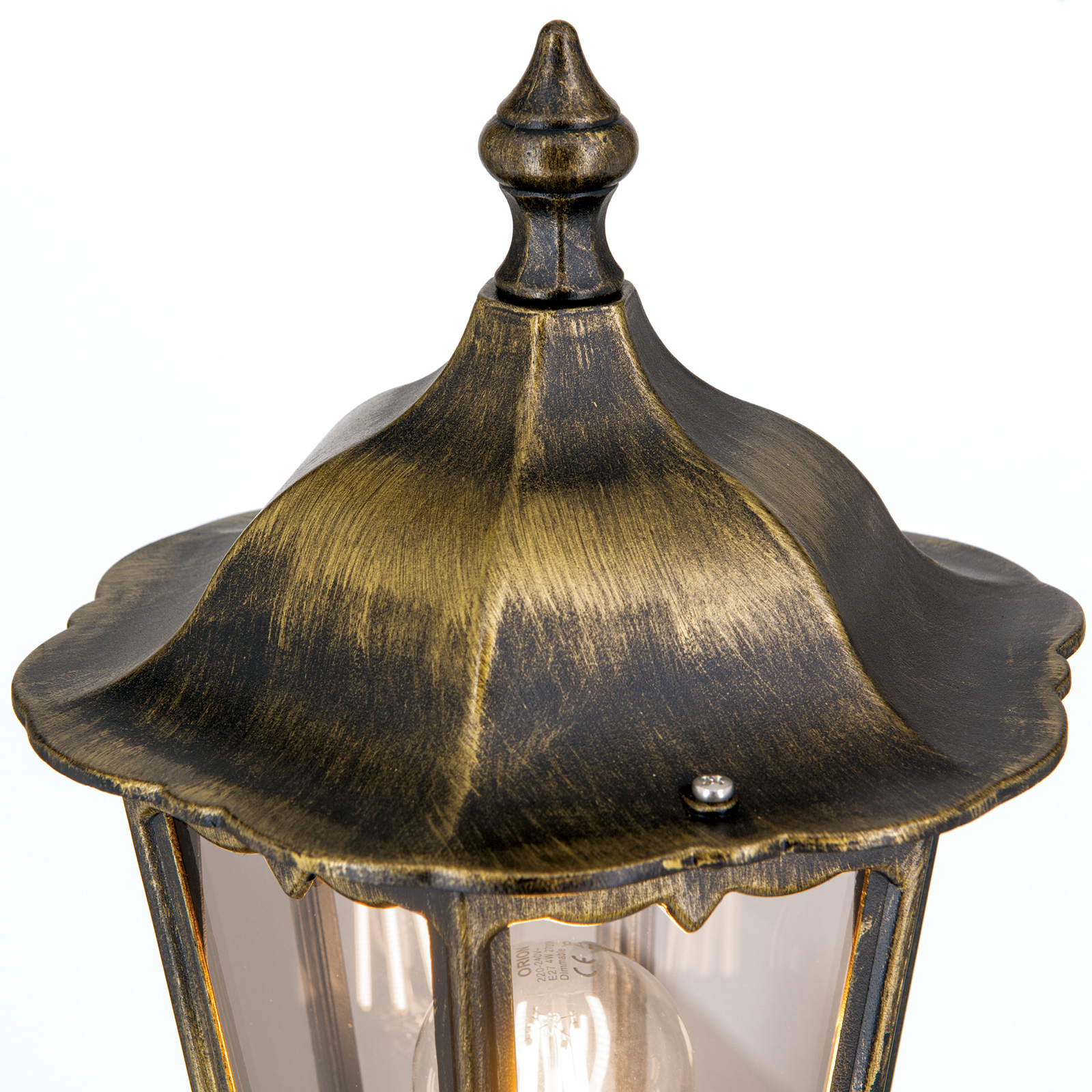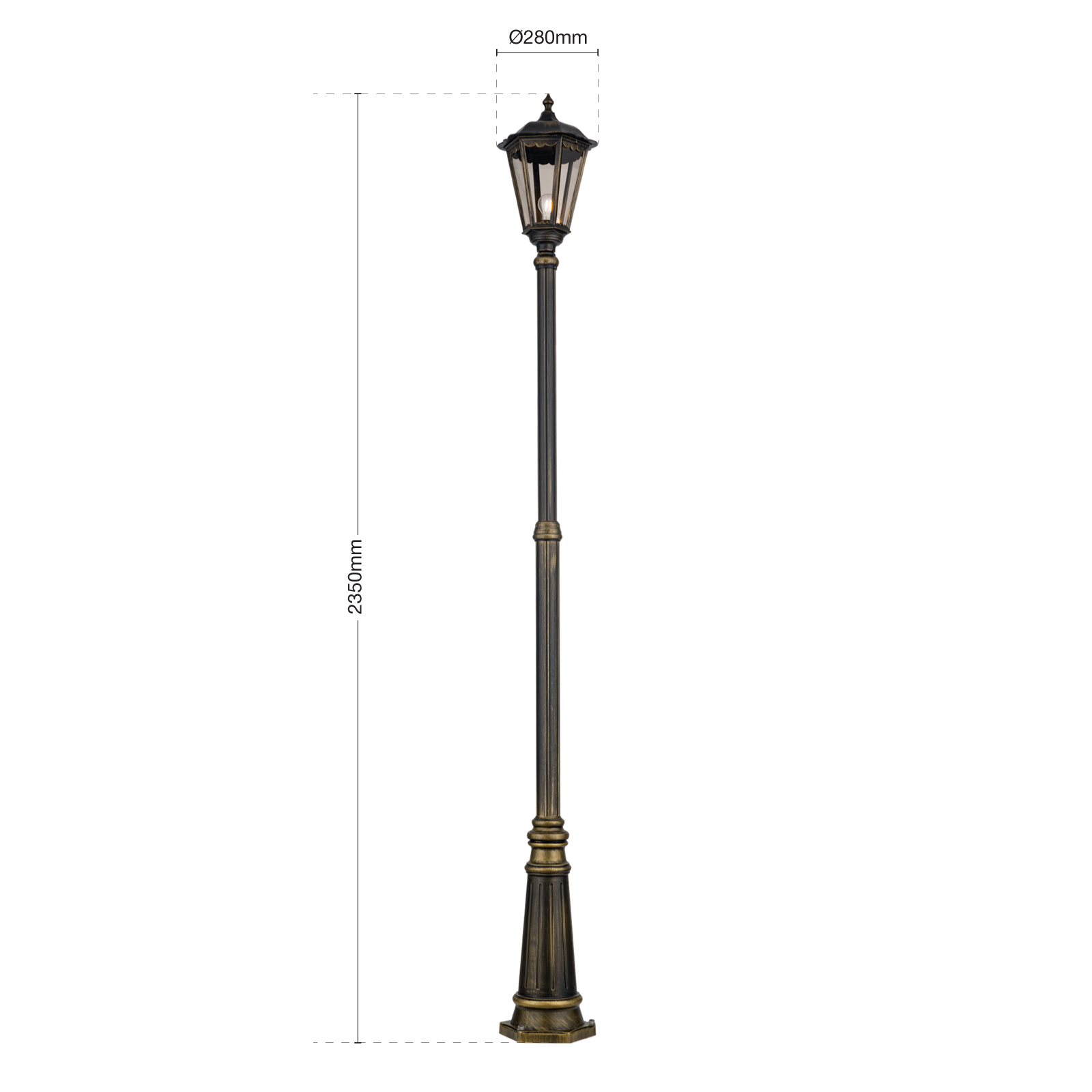 Die hohe Aussenleuchte mit Rauchglas aus unserer Leuchtenserie Kaprun ist insgesamt 2,49 Meter hoch. Die Laternenhaube ist 28 cm breit. Die dekorative Mastleuchte wird aus Siluminguss hergestellt, einer besonders widerstandsfähigen Aluminiumgusslegierung aus Aluguss in Verbindung mit Silicium. Silicium wird z.B. auch im KfZ- und Flugzeugbau als Material verwendet. Die Fenstereinsätze des sechseckigen Laternenkorpusses werden aus hochwertigem Rauchglas gefertigt. Rauchglas erfreute sich schon bereits in den sechziger Jahren in der Beleuchtung großer Beliebtheit und besticht in seiner Lichtwirkung mit eher weichen Linien. Die Aussenleuchte mit Rauchglas gehört zu unserer rustikalen Leuchtenserie Kaprun. Die stilvolle Gartenbeleuchtung kommt vom österreichischen Hersteller Orion-Leuchten und hat ein Gesamtgewicht von 10,3 Kilogramm. Wir empfehlen die dekorative Aussenleuchte insbesondere als Außenbeleuchtung für Gastronomie und andere Gewerbe. Das dekorative Leuchtendach überzeugt das Auge des Betrachters mit seiner extravaganten Form. Die schwarz-goldene Außenleuchte eignet sich als dekorative Wegbeleuchtung, als Terrassenbeleuchtung oder auch als Lichtquelle in den Beeten. Die Gartenlaterne Kaprun eignet sich mit der Schutzart IP 43 eher für etwas geschütztere Standorte.