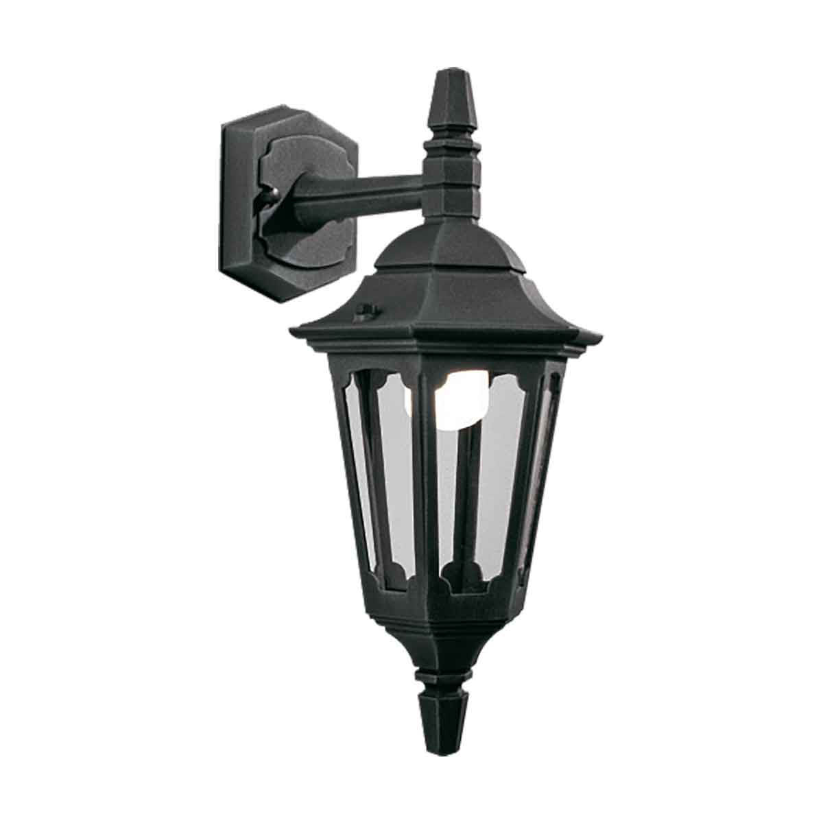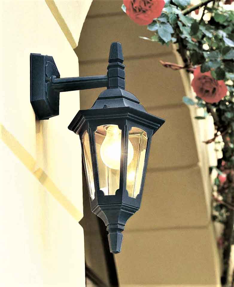 Die Außenwandleuchte rustikal aus unserer Modellserie Canterbury-Mini ist an einem dazu passenden dekorativen Wandarm aus massivem Aludruckguss befestigt. Die wetterfeste Aussenbeleuchtung überzeugt mit langlebigen Materialien und einem zeitlosen Oberflächen-Finish in der Farbe Schwarz. Die sechsseitige und in der Form eher rundliche Außenleuchte wird in England fachmännisch im Alu-Druckguss-Verfahren gefertigt. Das Gussmetall steht für eine hohe Korrosions- und Witterungsbeständigkeit. Die sechs Fenstereinsätze werden bei der Außenwandleuchte rustikal aus Klarglas gefertigt. Die stilvolle Wand-Außenbeleuchtung Modell Canterbury-Mini ist von ihren Maßen 39 cm hoch, 18 cm breit und hat insgesamt einen Wandabstand von 25 cm. Der Leuchtenkorpus ist bei der Wandlaterne abwärts ausgerichtet. Die dekorative Außenwandleuchte gibt es bei uns auch mit aufwärts gerichteter Laternenhaube. Weitere Details dazu finden Sie auch unter dem folgenden Link kleine Wandlampe rustikal. Die Leuchtenserie bietet zur Ergänzung für eine einheitliche Lichtgestaltung Ihres Außenbereichs weitere Leuchtenarten wie eine Sockelleuchte oder auch eine Wegeleuchte mit 95 Zentimeter Höhe an. Die Leuchtenserie Canterbury mit größeren Leuchtenhauben ermöglicht eine ergänzende Beleuchtung mit Mastleuchte und zweiflammigen Kandelaber. Damit lässt sich Ihr Außenbereich komplett im einheitlichen Design planen. Die Außenwandleuchte rustikal aus unserer Leuchtenserie Canterbury-Mini entspricht der Schutzart IP 44. Damit ist die Leuchte allseitig spritzwassergeschützt und regenfest. Die E 27-Lampenfassung wird mit Leuchtmitteln bis maximal 100 Watt Leistung bestückt. Wir empfehlen aus ökonomischen Gründen die Verwendung von LED-Leuchtmitteln. Leuchtmittel sind bei der Lieferung nicht enthalten. Die Lichtfarbe Warmweiß (z.B. 2700 Kelvin) sorgt dabei eher für eine stimmungsvolle Lichtatmosphäre, während die Lichtfarbe kaltweiß mehr Helligkeit erzeugt. Der englische Hersteller bietet ab Werk eine 10-jährige Antikorrosionsgarantie (sofern die Leuchte nicht innerhalb von 8 Kilometern nahe der Küstenregion montiert ist) an. Die Außenwandleuchte rustikal überzeugt optisch als auch funktional. Wer auf eine solide Verarbeitung und ein ansprechendes Design Wert legt, trifft mit dieser Leuchtenserie sicherlich eine gute Wahl. Die dekorative Außenbeleuchtung eignet sich auch sehr gut als Außenbeleuchtung für die Gastronomie und das Gewerbe. Alternativ empfehlen wir Ihnen auch unsere kleine Wandleuchte rustikal aus der Leuchtenserie Chapel-Mini.