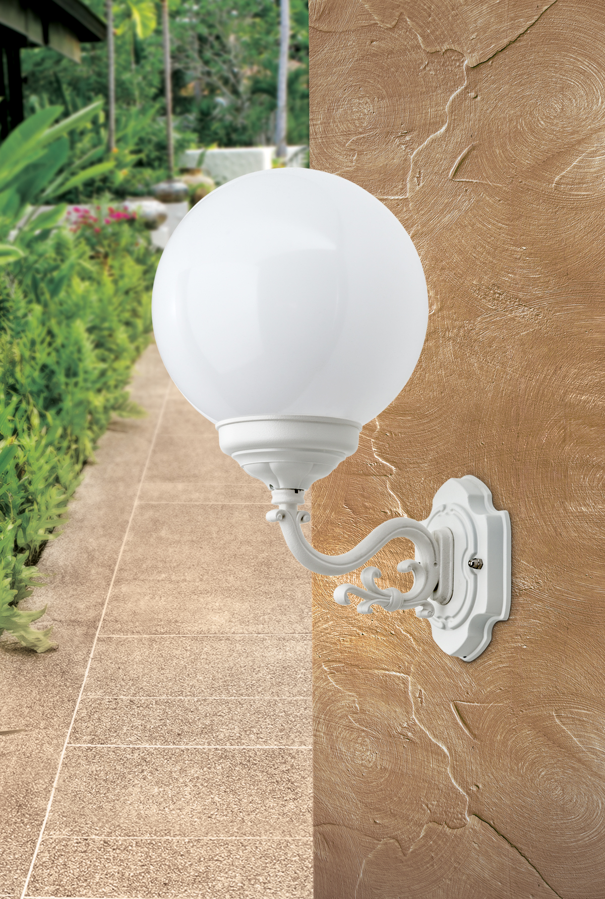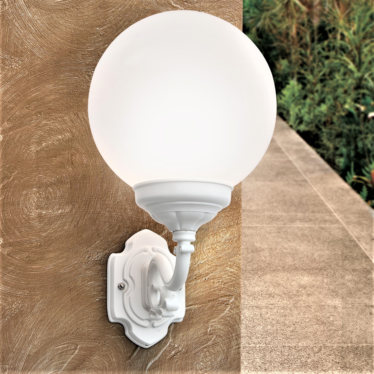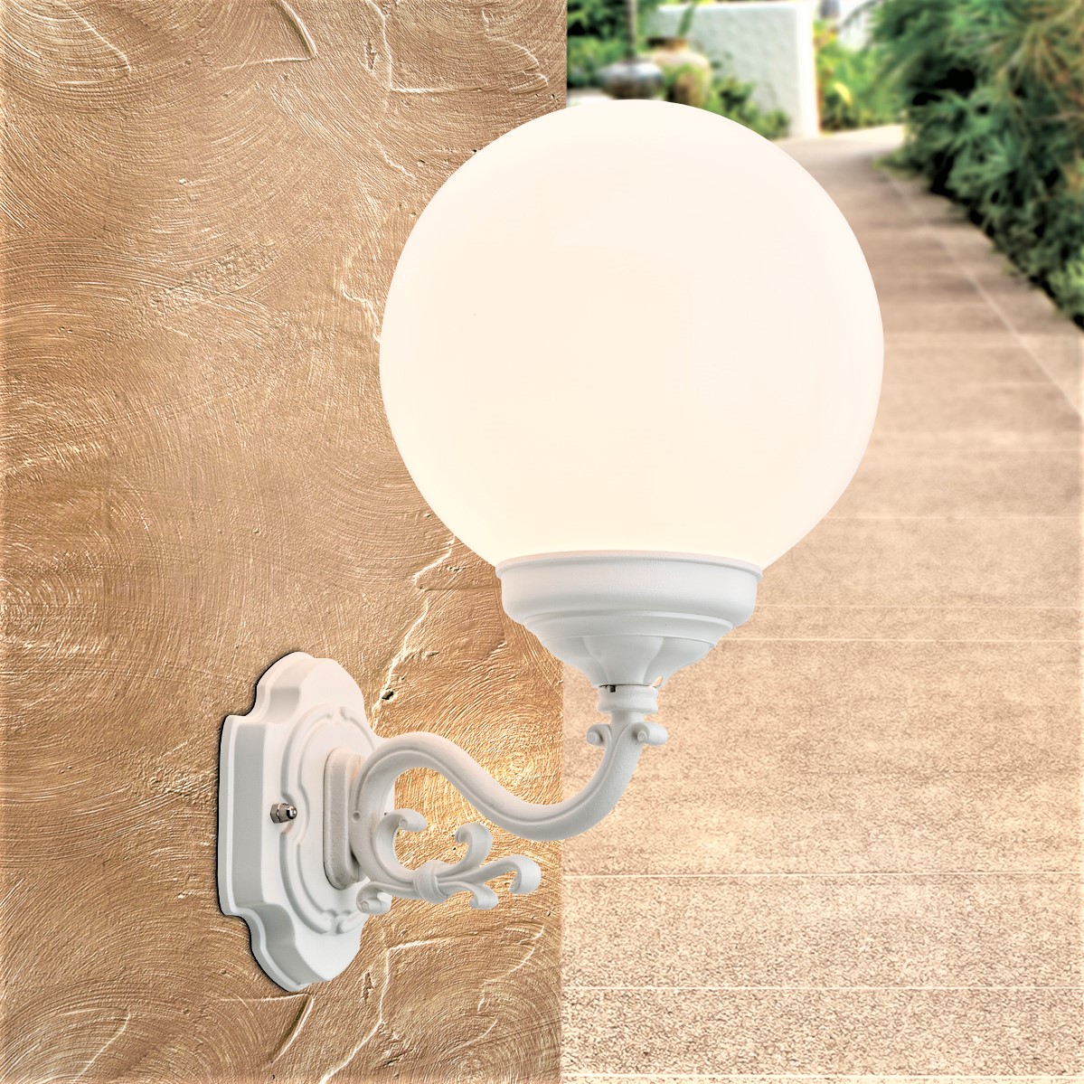 Unsere vom Stil klassisch Außenwandleuchte weiß aus der Leuchtenserie Linz überzeugt optisch mit einer klassisch weißen Kugelhaube und dem in der Form geschwungenen Wandarm mit stilvollen Verzierungen. Die Einsatzmöglichkeiten der rundförmigen weißen Gartenleuchte sind vielfältig. Die rundförmige Außenwandleuchte weiß eignet sich als dekorative Lichtquelle im Hauseingangsbereich oder auch auf der Terrasse oder im Wintergarten. Die Wandlampe passt auch sehr gut als Gastronomiebeleuchtung oder als stilvoller Lichtpunkt an Nebengelassen wie der Garage oder auch dem Gartenschuppen. Setzen Sie mit der Kugelleuchte Salzburg geschmackvolle Lichtakzente in Ihrem Außenbereich. Lassen Sie Ihre Gäste auch in der Dunkelheit gut und sicher ohne Stolperfallen an ihr Ziel kommen. Die stilvolle vom Design klassische Außenwandleuchte entspricht der Schutzart IP 43 und sollte daher eher an etwas geschützteren Standorten, zum Beispiel unter einem Dachkasten, montiert werden. Die weiße Outdoor-WandleuchteLinz ist dimmbar, auch mit einem Phasenabschnittsdimmer.