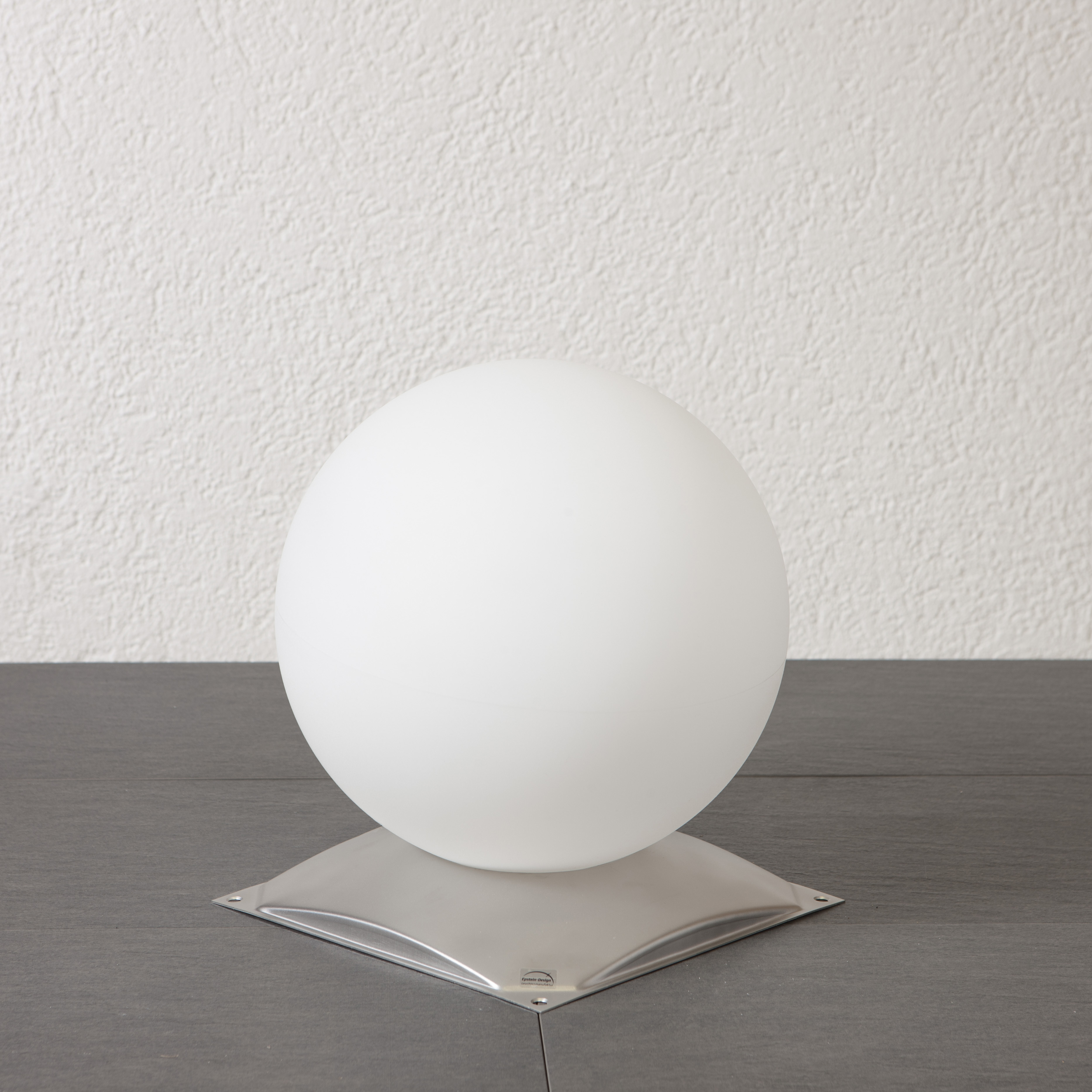 Die wetterfeste Bodenleuchte mit Edelstahlfuß hat einen Kugelhauben-Durchmesser von 30 cm. Das Gehäuse der Kugelhaube besteht aus formstabilem Polyethylen. Die von der Oberfläche weiß satinierte Kugelleuchte unserer Leuchtenserie Olymp kann mit ihrem 27x 27 cm großem quadratischem Edelstahlfuß sowohl ortsfest als auch ortsveränderlich eingesetzt werden. Die Befestigung auf festem Untergrund erfolgt dabei über die 4 vorhandenen Befestigungsbohrungen auf der Unterseite des Edelstahlfußes. Die hochwertige Bodenleuchte mit Edelstahlfuß ist UV-beständig und temperaturstabil.