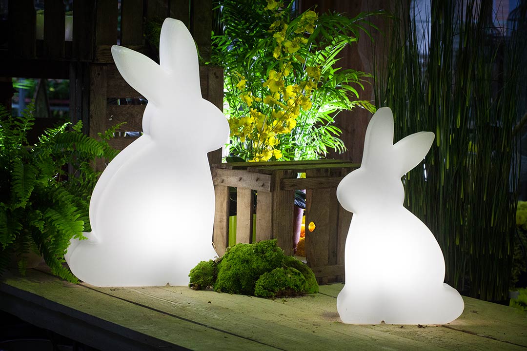 Unsere im Design moderne Deko-Aussenleuchte Rabbit begeistert nicht nur Kinder, sondern auch Erwachsene. Dank seiner verspielten, eleganten Form ist die wetterfeste Außenbeleuchtung mit Ostermotiv eine Bereicherung für jeden Garten und Vorgarten. Aber auch im Innenbereich ist die moderne Leuchte dekorativ und gut einsetzbar. Läuten Sie die Osterzeit ein und nutzen Sie den beleuchteten Hasen als kreativen Blickfang in der Osterzeit. Ob als dekorative Außenbeleuchtung zum Osterfest, als stimmungsvolles Licht auf einer (Kinder-)Party, als saisonale, einladende kreative Vorgartenbeleuchtung für Restaurants und Betriebe oder als stilvolle Akzentbeleuchtung im privaten Garten – diese wetterfeste LED-Gartenleuchte sorgt überall für eine fröhliche Atmosphäre. Dank ihres frost- und UV-beständigen Materials ist sie langlebig und bietet zahlreiche Gestaltungsmöglichkeiten. Setzen Sie mit dieser dekorative Außenbeleuchtung originelle Lichtmomente in Ihrem Außenbereich.