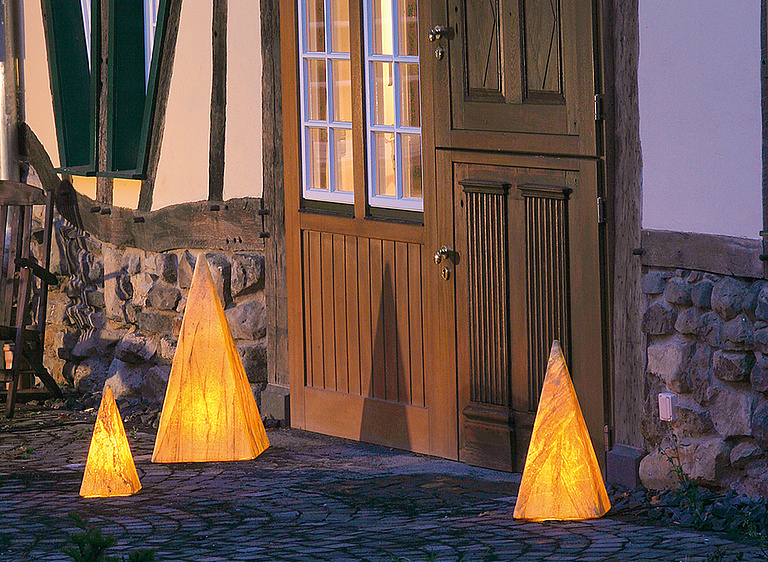 Die außergewöhnliche Design-Aussenleuchte 36cm aus unserer Leuchtenserie Dubai wird aus hochwertigen Materialien professionell in echter Handarbeit hergestellt. Das Gehäuse besteht bei der hochwertig verarbeiteten Gartenbeleuchtung aus robusten und schlagfesten Kunststoff (Polyethylen). Für die außergewöhnliche Optik sorgt eine von Hand aufgetragene Quarzsandstein-Beschichtung. Die exklusive Leuchte wurde in der Kategorie Qualität und Design bereits mit dem Plus X Award ausgezeichnet. Jede dieser Leuchten ist aufgrund der unterschiedlichen Oberflächenstrukturierung ein Unikat. Die vom Stil moderne Design-Aussenleuchte 36cm erzeugt mit moderner LED-Lichttechnologie ein blendfreies, warmfarbiges und außerordentlich stimmungsvolles Licht. Der deutsche Hersteller bietet die hochwertige LED-Lichttechnik in drei verschiedenen Varianten an. Sie wählen bei der dekorativen Pyramidenleuchte zwischen drei verschiedenen LED-Ausführungen: