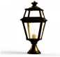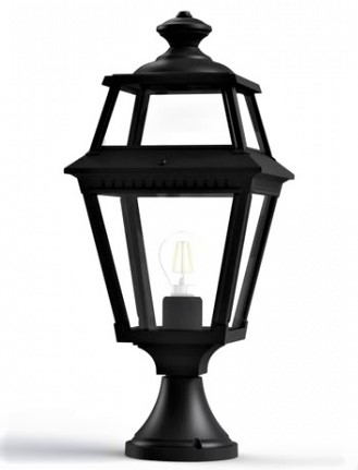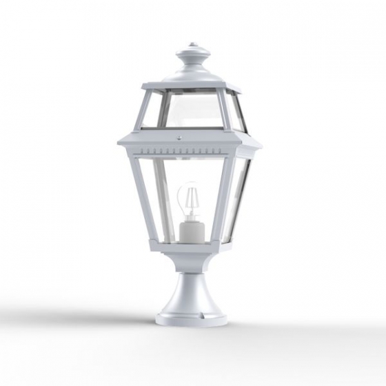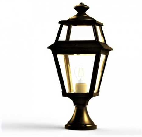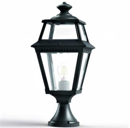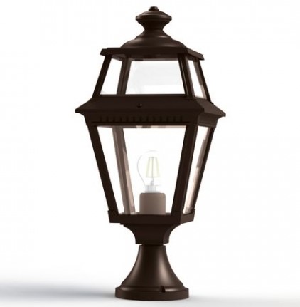 Die im Design klassische Design Sockelleuchte ist eine besonders transparente Außenbeleuchtung für vorhandene Podeste, Mauervorsprünge, Treppenabsätze oder auch Zaunpfähle. Acht trapezförmige Glaseinsätze sorgen bei der stilvollen Außenbeleuchtung aus unserer Leuchtenserie Vogese II auf zwei Ebenen für die entsprechende Lichtdurchlässigkeit und Transparenz. Die vierseitige Gartenleuchte ist hochwertig verarbeitet und von ihren Maßen 55 cm hoch und 24 cm breit. Die Design Sockelleuchte verfügt über einen rundförmigen Sockelfuß. Der rundförmige Sockelboden ist bei der Designerleuchte für Draußen im Durchmesser 14 Zentimeter groß. Die Leuchte wird fachmännisch in echter Handarbeit aus Aluminium gefertigt. Bei der exklusiven Außenleuchte stehen Ihnen je nach Geschmack und örtlichen Vorgaben bis zu 6 verschiedene Farben/RAL-Farben zur Verfügung. Damit lässt sich die dekorative Gartenbeleuchtung in vielen Bereichen und Farbumgebungen perfekt integriert platzieren. Wählen Sie bei der Designer Laternenleuchte zwischen tiefschwarz (RAL 9005), weiß, alt-rustikal (braun), grün-Patina oder gold-Patina. Die stilvolle Gartenleuchte wird auch mit einem edlen Messing-Finish angeboten. Hierbei dient schwarz lackiertes Aluminium als Basismaterial, auf das eine Messing-Patina gelegt wird, um den Messing-Finish-Effekt zu erzeugen. Der französische Hersteller gibt ab Werk auf das beschichtete Aluminium eine 25-jährige Anti-Korrosionsgarantie*. Die acht Fenstereinsätze werden aus Echtglas/ Klarglas gefertigt.
