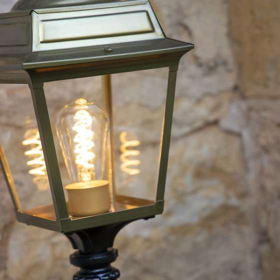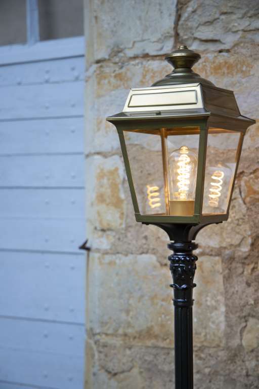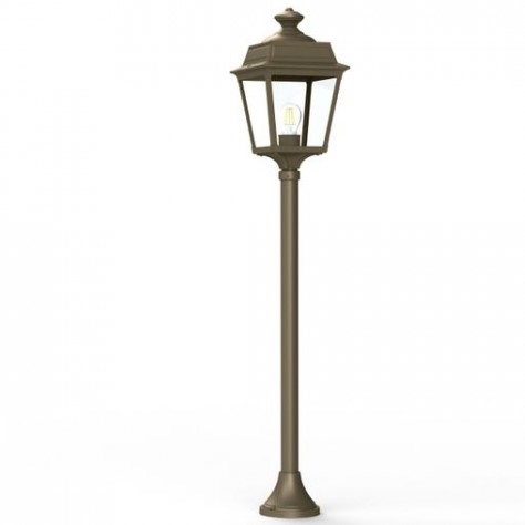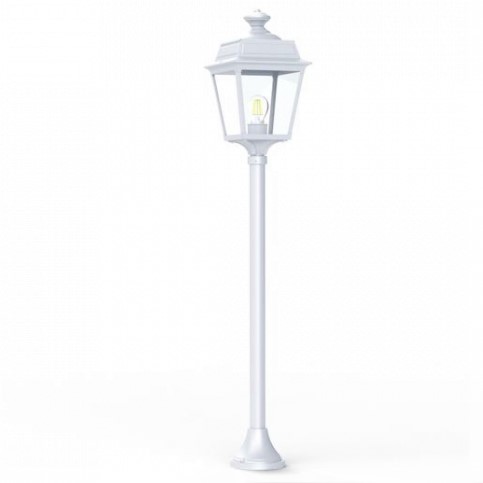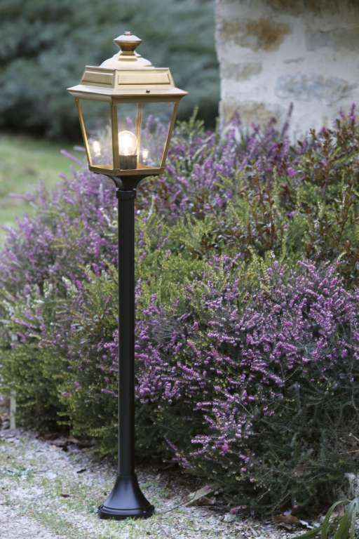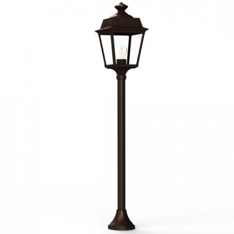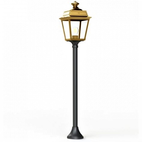 Die im Design klassisch-antike Designer Aussenleuchte 117cm Modell Vogese ist eine elegante Mastleuchte/ Wegeleuchte mit Laternenhaube. Die vierseitige Leuchtenhaube ist allein 32,9 cm hoch und 21,4 cm breit. Die antike Gartenleuchte ist hochwertig verarbeitet und von ihren Maßen insgesamt 117,2 cm hoch und 21,4 cm breit. Der Mast misst eine Länge von 79,6 Zentimetern. Die stilvolle Wegeleuchte wird in der Ausführung mit Aluminium oder wahlweise auch mit Messing angeboten. Bei der dekorativen Designer Aussenleuchte Modell Vogese stehen Ihnen je nach Geschmack und örtlichen Vorgaben bis zu 8 verschiedene Farben/RAL-Farben zur Verfügung. Wählen Sie bei der dekorativen Außenbeleuchtung zwischen tiefschwarz (RAL 9005), weiß, schiefergrau, tannengrün (RAL 6009), dunkelgrün (RAL 6009), sandsteinfarben, alt-rustikal (rostbraun), Grünspan-Patina oder goldfarbener-Patina. Der französische Hersteller gibt ab Werk auf das beschichtete Aluminium eine 25-jährige Anti-Korrosionsgarantie*. Die vier Glaseinsätze werden aus Echtglas gefertigt. Alternativ bietet der französische Hersteller Klarglas oder Mattglas (Milchglas) an. Wer es also absolut blendfrei benötigt, sollte sich bei der Glasauswahl Mattglas wählen. Die stilvolle Designer Aussenleuchte Modell Vogese entspricht der Schutzart IP 44 sowie der Schutzklasse 1. Der rundförmige Boden des Sockelfußes ist messtechnisch im Durchmesser 14 cm tief.