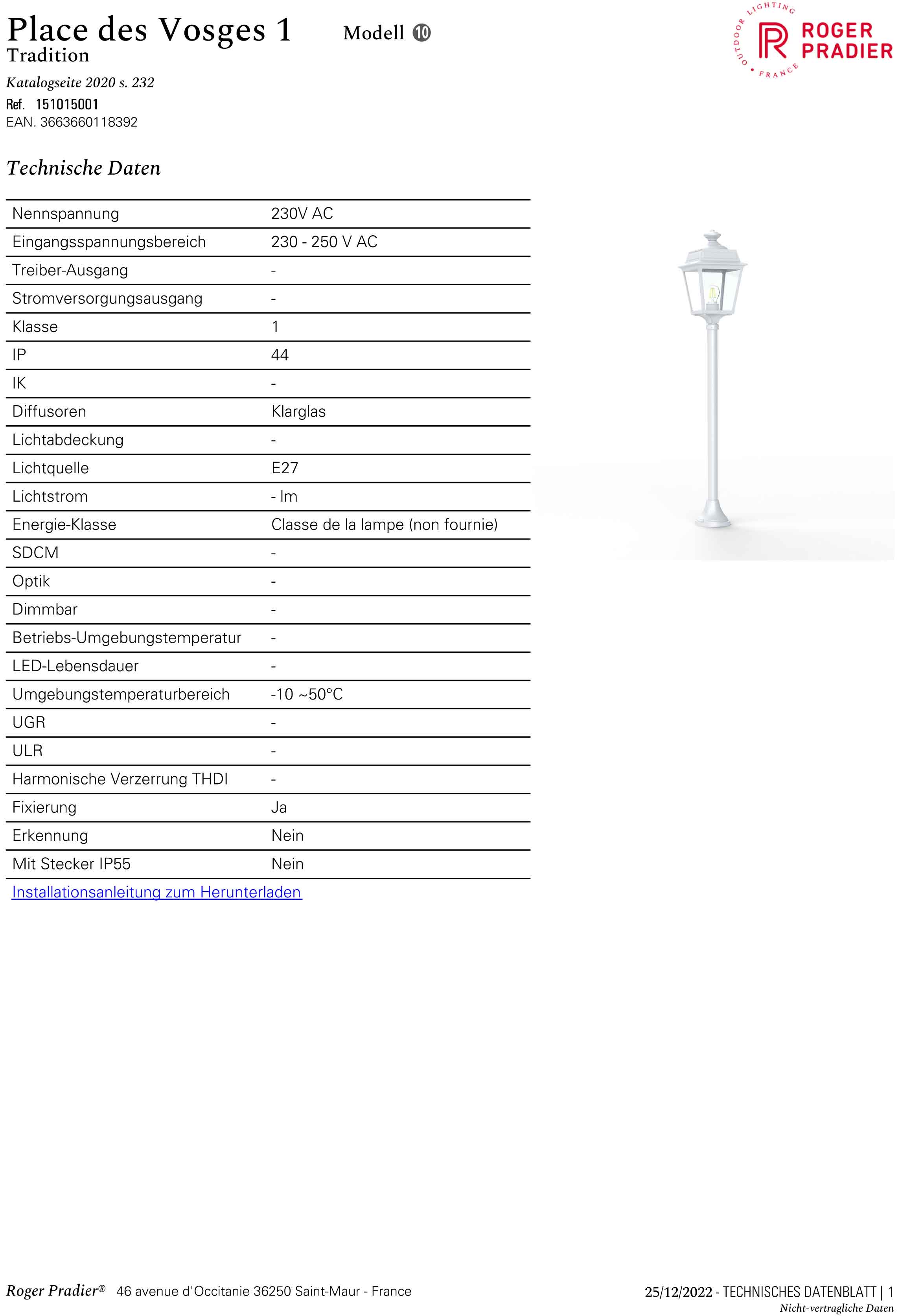 Setzen Sie mit der dekorativen Gartenbeleuchtung Vogese Ihren Eingangsbereich, Terrassenbereich, Wege und kleinere Plätze mit aufkommender Dunkelheit stilvoll in Szene. Natürlich eignet sich die Gartenbeleuchtung Vogese auch sehr gut als Gastronomie-Außenbeleuchtung. Begeistern Sie Ihre Gäste mit einer tollen und stilvollen Außenbeleuchtung. Die Designer Aussenleuchte 117cm wird mit einer E 27-Lampenfassung angeboten. Sie bestücken die klassisch-antike Wegbeleuchtung mit Leuchtmitteln bis zu 1055 Watt Leistung. Leuchtmittel sind bei der Lieferung nicht enthalten. Wir empfehlen bei unseren Laternenleuchten mit Klarglas aus optischen Gründen auch die Bestückung mit sogenannten Retro-Leuchtmitteln. Warmweißes Licht sorgt eher für eine angenehm wohlige Lichtatmosphäre. Kaltweißes Licht erzeugt dagegen mehr Helligkeit. Setzen Sie mit dieser tollen Leuchte im Außenbereich dekorative Lichtakzente. Alle Leuchten des Herstellers Roger Pradier verlassen die Manufaktur mit einer zusätzlichen technischen Garantie von 3 Jahren. Weitere Leuchtenarten wie eine Outdoor-Hängeleuchte, Wandlaternen und Sockelleuchten sowie auch eine zweiflammige Mastlaterne runden das Leuchtensortiment der Modellserie Vogese ab. Befestigungsmaterial für die Montage ist bei der Lieferung inklusive. Wir empfehlen Ihnen alternativ auch die Laternen-Sockelleuchte mit einer Gesamthöhe von 61,6 cm. Die Laterne weist hierbei aber die gleiche Haubengröße auf und lässt sich perfekt mit der Wegeleuchte kombinieren.