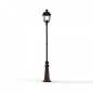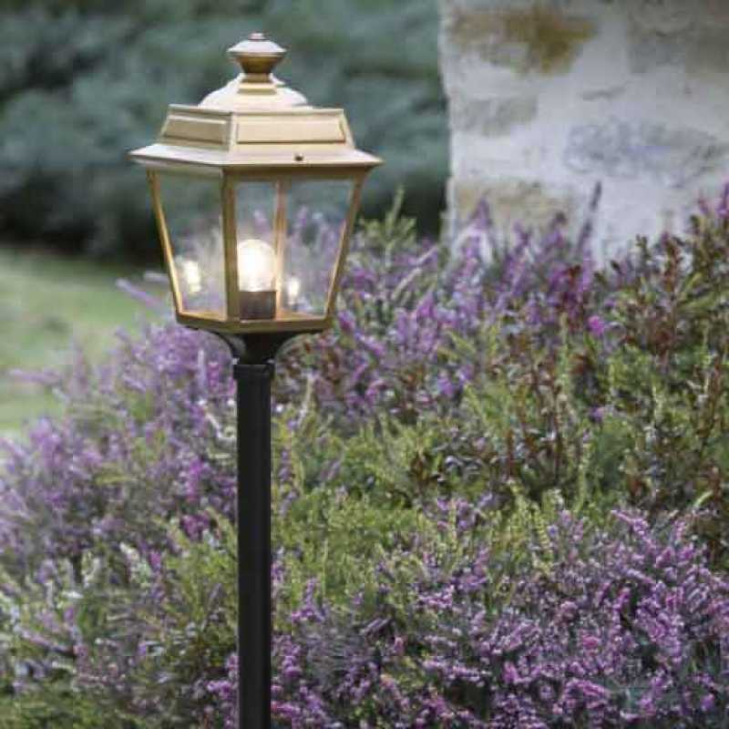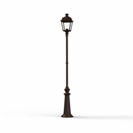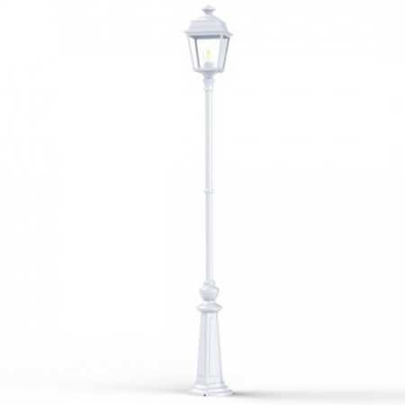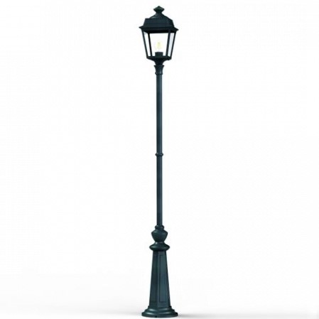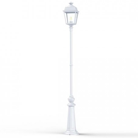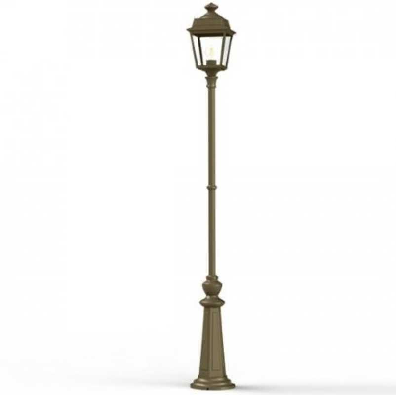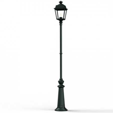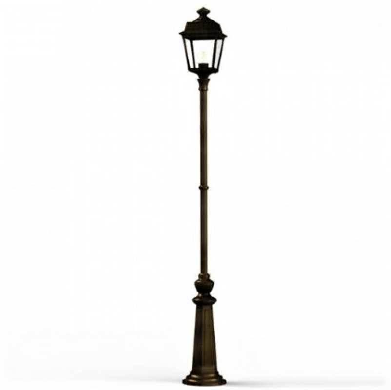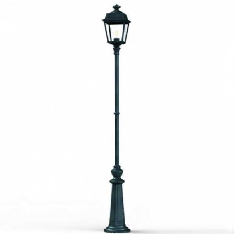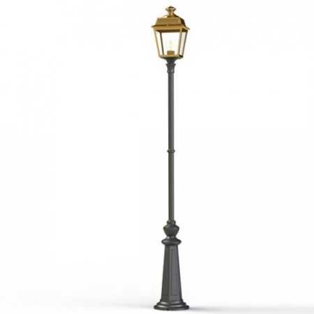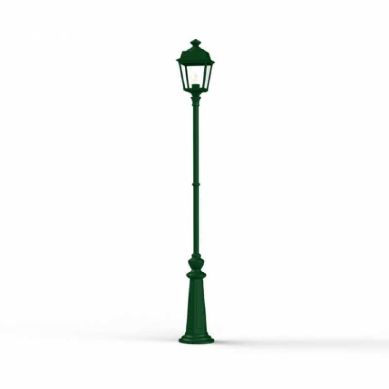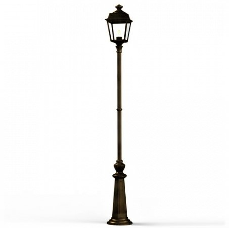 Die im Design klassisch-antike Designer Aussenleuchte 197cm Modell Vogese ist eine elegante Mastleuchte/ Wegeleuchte mit Laternenhaube. Die vierseitige Leuchtenhaube ist allein 32,9 cm hoch und 21,4 cm breit. Die antike Gartenleuchte ist hochwertig verarbeitet und von ihren Maßen insgesamt 196,7 cm hoch und 21,4 cm breit. Das untere Sockelelement weist allein eine Höhe von 57 Zentimetern aus. Der Mast weist einen Durchmesser von 3,5 cm aus. Der rundförmige Boden des Sockelfußes ist messtechnisch im Durchmesser 23 cm tief. Die Mastleuchte im klassisch-antiken Design ist im Sockelbereich von dekorativen Verzierungen geprägt, ebenso die Laternenhaube. Die stilvolle Mastlaterne wird hier in der Ausführung mit Aluminium oder wahlweise auch mit Messing angeboten. Bei der dekorativen Designer Aussenleuchte Modell Vogese stehen Ihnen je nach Geschmack und örtlichen Vorgaben bis zu 8 verschiedene Farben/RAL-Farben zur Verfügung. Wählen Sie bei der dekorativen Außenbeleuchtung zwischen tiefschwarz (RAL 9005), weiß, schiefergrau, tannengrün (RAL 6009), dunkelgrün (auf Anfrage), sandsteinfarben, alt-rustikal (rostbraun), Grünspan-Patina oder goldfarbener Patina. Der französische Hersteller gibt ab Werk auf das beschichtete Aluminium eine 25-jährige Anti-Korrosionsgarantie*. Die vier Glaseinsätze werden aus Echtglas gefertigt. Alternativ bietet der französische Hersteller Klarglas oder Mattglas (Milchglas) an. Wer es also absolut blendfrei benötigt, sollte sich bei der Glasauswahl Mattglas wählen. Die stilvolle Designer Aussenleuchte Modell Vogese entspricht der Schutzart IP 44 sowie der Schutzklasse 1.