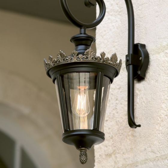 Die im Design königliche Designer Aussenleuchte am Bischofsstab gehört zu unserer Leuchtenserie Louvre. Die rundförmige Wandlaterne macht mit ihrem Kronenkranz auf dem Baldachin ihrem Namen alle Ehre. Die sich nach unten in ihrer Form verjüngende Laternenleuchte hängt hier an einem spiralförmig geschwungenen Wandarm, dem sogenannten Bischofsstab. Die exklusive gedrehte Metallkuppel auf dem Leuchtendach bildet den oberen Abschluß des Leuchtenkorpusses. Am unteren Ende ziert ein pinienzapfähnliches Element den Boden der Leuchtenhaube. Längliche Zierstreben ergänzen die Wandlaterne zum perfekten Design. Die stilvolle Wandlaterne erinnert an die Renaissance, die zu den schillernsten Zeitepochen der Menschheit zählt. Würdevoll spendet die hängende Laterne ein umlaufendes Licht in alle Richtungen. Die wetterfeste Außenwandleuchte ist hochwertig verarbeitet und von ihren Maßen 77,4 Zentimeter hoch, 28,8 Zentimeter breit und 40,8 Zentimeter tief. Die Maße der Wandbefestigung betragen H 14 cm x B 11,4 cm.