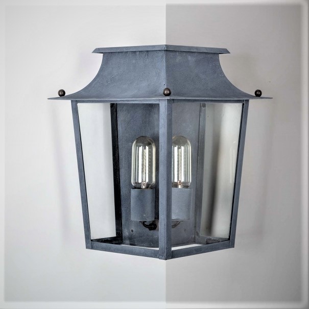 Die Eck-Aussenleuchte Modell Passy wird hier in der Ausführung mit Zink angeboten. Die dekorative Außenleuchte ist auf Anfrage gern auch in Messing oder auch Nickel mit verschiedenen Finishes erhältlich. Weitere exklusive Oberflächen-Finishes finden Sie unter dem Link Finishes. Bei der in echter Handarbeit gefertigte Eck-Außenwandleuchte wird für die Fenstereinsätze Echtglas verarbeitet. Die Designer-Wandleuchte offeriert mit ihrem Finish in Alt-Zink nach außen echt französichen Charme. Die Schlichtheit der Linien, die von zarten Messingkugeln unterstrichen wird, macht die Passy-Kollektion zu einem großen Klassiker. Das besondere Design findet seine Inspiration im 19. Jahrhundert. Die Eck-Aussenleuchte Modell Passy lässt sich sehr gut mit einer Vielzahl von architektonischen Stilen kombinieren. Die vom Design antik bis zeitlose Außenwandleuchte zählt zu einer Leuchtenart, wo es eher eine etwas begrenztere Auswahl an Leuchtenmodellen gibt. Wer als Hausbesitzer die Außenbeleuchtung einer freistehenden Immobilie plant, kommt aber um die Lichtplanung an den Hausecken in der Regel nicht vobei. Die stilvolle Eck-Aussenleuchte strahlt ihr Licht in zwei Fassadenrichtungen aus. Ein entsprechender seitlicher Stromanschluß sollte vorhanden sein. Die Wandleuchte für Hausecken/Gebäudeecken aus unserer Leuchtenserie Passy lässt sich perfekt mit einer vom Style dazu passenden Außenwandleuchte für andere Hausbereiche wie zum Beispiel im Terrassenbereich oder am Hauseingang direkt ergänzen. Sprechen Sie uns bei Bedarf gern darauf an.
