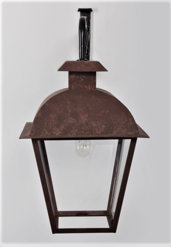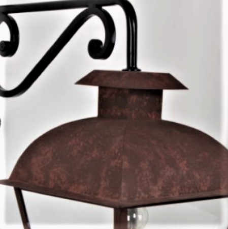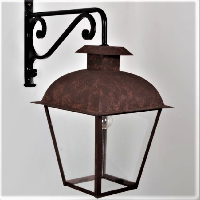 Das Leuchtenmodell exklusive Vintagelampe 49cm gehört zur Leuchtenkollektion Commanderie. Die am Wandarm hängende antike Wandlampe in Laternenform überzeugt mit klaren Linien und Formen. Die Aussenwandleuchte wird in einer französischen Manufaktur aus massivem Zink hergestellt und dekorativ im Finish Alt-Rost oberflächenbehandelt. Das Finish versiegelt dabei die Rostoberfläche ohne den Rost zu zerstören und bildet einen Schutzfilm. Die hängende Laterne (ohne Wandarm) der exklusiven Vintagelampe ist 49 cm hoch und ist 36 cm breit.