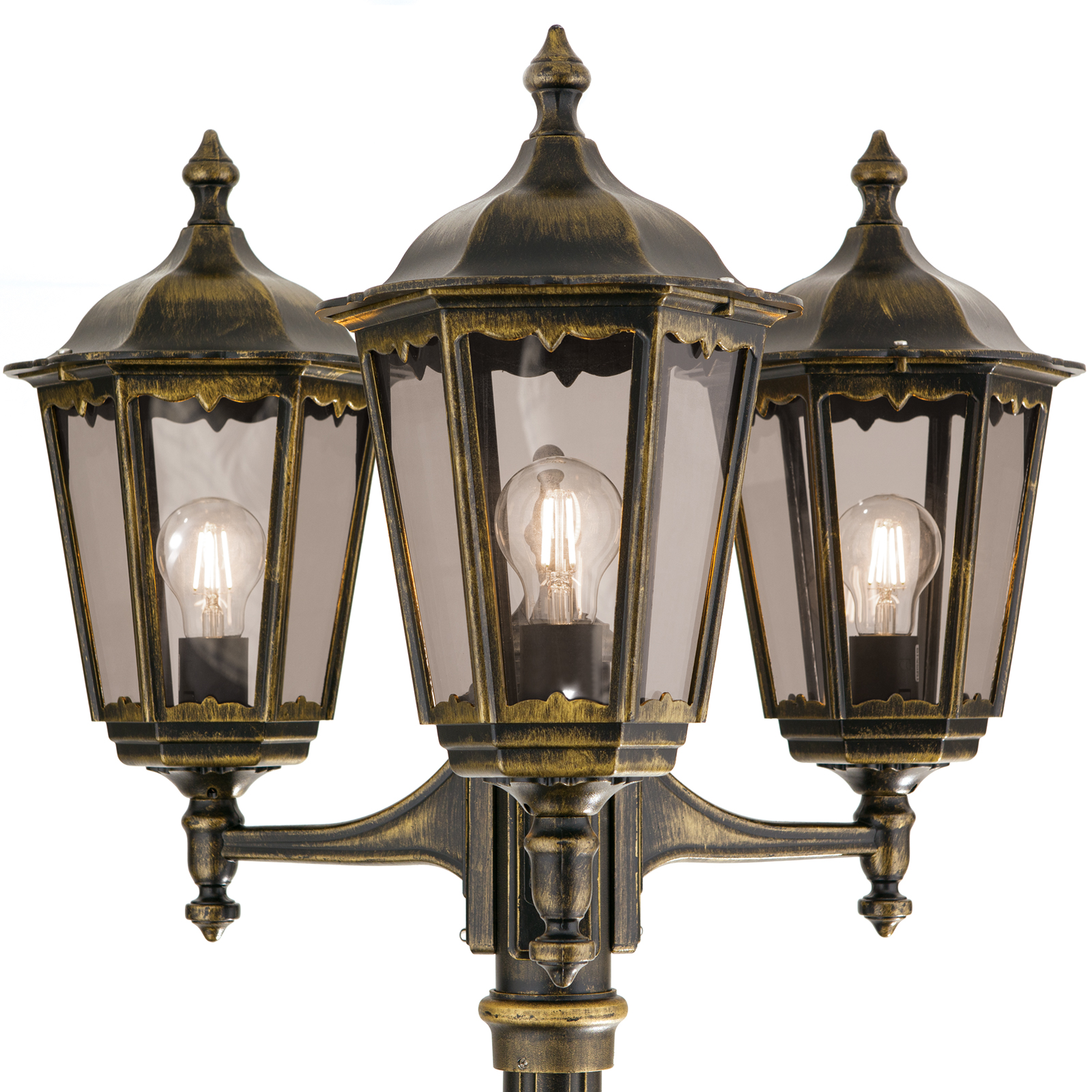 Weitere Maßangaben zum Kandelaber: Sockel-Durchmesser: 23 cm bzw 26 cm, Sockelhöhe: 6,10 cm, Glaseinsatz (Laternenhaube): oben 8,5 cm breit, unten 5,5 cm breit, Höhe der einzelnen Laternenhaube 46 cm. Der gusseiserne Garten-Kandelaber Kaprun eignet sich daher auch für Örtlichkeiten mit weniger Platz. Die hochwertige Gartenbeleuchtung 3-flammig eignet sich insbesondere als ergänzende Außenbeleuchtung für den altdeutschen Archtitekturstil. Setzen Sie mit dem Kandelaber aus unserer Modellserie Kaprun stilvoll tolle Lichtakzente in Ihren Außenanlagen. Die schwarz-goldfarbene Außenleuchte mit sechsseitigen Leuchtenhauben eignet sich gut als Wegbeleuchtung, als Terrassenbeleuchtung oder auch mal als kreative Beetbeleuchtung für die abendliche Ausleuchtung dunkler Ecken.
