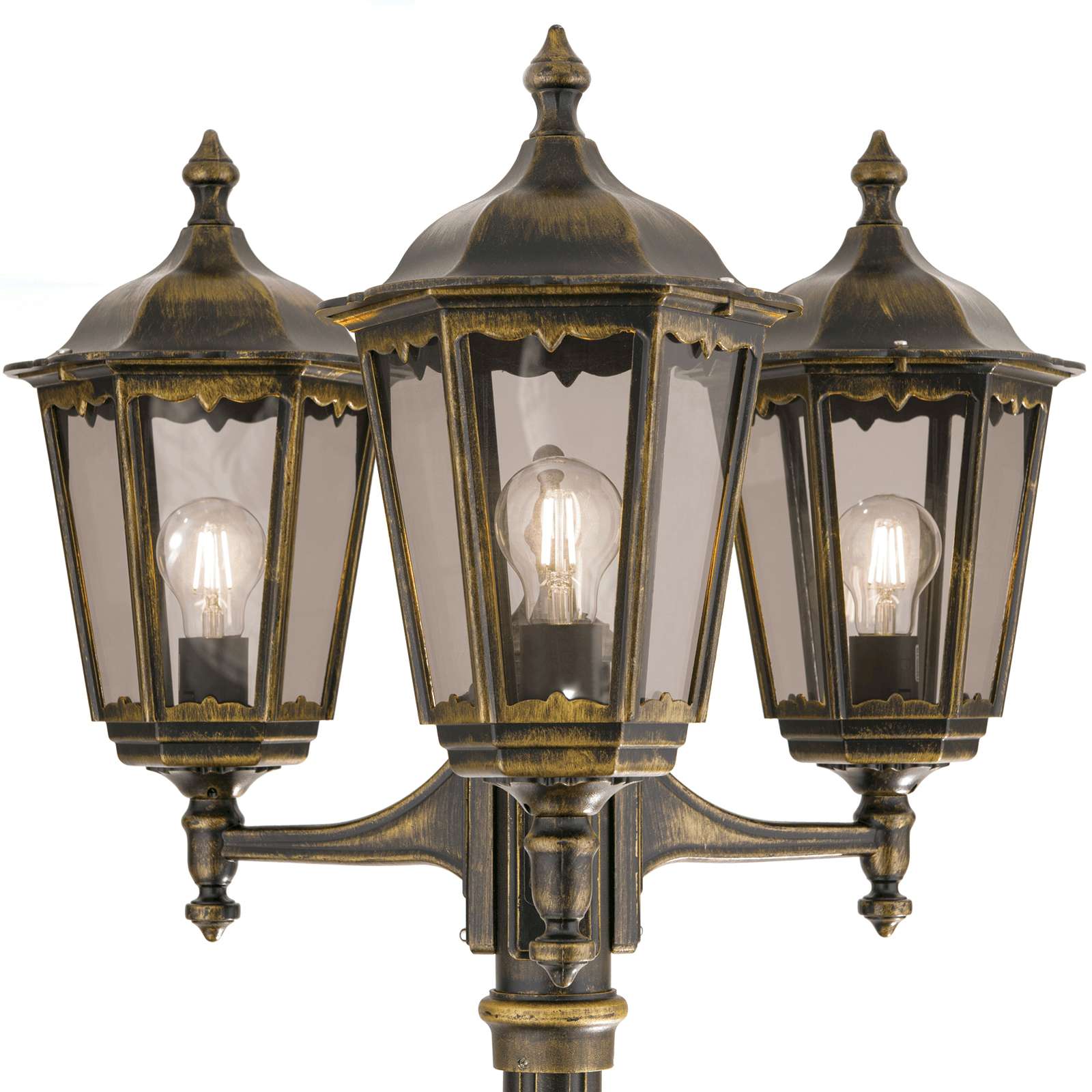 Die qualitativ hochwertige 3-flammige Gartenlaterne eignet sich insbesondere als ergänzende Außenbeleuchtung für den altdeutschen Archtitekturstil. Setzen Sie mit dem Kandelaber aus unserer Modellserie Kaprun stilvoll tolle Lichtakzente in Ihren Außenanlagen. Die schwarz-goldfarbene Außenbeleuchtung mit sechsseitigen Leuchtenhauben eignet sich gut als Wegbeleuchtung, als Terrassenbeleuchtung oder auch mal als kreative Beetbeleuchtung für die abendliche Ausleuchtung dunkler Ecken.