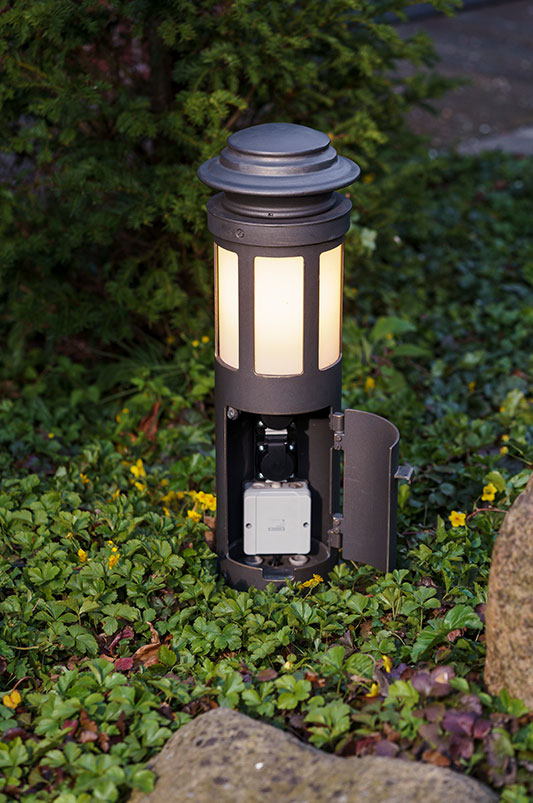 Die dekorative Gartensteckdose mit Licht gehört zu unserer Leuchtenserie Florenz. Das zeitlose bis klassische Design fügt sich sehr gut in eine moderne Architektur ein, passt aber auch sehr gut zu einem historischem Gebäude oder auch dem heute sehr beliebten Landhausstil. Die Pollerleuchte mit zwei unsichtbar integrierten Steckdosen ist die ideale Ergänzung für jeden Garten, wo immer wieder mal extern eine Stromquelle benötigt wird. Hierbei wird einfach eine Klappe geöffnet, Stecker rein und Klappe zu- das Kabel findet unten durch eine smarte Öffnung seinen Weg nach draußen- auch bei geschlossener Klappe. Die hochwertige Säulenleuchte mit echten Opalglaseinsätzen sorgt mit ihrer rundlich länglichen Form nicht nur für eine optimale Beleuchtung in Ihrem Außenbereich, sondern bietet auch die Möglichkeit einer nach außen nicht sichtbaren Stromquelle. Die Gartensteckdose mit Licht zeigt optisch schmiedeeiserne Längsstreben und Rundornamente am unteren und am oberen Ende der Leuchte, die dieser stilvollen Sockelleuchte mit Steckdosen ihre ganz eigene Note geben. Das Finish in Alt Bronze verleiht der dekorativen Gartensteckdose mit Licht einen klassisch-historischen und zugleich modernen Look, der sich harmonisch in jede Umgebung einfügt. Die hochwertigen Materialien feuerverzinkter Stahl und Aluminium sorgen für Langlebigkeit und Widerstandsfähigkeit gegen Witterungseinflüsse. Die Gartensteckdose mit Licht ist von ihren Maßen 60 cm hoch und 20 cm breit. Das Gesamtgewicht beträgt bei dieser Qualitätsleuchte 11 kg. Die Garten Steckdosensäule gibt es auch in weiteren Finishes wie Terra, Eisen natur, Taverna, schwarz, schwarz-silber, Patina, Alt-Kupfer, Vintage, grün-antik und Steampunk. Die handgefertigte Unikatsleuchte wird in einer deutschen Leuchtenmanufaktur fachmännisch hergestellt. Die E27-Lampenfassung wird bei der exklusiven Gartenleuchte mit Leuchtmitteln bis zu 100 Watt Leistung bestückt. Leuchtmittel sind bei der Lieferung nicht enthalten. Diese schmiedeeiserne Designer-Außenleuchte lässt sich auch perfekt mit anderen Leuchten der Modellserie Florenz kombinieren. Schauen Sie doch mal nach der exklusiven Wegeleuchte klassisch zur Kombination im gleichen Design und mit gleicher Größe, aber ohne integrierte Steckdosen.