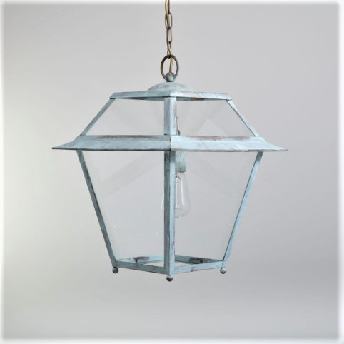 Die Hängeleuchte Landhausstil 42cm aus der Modellserie Pont Neuf hat ihre Wurzeln in einer französischen Manufaktur in der Nähe von Paris. Die Laternenleuchte überzeugt als Deckenleuchte mit Transparenz und klaren Linien. Die Hängelaterne mit Grünspan-Optik passt in den Treppeneingangsbereich oder auch im Vordachbereich als stilvolle Aussenbeleuchtung mit nostalgischem Flair. Patina bezeichnet korrekt den natürlichen Vorgang der Verwitterung von Messing-und Kupferlegierungen durch Umwelteinflüsse. Bei dieser Leuchte wird dieser Effekt unter künstlerischen Aspekten mit besonderen Techniken künstlich erzeugt. Die Hängeleuchte Landhausstil aus der Kollektion Pont Neuf ist von ihren Maßen 42 cm hoch und 38 cm breit. Die Aufhängung der nostalgischen Hängeleuchte erfolgt mit Hilfe einer 60 cm langen Kette. Sowohl die Kette als auch die Deckenvorrichtung sind bei uns bei der Lieferung inklusive.