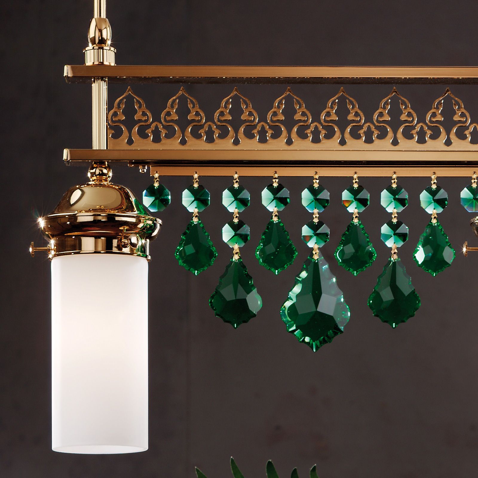 Die aufwendig gestalteten Messing-Verzierungen im klassischen Orient-Stil rahmen die drei sanft leuchtenden opal-matten Glasschirme ein. Die darunter hängenden grünen Kristallpendel reflektieren das Licht auf faszinierende Weise und verleihen jedem Raum eine exklusive Note.