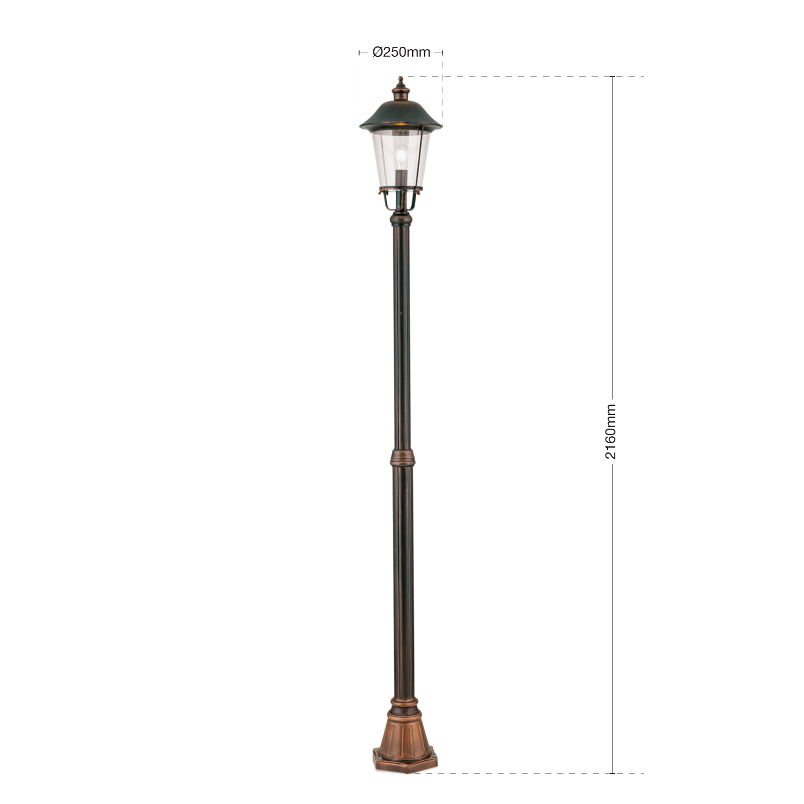 Die hohe Wegeleuchte 216cm gehört zu unserer Leuchtenserie Sizilia und eignet sich als Hoflaterne, als dekorative Parkplatzbeleuchtung, stilvolle Wegbeleuchtung oder auch als schöne Lichtquelle im Terrassenbereich. Die einflammige Mastleuchte ist 2,16 Meter hoch. Der Laternenenkorpus hat einen Durchmesser von 25 Zentimetern. Die vom Design antik-klassische Gartenbeleuchtung sorgt mit ihrer schwarz-kupferfarbenen Oberfläche und der rundförmigen Laterne für ein stilistisch klassisch-antik bis nostalgisches Flair. Sie haben in der Leuchtenserie Sizilia die Möglichkeit, entsprechend passend andere Leuchtenarten wie eine Wandleuchte, Sockelleuchte oder auch einen drei-flammigen Kandelaber für eine einheitliche Außenbeleuchtung zu ergänzen. Klicken Sie gern bei Bedarf auf den folgenden Link Klassische Gartenlaternen.