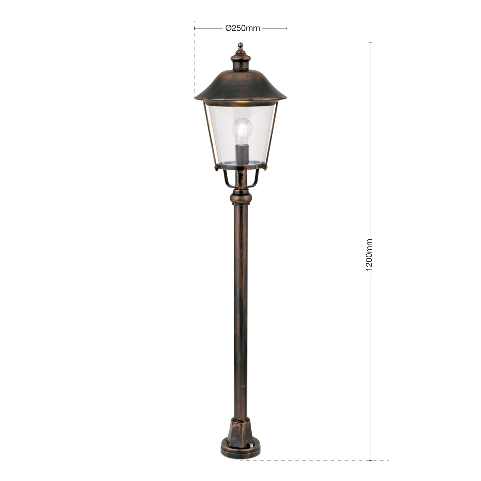 Die klassische Gartenlaterne 120cm aus unserer Leuchtenserie Sizilia ist von ihren Maßen 1,20 Meter hoch. Der Leuchtenkorpus hat einen Durchmesser von 25 Zentimetern. Die stilvolle Sockelleuchte entspricht der Schutzklasse 1. Die vom Design antik-rustikale Gartenleuchte bringt mit ihrer schwarz-kupferfarbenen Oberfläche und der rundförmigen Laterne ein klassisch-antik bis rustikales Flair in Ihren Außenbereich. Integrieren Sie die klassische Gartenlaterne 120cm als dekorative Lichtquelle im vorderen Hausbereich, als Parkplatzbeleuchtung, Terrassenbeleuchtung oder auch als stilvolle Wegeleuchte. Die stilvolle Gartenbeleuchtung wird aus Siluminguss hergestellt, einer besonders widerstandsfähigen Aluminiumgusslegierung aus massivem Aluguss und Silicium. Die Leuchtenhaube besteht bei der Wegeleuchte aus hochwertigem Acrylglas in der Ausführung Klarglas. Die Außenbeleuchtung Sizilia entspricht der Schutzart IP 44. Die Leuchte Sizilia ist selbst nicht dimmbar.