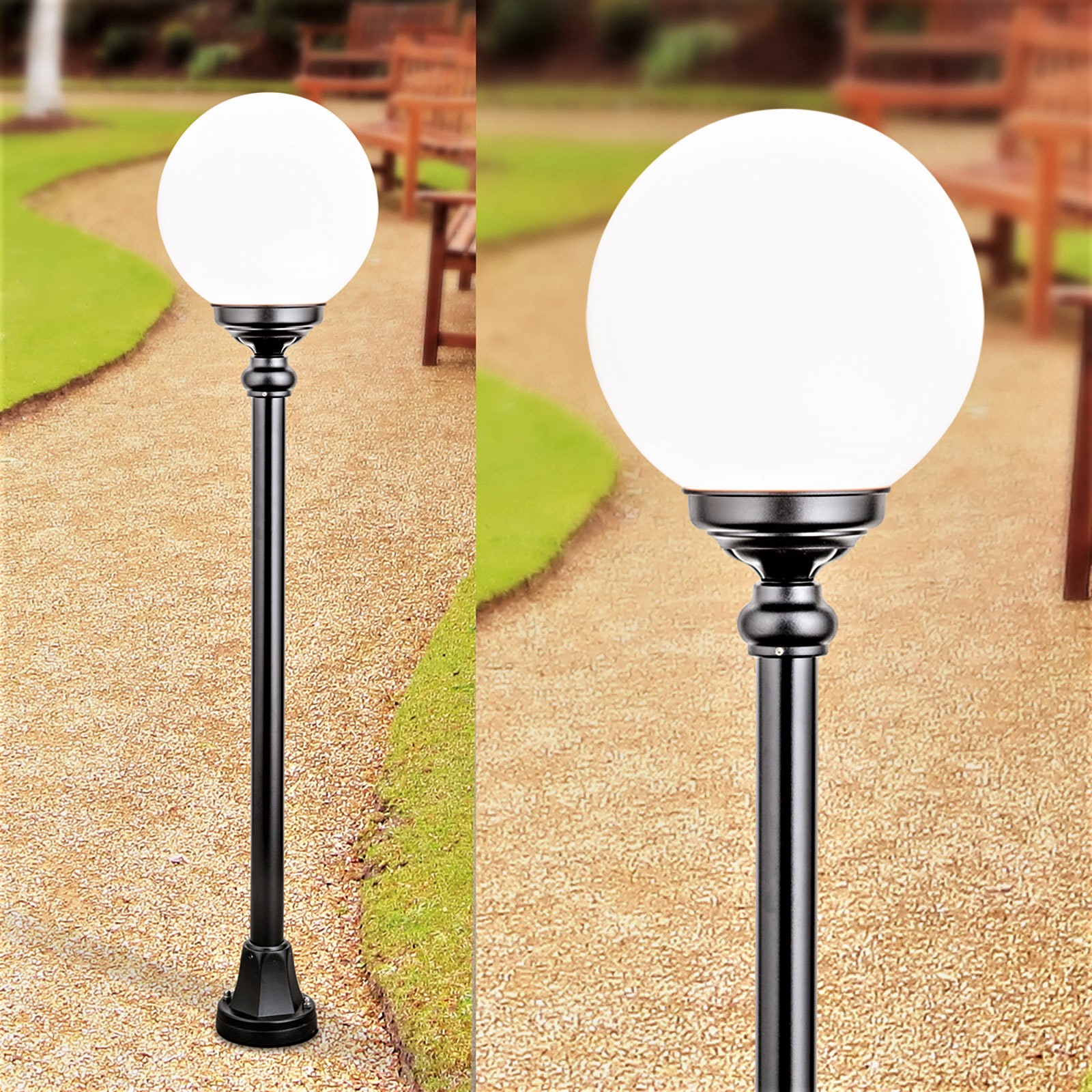 Unsere klassische Gartenleuchte aus der Leuchtenserie Salzburg überzeugt optisch mit einer klassisch weißen Kugelhaube und dem dazu farblich dekorativ im farblichen Kontrast stehenden schwarzen Sockelfuß. Die Einsatzmöglichkeiten der rundförmigen Gartenleuchte sind vielfältig. Die rundförmige Außenbeleuchtung eignet sich als Wegbeleuchtung, als Außenbeleuchtung für Podeste, Mauerabsätze, Treppenabsätze oder auch sehr gut als Gastronomiebeleuchtung für Außen. Setzen Sie mit der Kugelleuchte Salzburg geschmackvolle Lichtakzente in Ihrem Außenbereich. Lassen Sie Ihre Gäste auch in der Dunkelheit gut und sicher ohne Stolperfallen an ihr Ziel kommen. Neue Gäste sollen sich schließlich auch mit aufkommender Dämmerung gut bei Ihnen zurechtfinden. Die stilvolle vom Design klassische Gartenleuchte aus unserer Leuchtenserie Salzburg entspricht der Schutzart IP 43 und sollte daher eher an etwas geschützteren Standorten montiert werden.