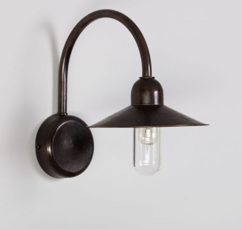 Die klassische Hofleuchte aus unserer französischen Leuchtenkollektion Normandy gehört mit einer Höhe von 22 cm eher zu den kleineren Aussenwandleuchten des französischen Herstellers Lumart. Aufgrund ihrer Größe lässt sich diese Aussenbeleuchtung an Orten platzieren, wo viele andere Hoflampen zu groß oder von der optischen Wirkung zu wuchtig sind. Die 25 cm tiefe Aussenleuchte besteht aus den Materialien Messing und Echtglas. Messing ist eine Kupferlegierung und reagiert daher im Freien auf der Oberfläche aufgrund von Umwelteinflüssen. Der Leuchtenkorpus ist im Durchmesser 15 cm groß. Platzieren Sie die klassische Hofleuchte für ein symetrisches Erscheinungsbild zum Beispiel beidseitig im Haustürbereich oder auch im Terrassenbereich.