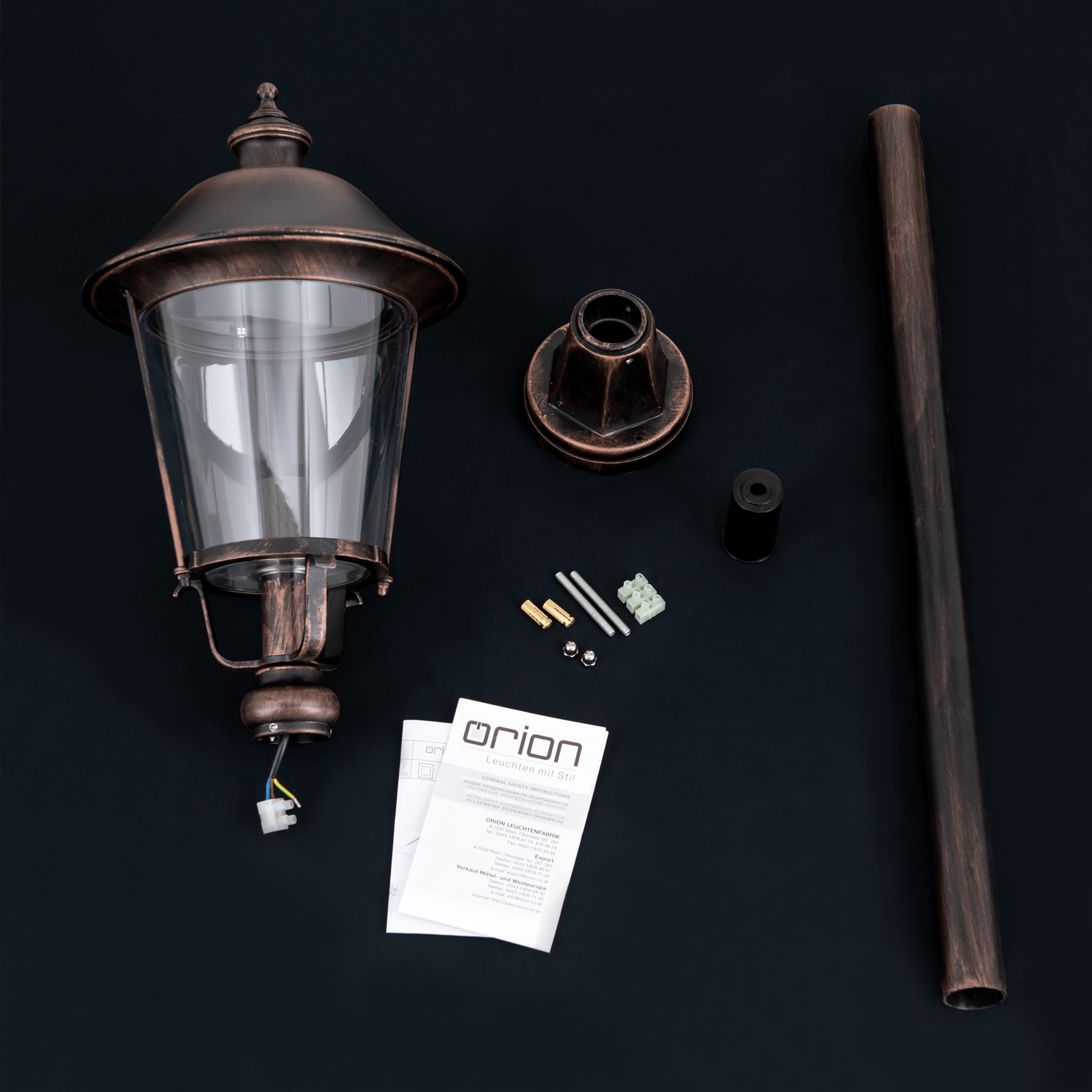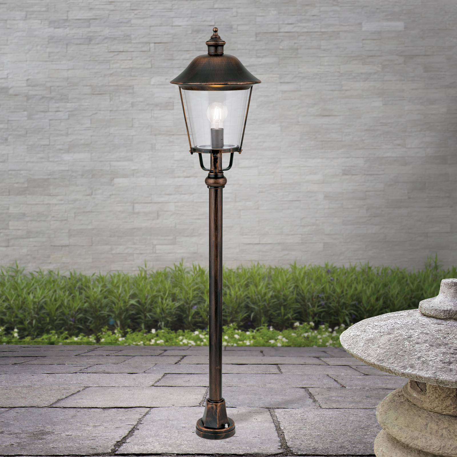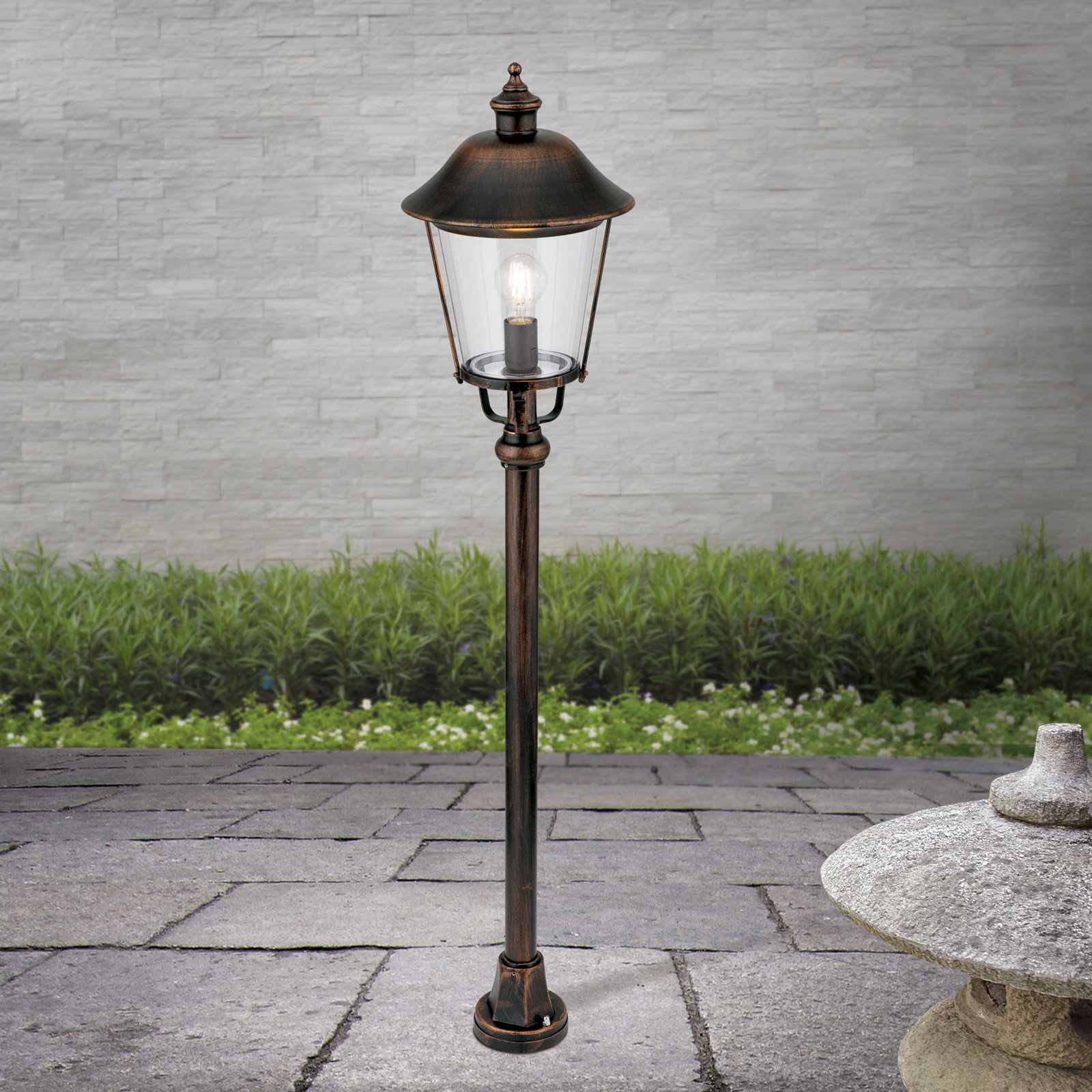 Die klassische Sockelleuchte 120cm aus unserer Leuchtenserie Sizilia ist von ihren Maßen 1,20 Meter hoch. Der Leuchtenkorpus hat einen Durchmesser von 25 Zentimetern. Die vom Design antik-rustikale Gartenleuchte bringt mit ihrer schwarz-kupferfarbenen Oberfläche und der rundförmigen Laterne ein klassisch-antik bis rustikales Flair in Ihren Außenbereich. Integrieren Sie die klassische Sockelleuchte 120cm als dekorative Lichtquelle im vorderen Hausbereich, als Parkplatzbeleuchtung, Terrassenbeleuchtung oder auch als stilvolle Wegeleuchte. Die stilvolle Gartenbeleuchtung wird aus Siluminguss hergestellt, einer besonders widerstandsfähigen Aluminiumgusslegierung aus massivem Aluguss und Silicium. Die Leuchtenhaube besteht bei der Außenwandleuchte aus hochwertigem Acrylglas in der Ausführung Klarglas.