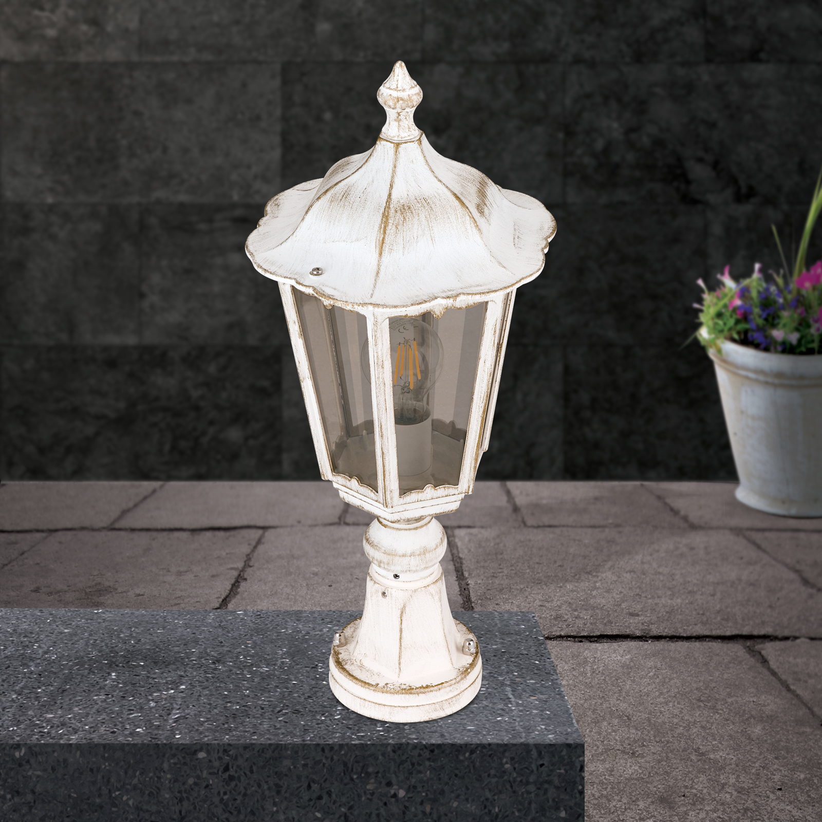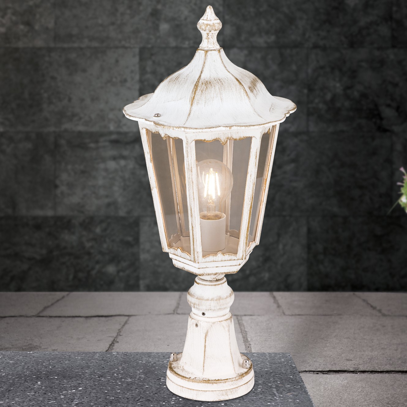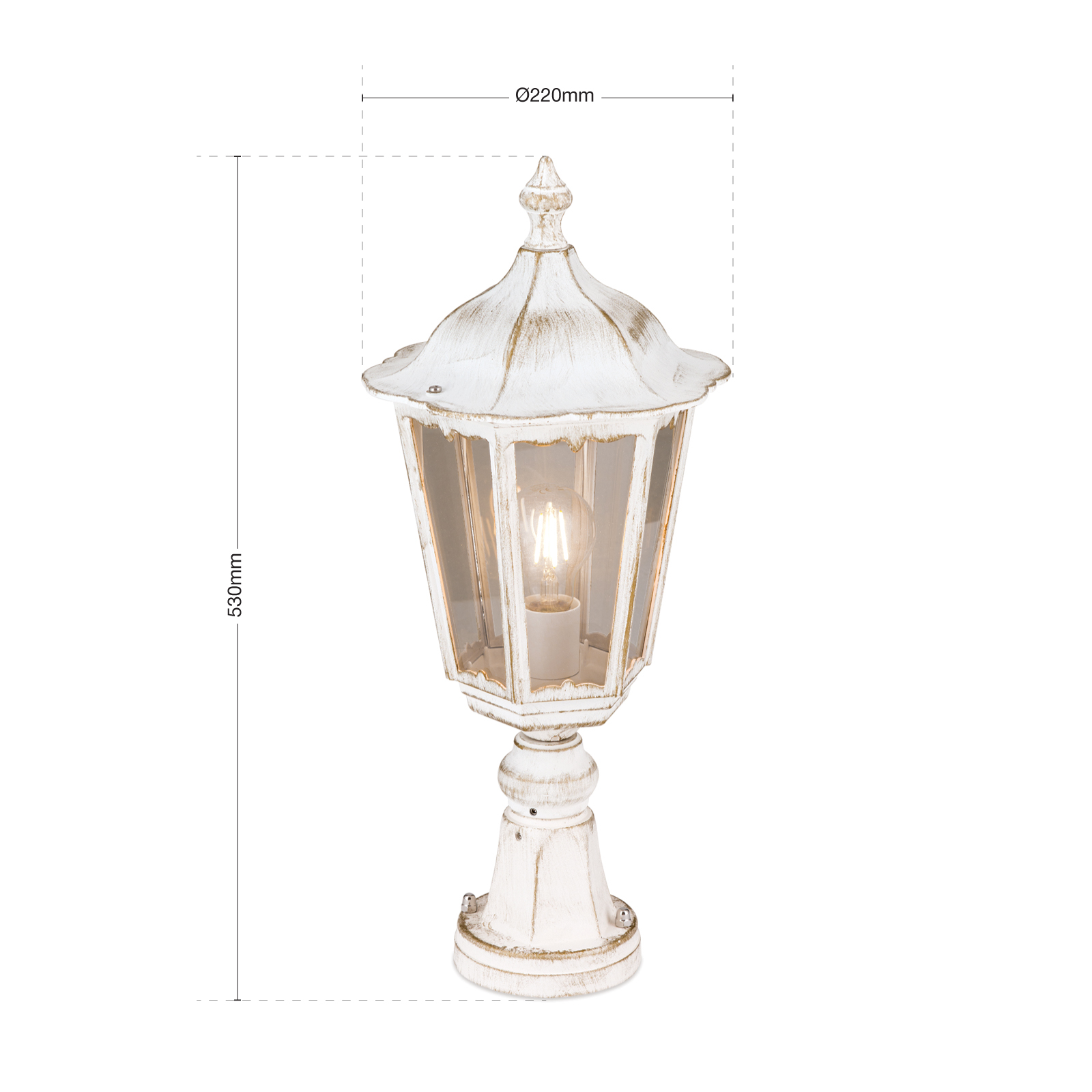 Die klassisch-antike Gartenbeleuchtung Graz ist nicht dimmbar. Die stilvolle Gartenleuchte eignet sich als Beleuchtung auf Mauerabsätzen, Zaunpfählen, Treppenabsätzen oder auch als klassische Außenleuchte und hübsche Lichtquelle im Terrassenbereich. Die vom Design verspielte Gartenleuchte eignet sich mit der Schutzart IP 43 eher für etwas geschütztere Standorte. Die Lieferung erfolgt ohne Leuchtmittel. Der österreichische Hersteller gibt auf die weiße Sockellampe antik-klassisch ab Werk 2 Jahre Garantie. Die Leuchte hat ein Eigengewicht von 2,3 Kilogramm. Die dekorative klassische Sockelleuchte 53cm aus unserer Leuchtenserie Graz lässt sich perfekt mit anderen Leuchtenarten aus dieser Leuchtenserie ergänzen. Sie finden in der Modellserie zum Beispiel auch eine Wandleuchte für Außen, eine einflammige Mastleuchte oder auch einen drei-flammigen Kandelaber. Schauen Sie doch mal als Ergänzung nach der dazu passenden Wandleuchte unter dem folgenden Link Klassische Wandleuchte.