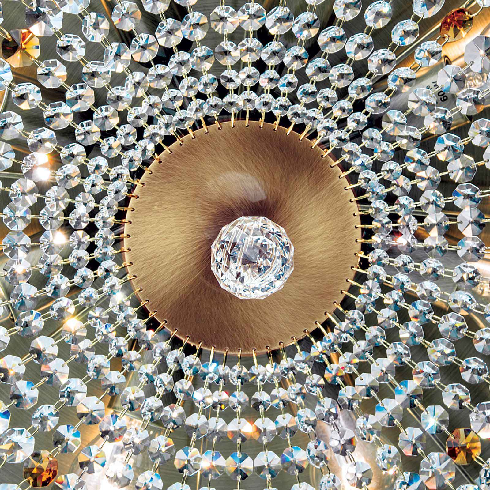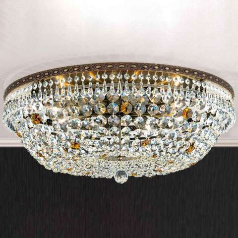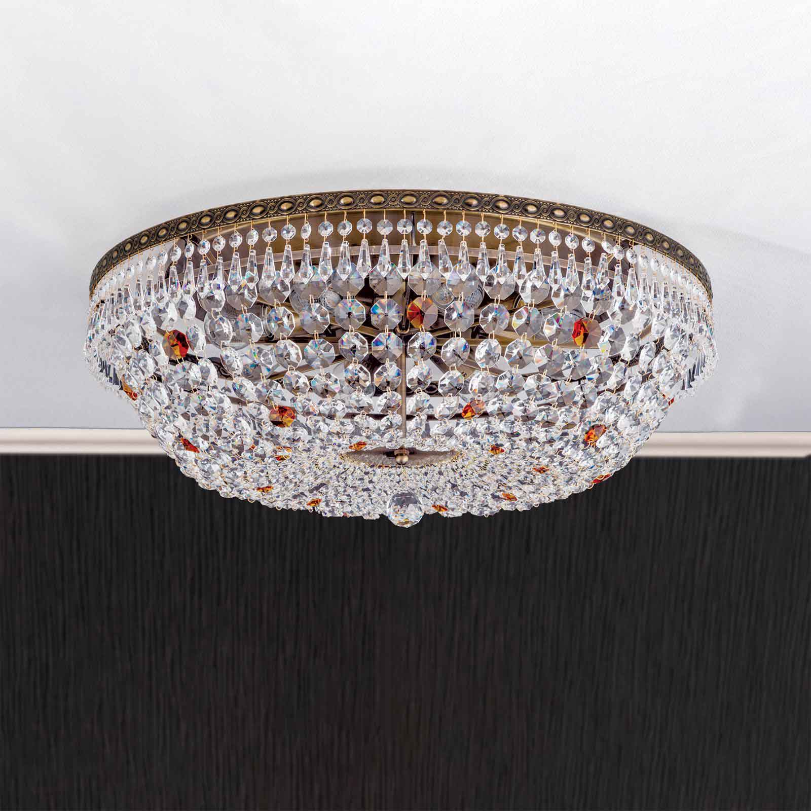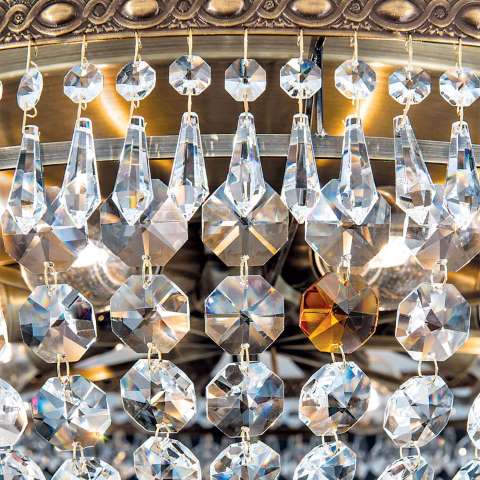 Die vom Design antik-klassische Kristall-Deckenleuchte 65cm aus der Leuchtenserie SHERATON taucht Wohnräume, aber auch Objektbereiche in ein einzigartig bezauberndes Licht. Mit einem hochwertigen Kristallbehang (SCHÖLER CRYSTAL®-Kristallbehang ) fügt sich der Kristall-Luster besonders gut in klassisch eingerichtete Interieurs ein und sorgt dabei für ein dekoratives und zugleich stimmungsvolles Licht als auch atemberaubendes Glitzern. Die Decken-Innenbeleuchtung ist im Durchmesser 65 cm breit. Die Gesamthöhe der Deckenbeleuchtung Modell Sheraton liegt bei 25 Zentimetern. An einem reich verzierten Metallring aus Vollmessing hängen unzählige Kristalle in Koppen- und Tropfenform herab. Der dezente, innen liegende Ring trägt die Kristallketten, welche zur Mitte laufen und sich an einer verspiegelten Zierplatte finden. Ein besonderes Merkmal der Leuchte sind sowohl die amberfarbenen Kristalle, die gezielt platziert wurden als auch die zentral herabhängende facettierte Kristallkugel, die zu schweben scheint. Die 8 Leuchtmittel in den E27-Fassungen befinden sich hinter den Kristallen versteckt und können mit maximal je 60 Watt betrieben werden und auch große Räume mit ausreichend Licht versorgen. Für den großen Wow-Effekt sorgt eine facettierte Kristallkugel, welche an der verspiegelten Zierplatte befestigt ist und zu schweben scheint. Die stilvolle Leuchte ist die ideale Hotel-Deckenbeleuchtung. Ein Hotelfoyer, Empfangs- oder Konferenzraum erhält mit dieser Kristall-Deckenleuchte einen würdigen Mittelpunkt. Wir möchten, daß Ihre neue Deckenleuchte nach der Installation sofort einsatzbereit ist und fügen daher die entsprechenden Leuchtmittel gemäß der Leuchtmittel-Empfehlung des Wiener Herstellers inklusive bei (8 x LED Birnenform, E 27, 8 Watt, Lichtfarbe:warmweiß, je 806 Lumen, Energieeffizienzklasse F). Die Kristall-Deckenleuchte 65cm ist auch mit einem Finish in Chrom oder mit 24 Karat vergoldet erhältlich. Unsere Kristall-Deckenleuchte Modell Sheraton ist eine Qualitätsleuchte aus einer Wiener Leuchtenmanufaktur., die der Schutzart IP 20 entspricht. Damit ist die dimmbare Leuchte ausschließlich für die Beleuchtung von Innenräumen ausgelegt. Setzen Sie mit der Deckenleuchte Sheraton tolle Lichteffekte in Ihren Innenräumlichkeiten. Der hochwertige Messing-Kronleuchter wird in vielen verschiedenen Größen angeboten, von 35 Zentimetern bis zu 120 cm Durchmesser. Sprechen Sie uns bei Fragen gern an! Wir empfehlen Ihnen die Deckenbeleuchtung auch in der Ausführung 24 Karat vergoldet. Schauen Sie für weitere Anregungen gern unter dem folgenden Link Kristall-Deckenleuchte klassisch.