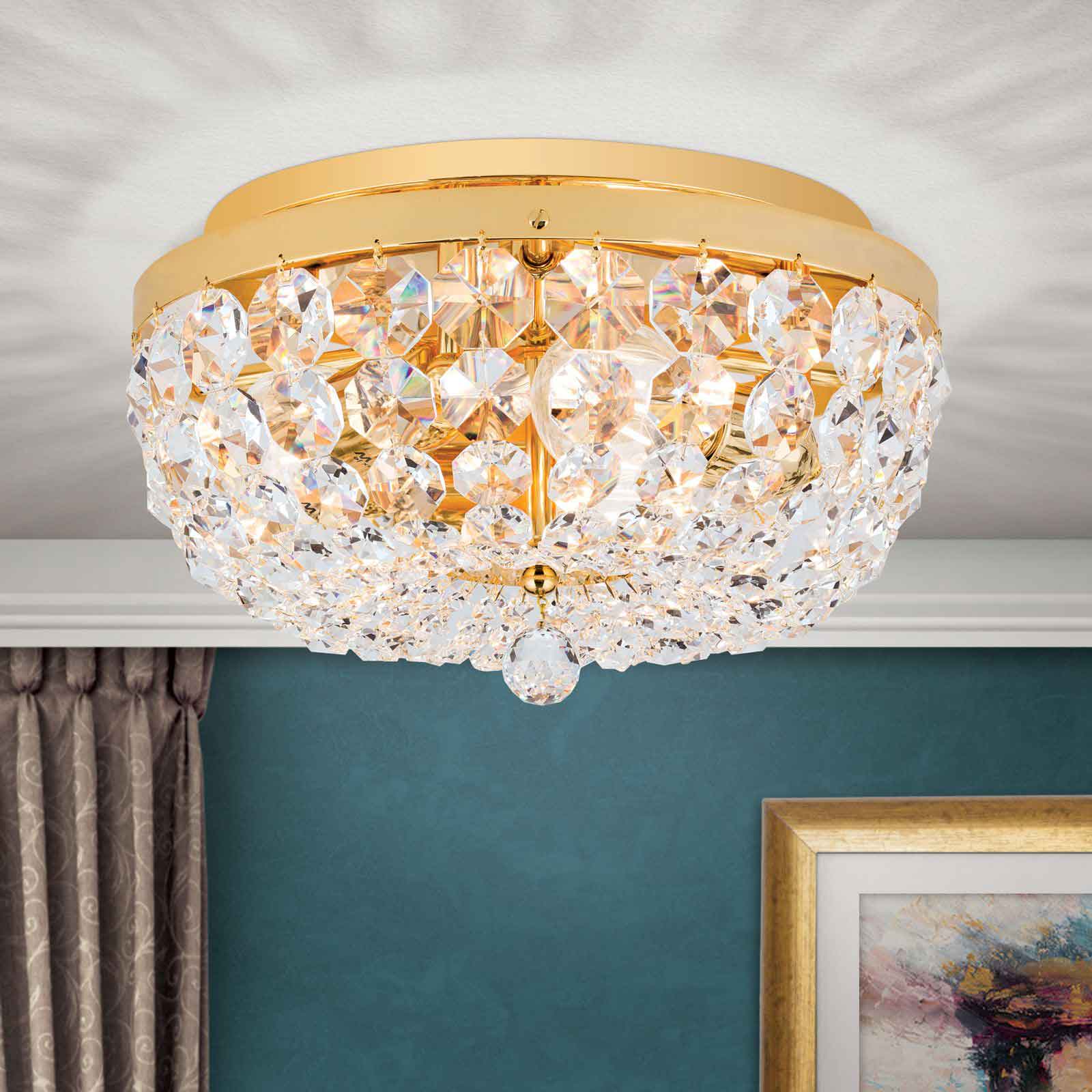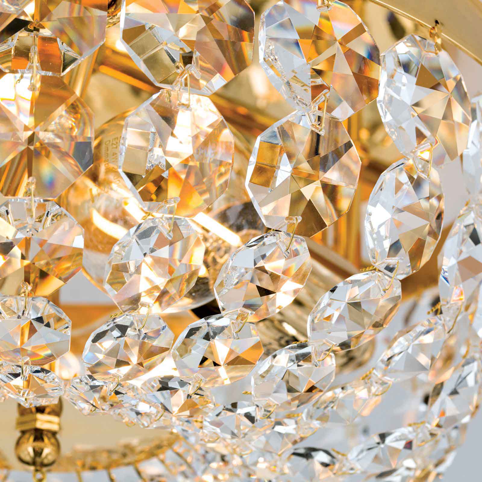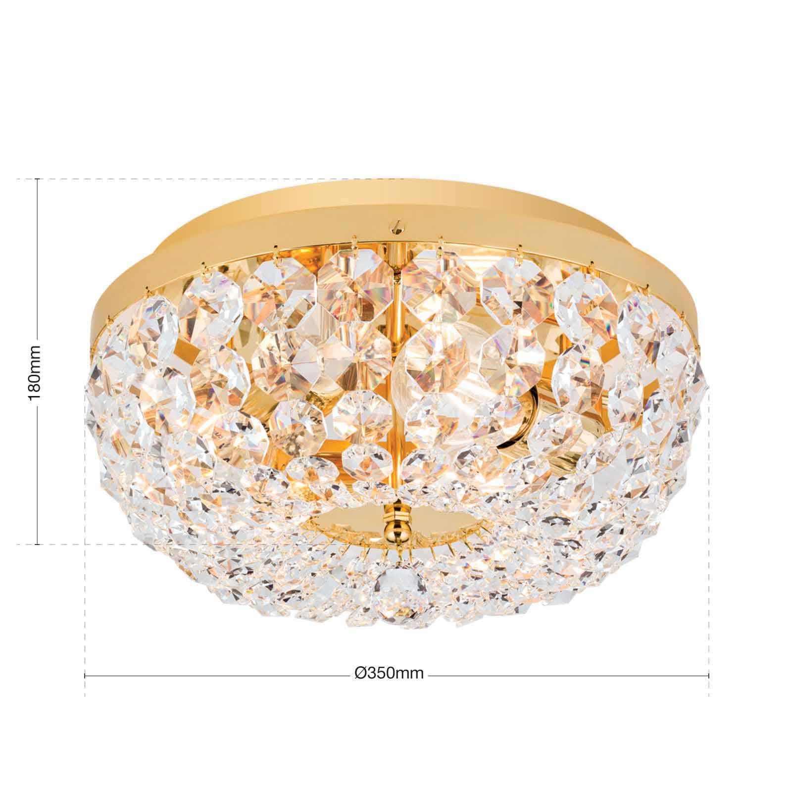 Die Kristall-Deckenleuchte klassisch hat in dieser Ausführung einen Leuchtendurchmesser von 35 Zentimetern. Die Leuchtenhöhe beträgt 18 Zentimeter. 24-Karat Vergoldung in Kombination mit SCHÖLER CRYSTAL®-Kristallen- eine perfekte Mischung für klassisch eingerichtete Wohnräume. Die Einsatzmöglichkeiten sind vielfältig, somit steht einer Anbringung im Wohnzimmer oder einem Eingangsbereich nichts im Wege. Ebenso gut findet der Deckenkronleuchter aus unserer Leuchtenserie SHERATON Einsatz im Objektbereich und wertet Flure oder kleinere Zimmer edel auf. Unterschiedlich große Koppen bilden sich verjüngende Ketten. Befestigt am vergoldeten Vollmessingring verlaufen sie einem Kristallschirm gleich formschön zur Mitte hin. Dort treffen sie auf eine facettierte Kristallkugel, die das Erscheinungsbild abschließt. Durch die zahlreichen Kristalle kommt es bei der Kristall-Deckenleuchte klassisch zu einem wunderbaren Lichtspiel. Ausgestattet mit 3 E 27-Lampenfassungen können die Leuchtmittel mit maximal 60 Watt betrieben werden und mithilfe eines Dimmers in der Helligkeit reguliert werden. Die stilvolle Leuchte ist die ideale Hotel-Deckenbeleuchtung entlang von einzelnen Objektzonen. Die Leuchte ist in verschiedenen Durchmessern erhältlich. Wählen Sie zwischen 35 cm, 45 cm, 55 cm, 65 cm, 105 cm bis zu 120 Zentimetern Durchmesser. Gern unterbreiten wir Ihnen ein Angebot. Die stilvolle Kristall-Deckenleuchte klassisch ist auf Anfrage auch mit dem Finish Alt-Patina oder verchromt erhältlich. Schauen Sie für Bilder gern auch unter dem folgenden Link Kristall-Deckenleuchte antik, hier allerdings mit einem Durchmesser von 55 cm abgebildet.