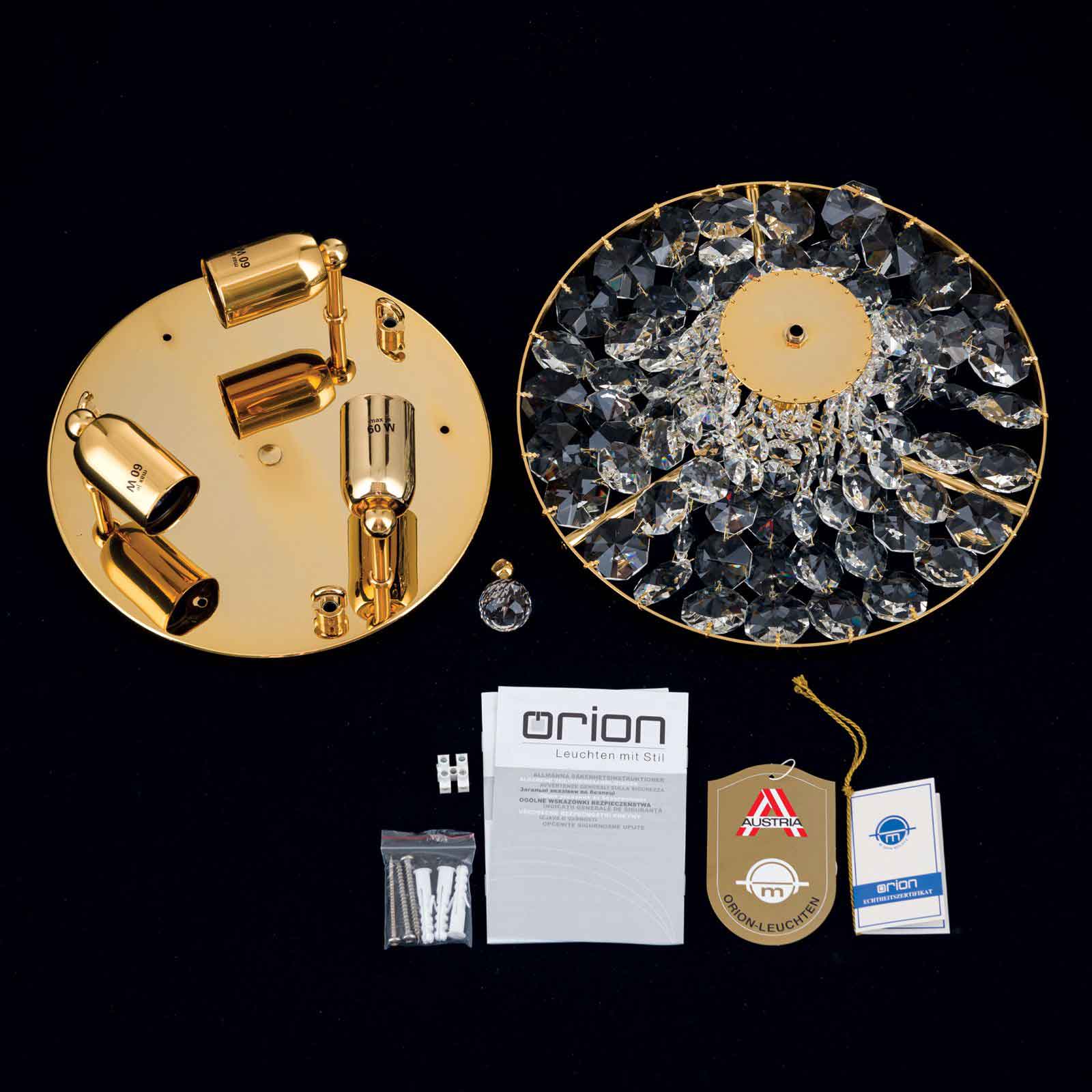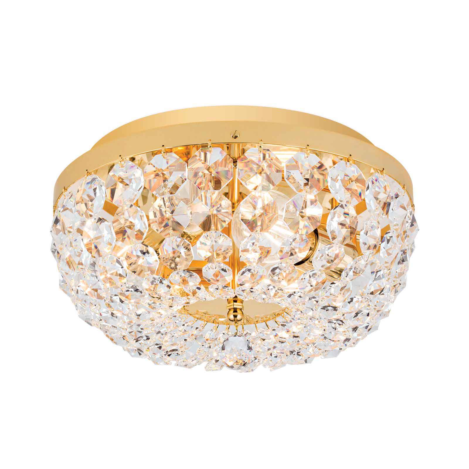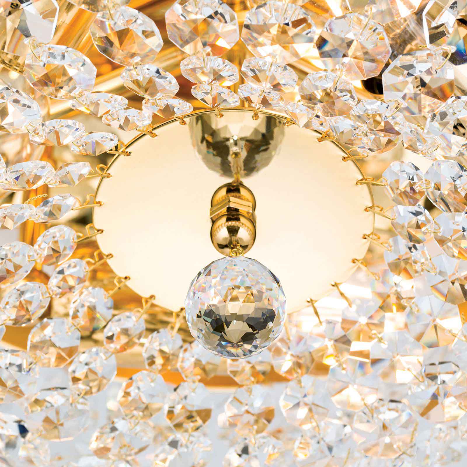 Die Kristall-Deckenleuchte klassisch hat in dieser Ausführung einen Leuchtendurchmesser von 35 Zentimetern. Die Leuchtenhöhe beträgt 18 Zentimeter. 24-Karat Vergoldung in Kombination mit SCHÖLER CRYSTAL®-Kristallen- eine perfekte Mischung für klassisch eingerichtete Wohnräume. Die Einsatzmöglichkeiten sind vielfältig, somit steht einer Anbringung im Wohnzimmer oder einem Eingangsbereich nichts im Wege. Ebenso gut findet der Deckenkronleuchter aus unserer Leuchtenserie SHERATON Einsatz im Objektbereich und wertet Flure oder kleinere Zimmer edel auf. Unterschiedlich große Koppen bilden sich verjüngende Ketten. Befestigt am vergoldeten Vollmessingring verlaufen sie einem Kristallschirm gleich formschön zur Mitte hin. Dort treffen sie auf eine facettierte Kristallkugel, die das Erscheinungsbild abschließt. Durch die zahlreichen Kristalle kommt es bei der Kristall-Deckenleuchte klassisch zu einem wunderbaren Lichtspiel. Ausgestattet mit 3 E 27-Lampenfassungen können die Leuchtmittel mit maximal 60 Watt betrieben werden und mithilfe eines Dimmers in der Helligkeit reguliert werden. Die stilvolle Leuchte ist die ideale Hotel-Deckenbeleuchtung entlang von einzelnen Objektzonen. Die Leuchte ist in verschiedenen Durchmessern erhältlich. Wählen Sie zwischen 35 cm, 45 cm, 55 cm, 65 cm, 105 cm bis zu 120 Zentimetern Durchmesser. Gern unterbreiten wir Ihnen ein Angebot. Die stilvolle Kristall-Deckenleuchte klassisch ist auf Anfrage auch mit dem Finish Alt-Patina oder verchromt erhältlich. Schauen Sie für Bilder gern auch unter dem folgenden Link Kristall-Deckenleuchte antik, hier allerdings mit einem Durchmesser von 55 cm abgebildet.