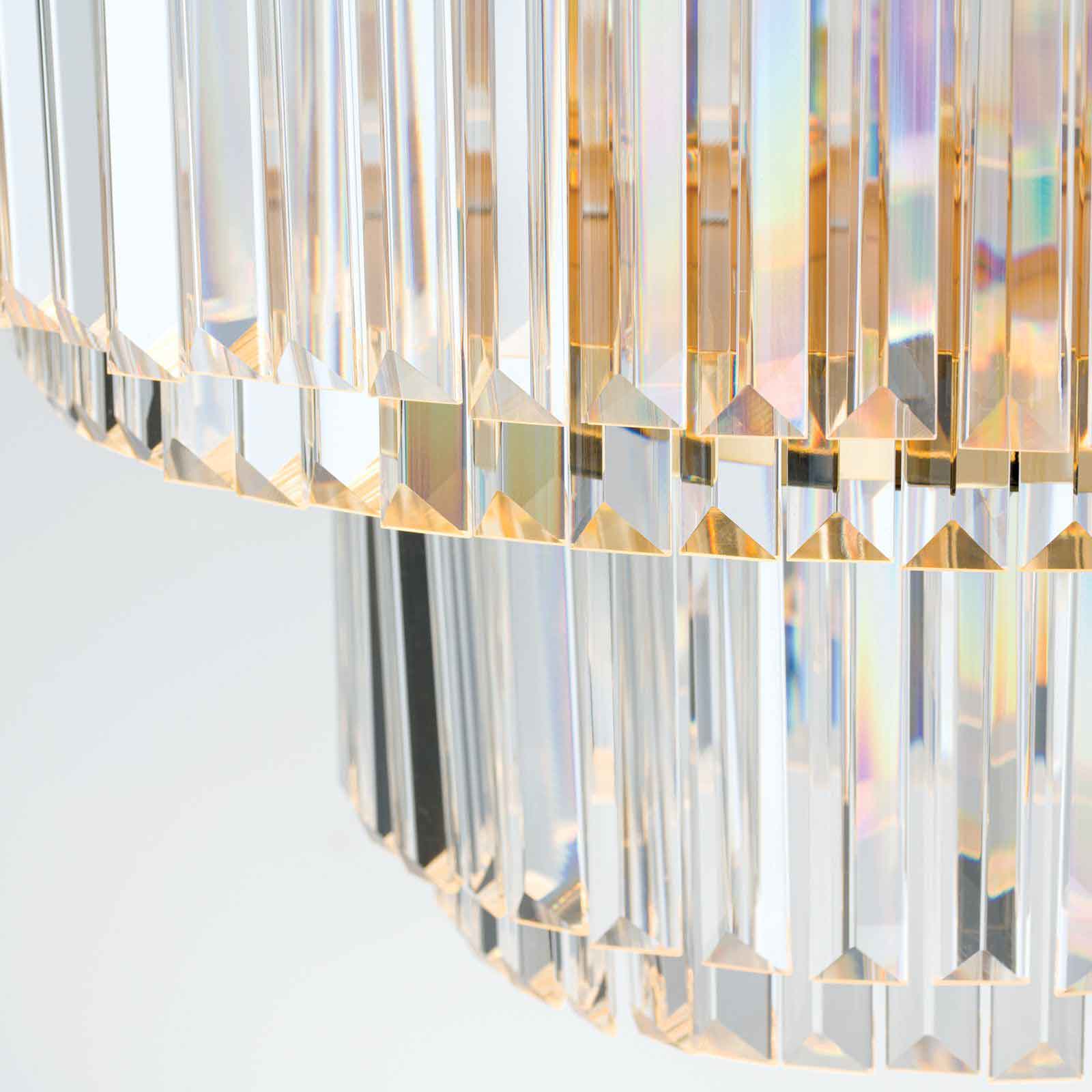 Unser Kristall-Kronleuchter aus der Leuchtenserie Zenit vereint technologische Innovation mit einer anspruchsvollen handwerklichen Leuchtentradition. Die höhenverstellbare Decken-Innenbeleuchtung ist eine Neuinterpretation des klassischen Kronleuchters. Zwei Ebenen von ORION Kristallglas-Prismen mit Vollschliff verleihen ihm eine schlichte Eleganz. Beleuchtet schillert diese exklusive Deckenbeleuchtung mit einem ganz besonderen Flair. Die von Kristallen eingerahmten LED-Platinen bringen die besonderen Eigenschaften des hochwertigen Kristalls, wie seine reine Brillanz und sein klares Leuchten besonders zu Geltung. Innenliegende Diffusoren bewirken, dass der Kristall-Kronleuchter blendfrei und die Lichtpunkte unsichtbar sind und sorgen für eine gleichmäßige Verteilung des Lichts. Der Kristall-Kronleuchter aus unserer Leuchtenserie Zenit fügt sich nahtlos in ein modernes Ambiente und schafft einen glänzenden Blickpunkt im Hotelfoyer oder auch anderen Innenräumlichkeiten, wo eine lichtstarke Deckenbeleuchtung als eleganter Blickfang gesucht wird. Ob als Hotelbeleuchtung oder in einem eleganten Restaurant, die Kristall-Deckenleuchte Zenit schafft beeindruckende Lichtmomente. Ausgestattet ist die rundförmige Deckenleuchte mit dimmbaren warmweißen LEDs (3.000 Kelvin). Die Leuchten unserer Serie Zenit sind mithilfe eines Phasenabschnittsdimmers dimmbar. Die verbauten LEDs entsprechen der Energieeffizienzklasse G und sind später durch einen Techniker austauschbar. Der gewichtete Energieverbrauch liegt bei der Innenbeleuchtung bei 80 kw/1000 Stunden. Für ein stimmiges Lichtkonzept können Sie den Luster auch mit anderen Leuchten der Serie Zenit kombinieren. Die Leuchtenserie Zenit umfasst neben dem Kristall-Kronleuchter auch Hänge-, Decken- und Wandleuchten. Sprechen Sie uns bei Bedarf gern darauf an.