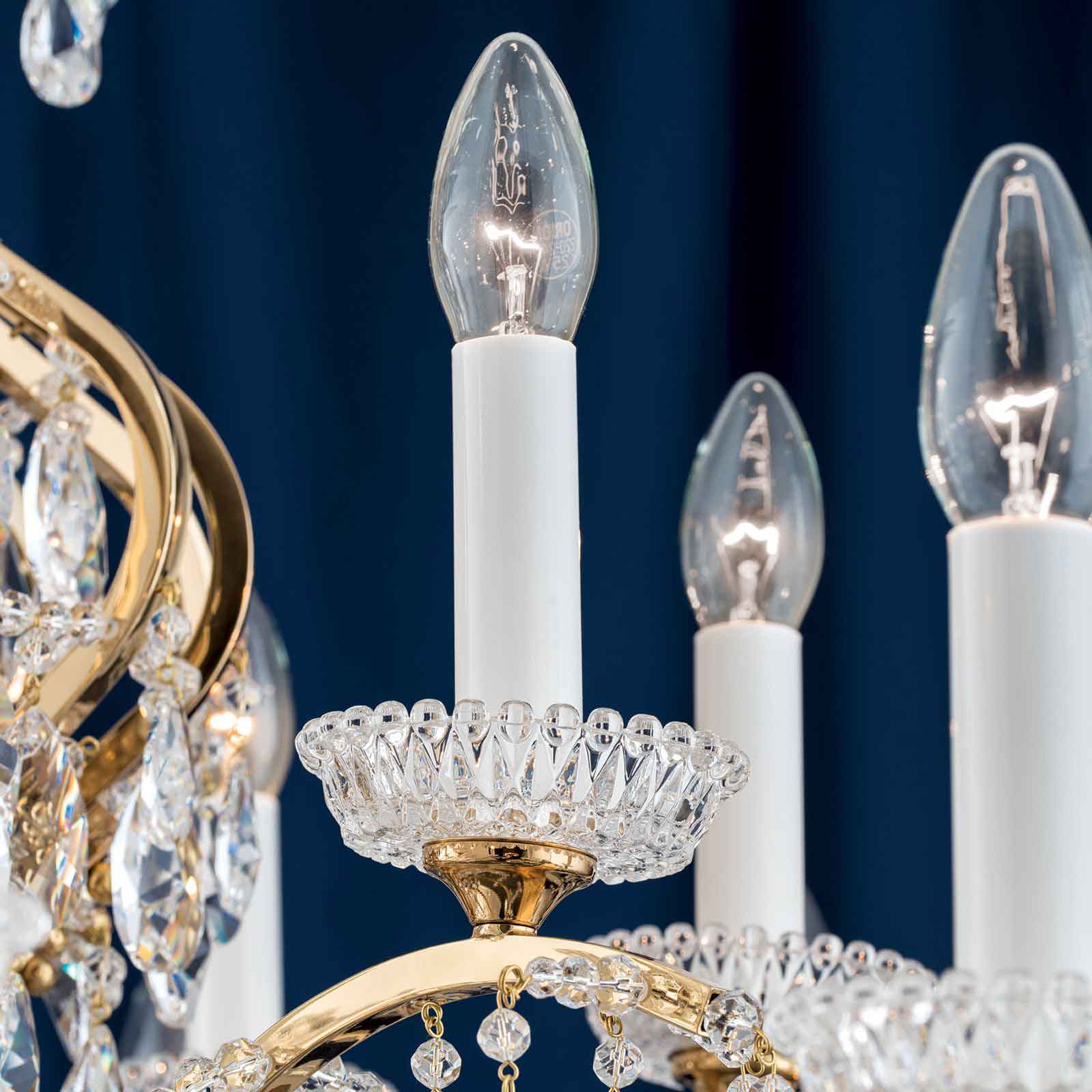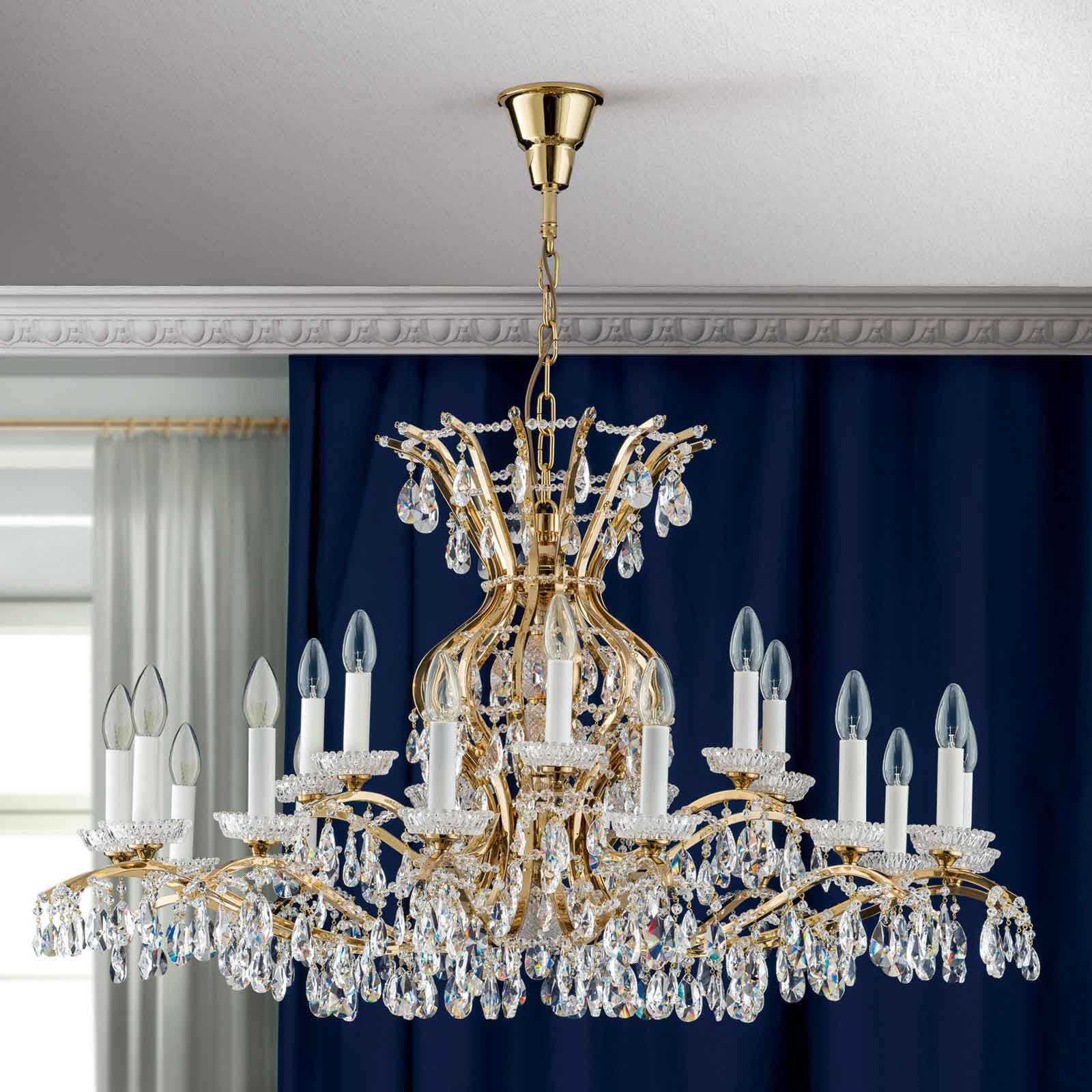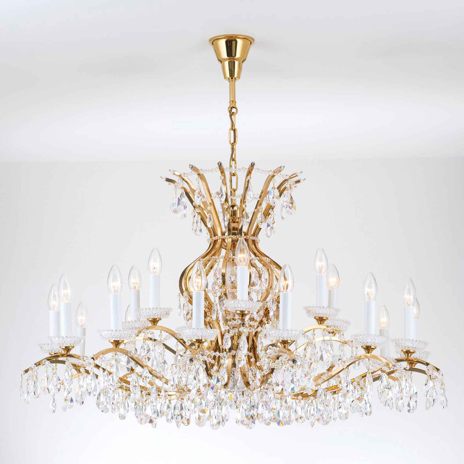 Der echt vergoldete Kronleuchter klassisch 21-flammig aus der glamourösen Leuchtenserie Florentine setzt hohe Maßstäbe an die Beleuchtung in größeren Innenräumen. Mit unserer Leuchtenkollektion Florentine tauchen Sie in eine schillernde Welt ein. Der 21-flammige Kristall-Kronleuchter, in Österreich auch unter dem Namen Luster bekannt, geizt nicht mit seinen Reizen: Ein vergoldeter Korpus aus Vollmessing mit üppigem Kristallbehang (SCHÖLER CRYSTAL®) gleißt wie ein sommerlicher Sonnenstrahl in der Raummitte. Aufwendig geformte Spangen umkreisen den kristallenen Mittelschaft und gehen über in schwungvolle, weit ausladende Arme. Zwei Kerzenstöcke (14 + 7) bilden einen hell leuchtenden Lichterreigen. Bleikristall-Kerzentassen runden die Hochwertigkeit dieses Kristall-Kronleuchters ab. Der Schliff der Kristalle wirkt wie ein Prisma, das das Licht in allen Farben des Spektrums tanzen lässt.