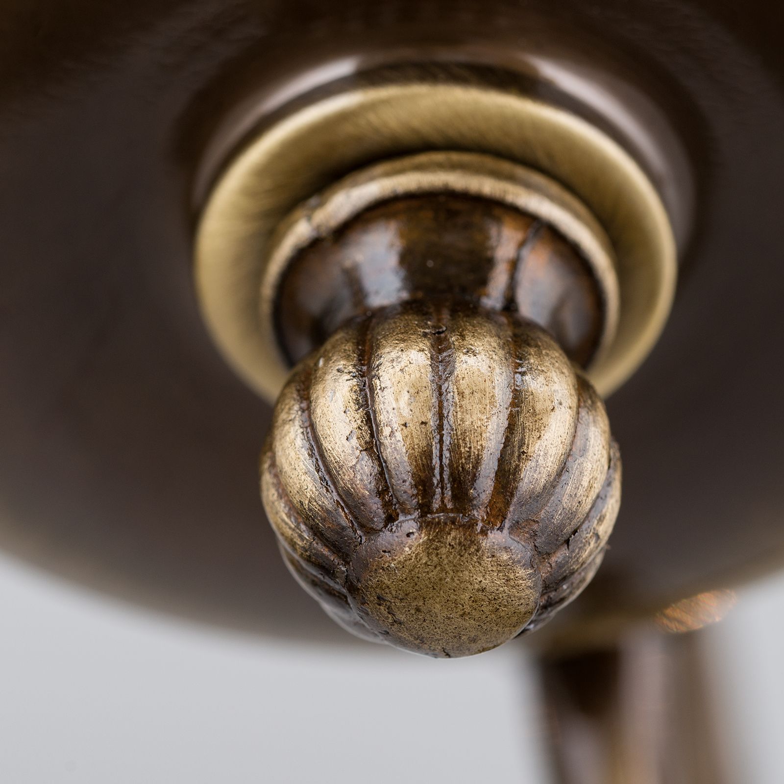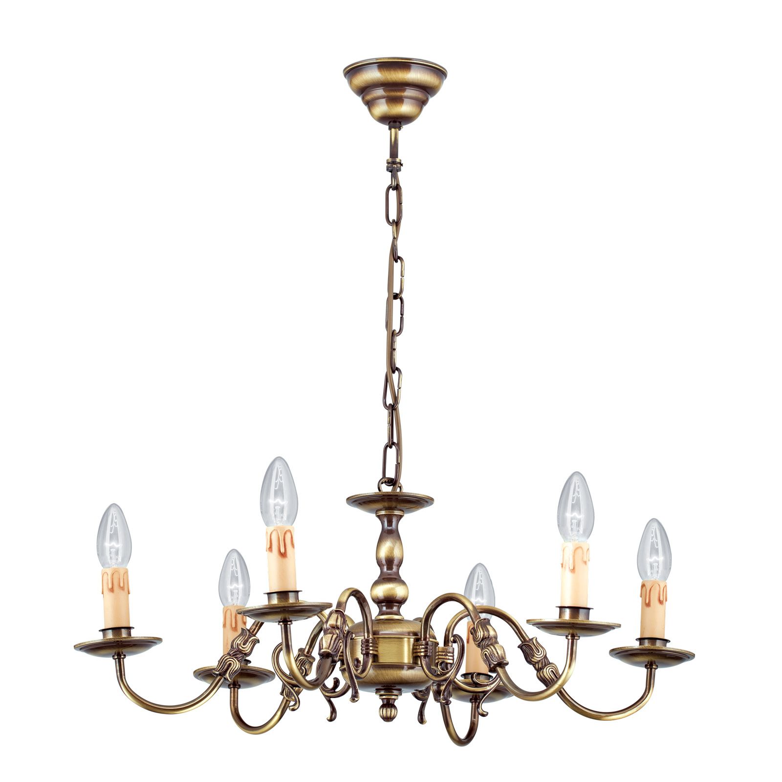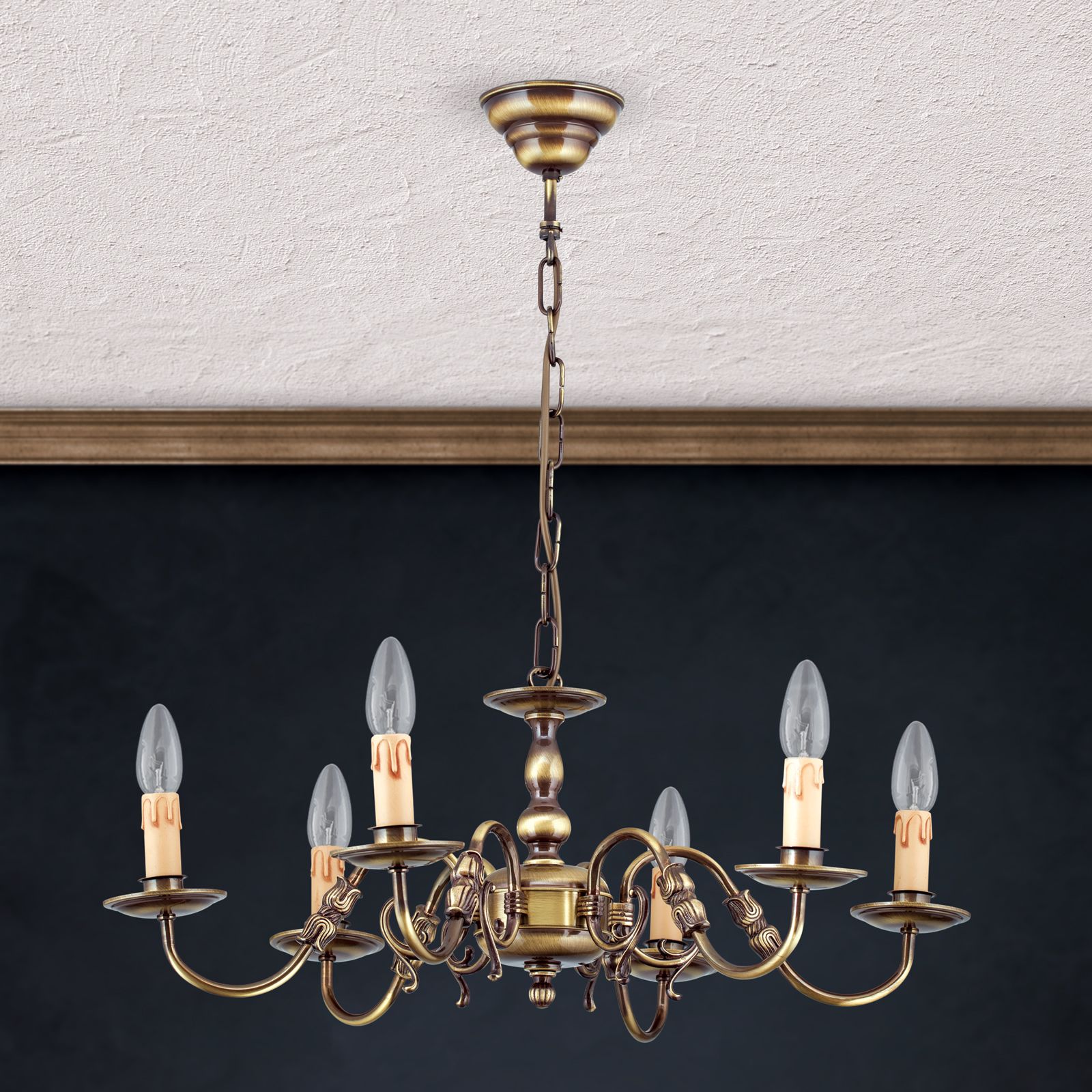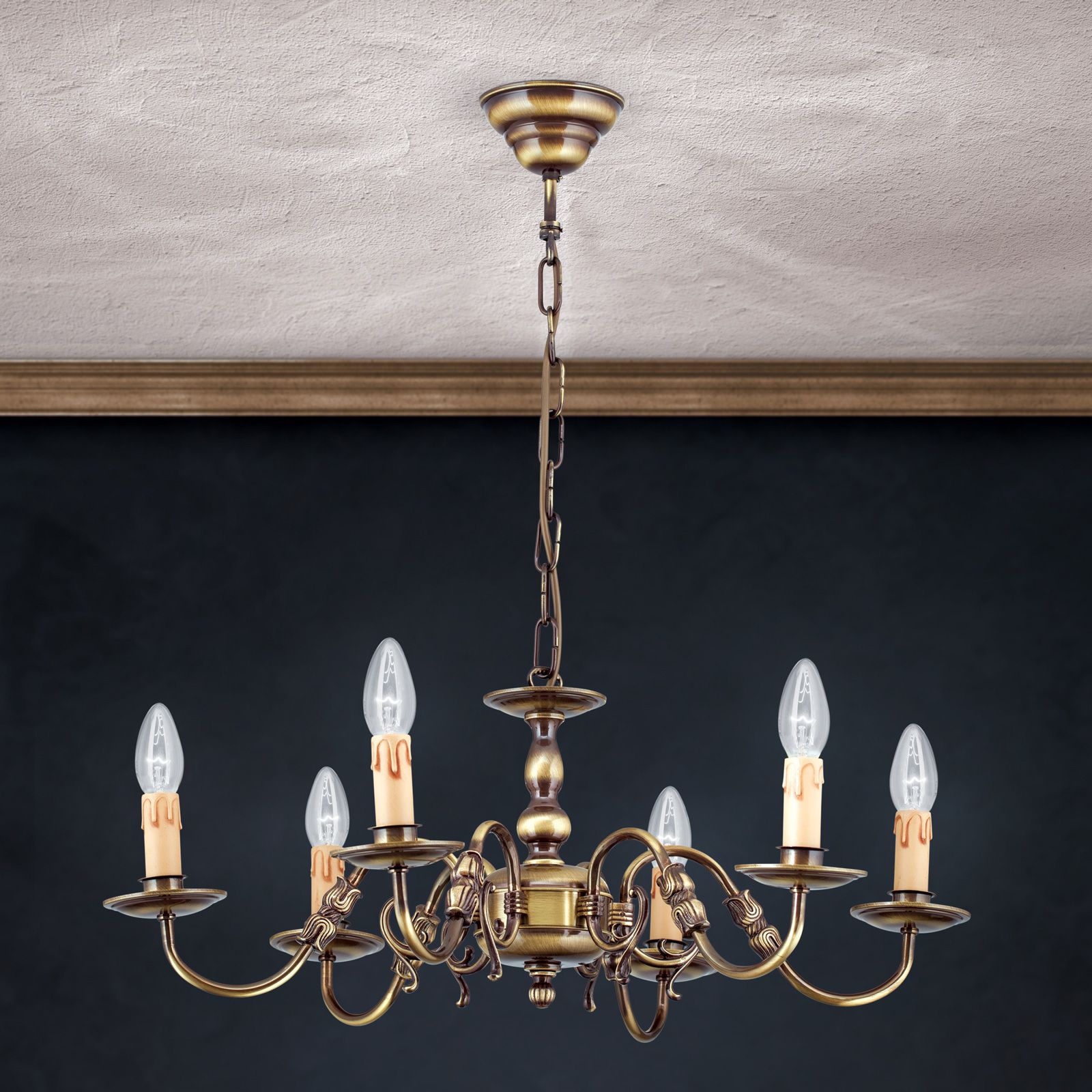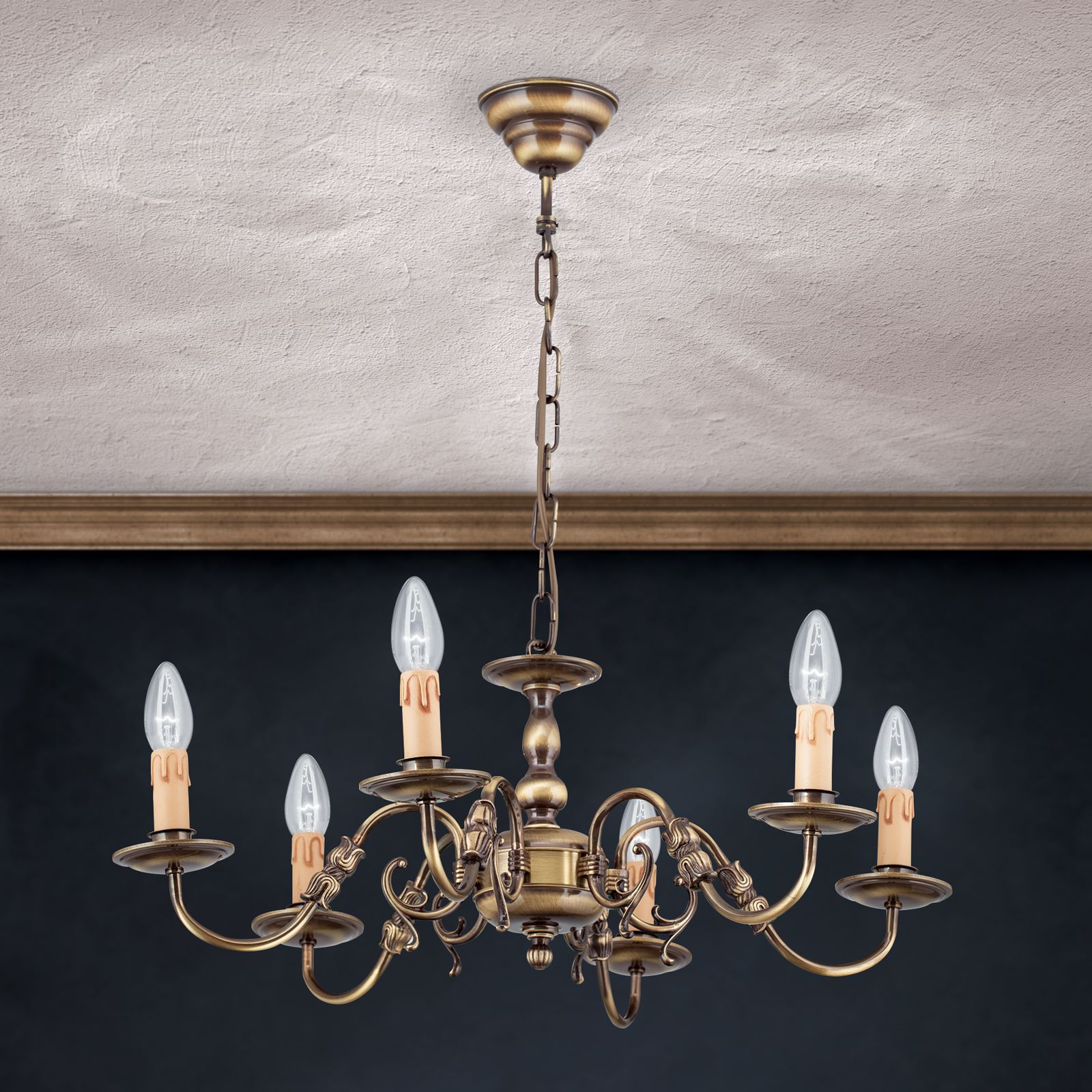 Der Kronleuchter klassisch 6-flammig aus unserer Modellserie Kira ist eine klassisch-antike Design-Deckenbeleuchtung aus solidem Messing. Der mehrflammige Kerzen-Kronleuchter verströmt mit eleganter Bescheidenheit den Glanz vergangener Zeiten, als Rembrandt und Rubens ihre unsterblichen Meisterwerke schufen. Weit ausladende Arme mit Blütenverzierungen tragen die in Kerzenoptik gehaltenen Lampenfassungen. Windstoßlampen vermitteln mit einfachen Mitteln das Flair von Adelspalästen. Der 6-flammige flämische Stilluster, wie diese Leuchtenart in Österreich auch genannt wird, überzeugt durch die feine Gestaltung des Korpus und der Leuchtenarme. Gleichmäßige S-Bogen mit Rankwerk und Spiralen tragen die Fassungen in Kerzenoptik mit angedeuteten Wachstropfen. Die charakteristische Kugel wird durch einen verzierten Knauf abgeschlossen. Eine Messingkette trägt den Kronleuchter klassisch 6-flammig.