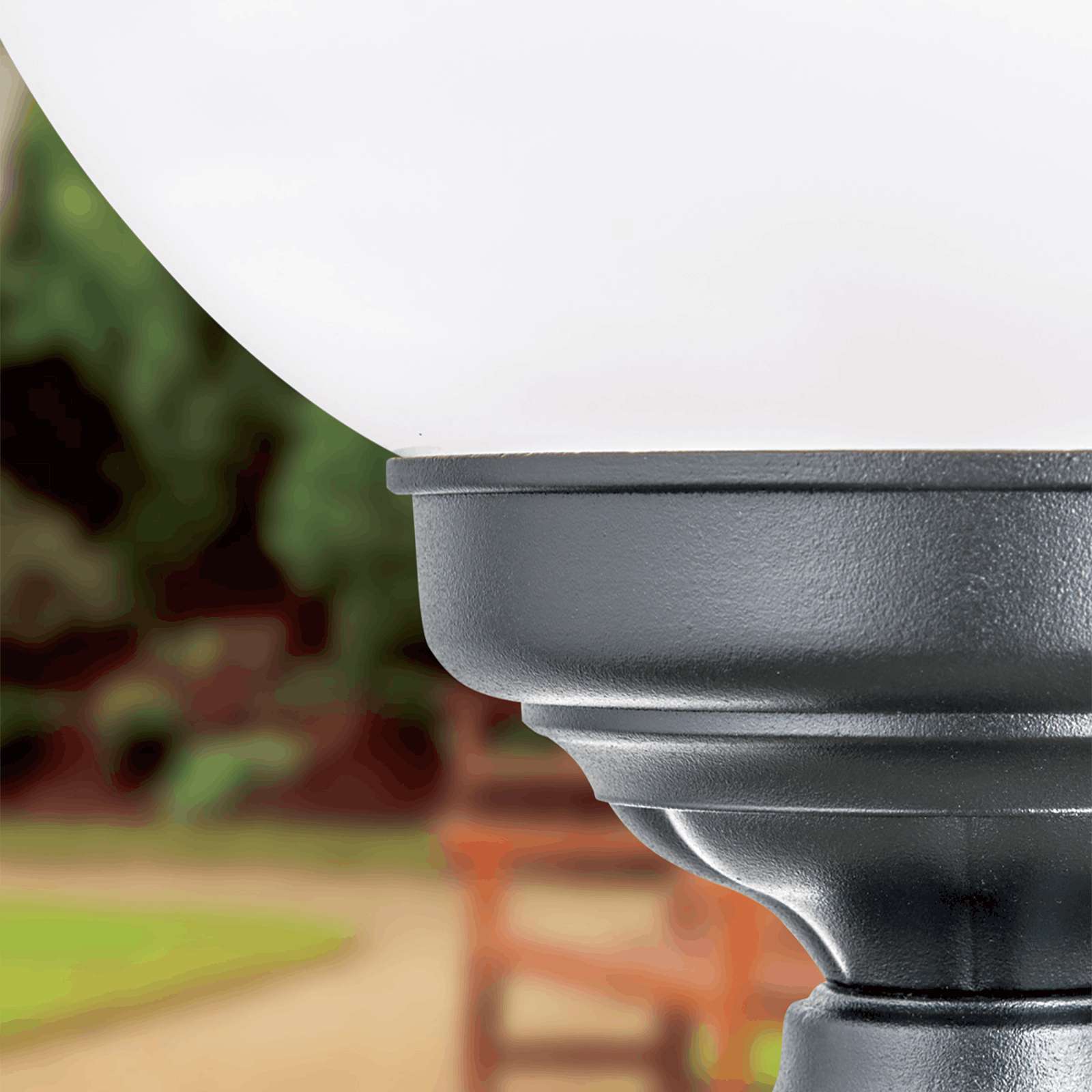 Die schwarz-weiße Kugel Aussenleuchte ist von seinen Maßen 256 cm hoch und misst in der Breite 87 cm. Die hohe Mastleuchte wird für eine besondere Langlebigkeit aus Siluminguss gefertigt. Siluminguss ist eine Aluminiumgusslegierung aus 87% Aluminium und 13% Silicium. Silumin wird z. B. im Motorenbau, Kraftfahrzeugbau oder auch im Bereich Flugzeugbau als Material verwendet und zeichnet sich insbesondere durch seine hohe mechanische Widerstands-und Wärmeleitfähigkeit aus. Die drei Kugelhauben werden bei dieser Außenleuchte aus hochwertigem Acrylglas in der Farbe Opalweiß gefertigt und zeigen eine glänzende Oberfläche. Ersatz-Kugelhauben sind auf Anfrage gern erhältlich.