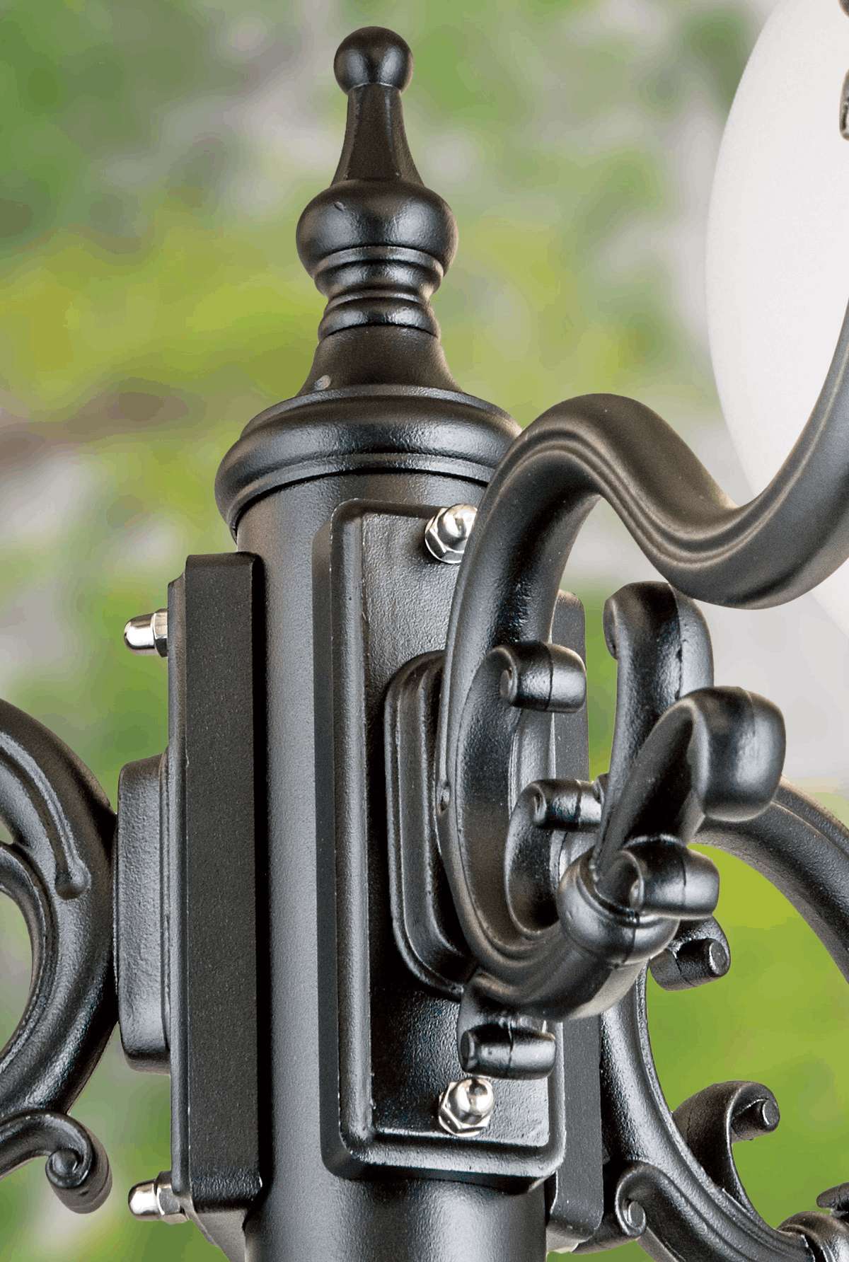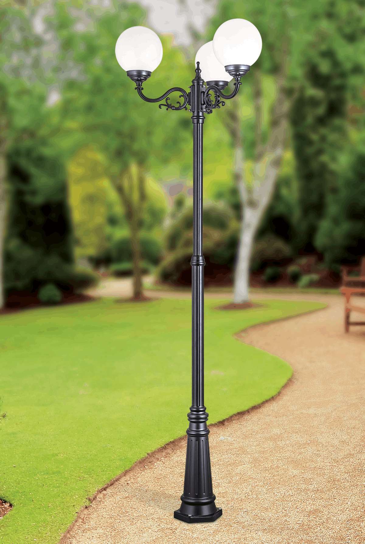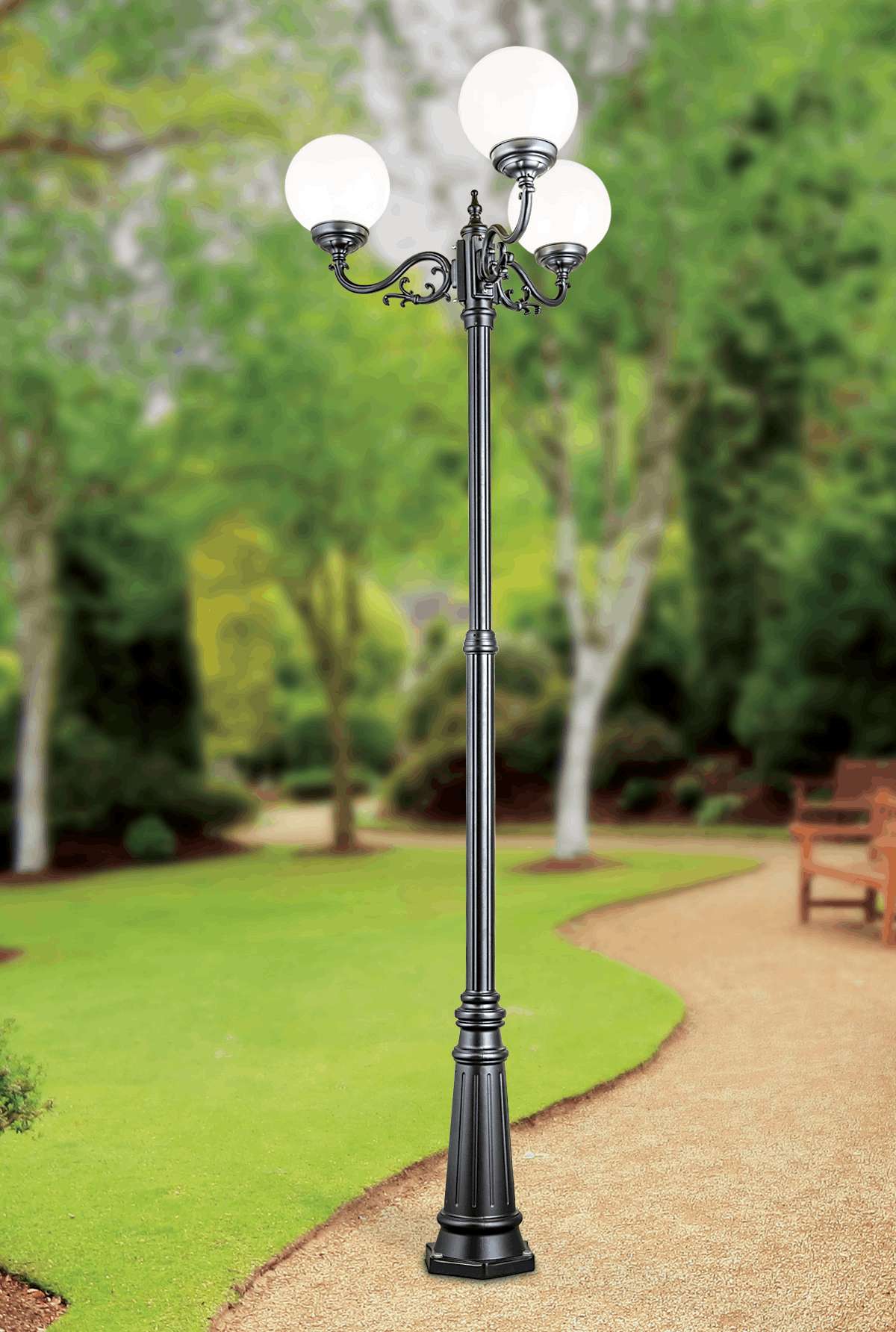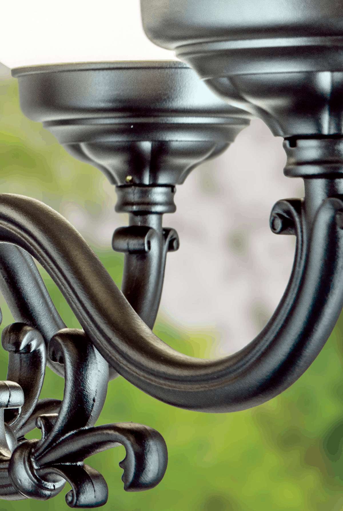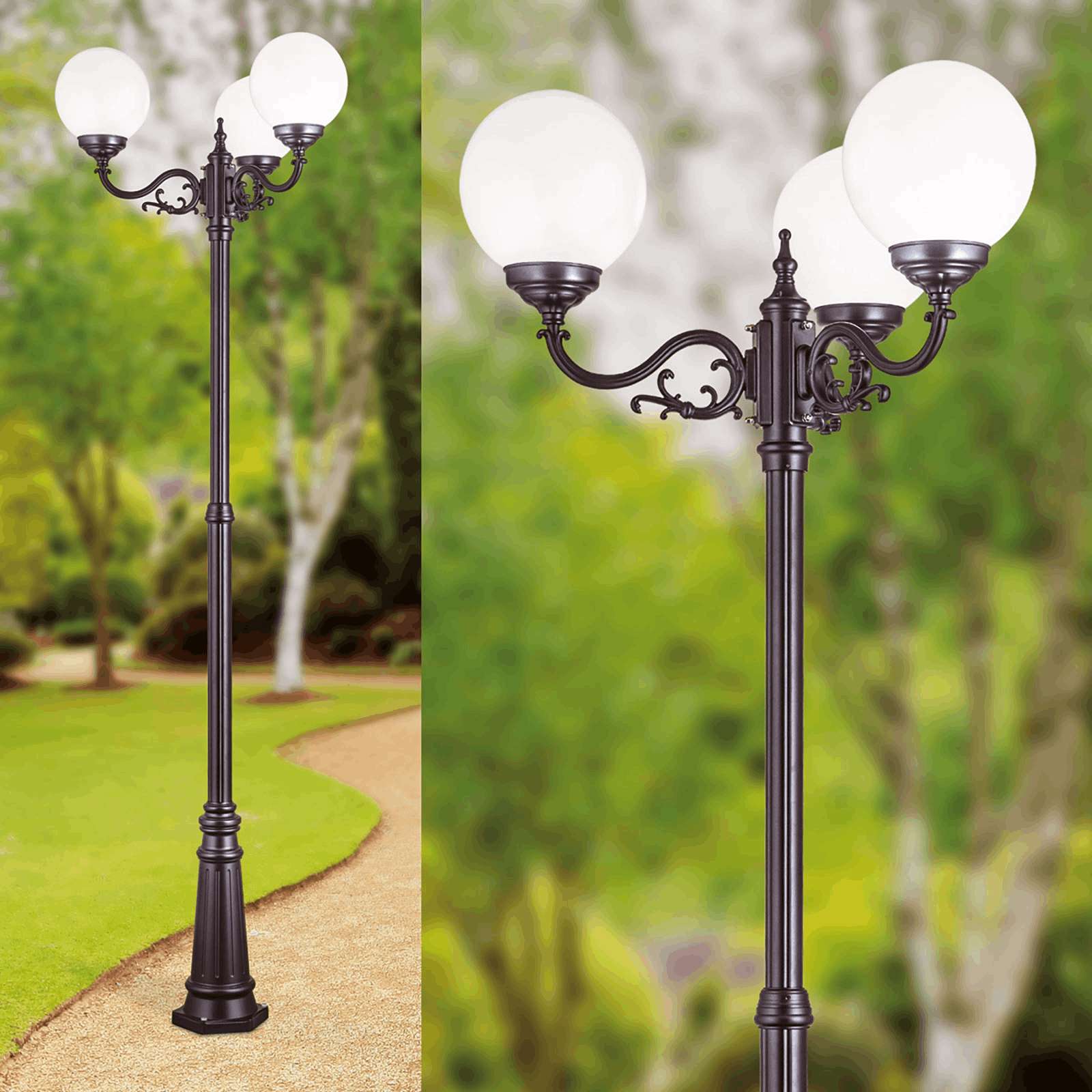Unsere stilististisch klassische Kugel Aussenleuchte 3-flammig gehört zu unserer Modellserie Leuchtenserie Salzburg. Die dreiarmige Aussenleuchte überzeugt optisch mit 3 opalweißen Acrylglas-Kugelhauben, die auf drei Leuchtenarmen mit stilvollen Verzierungen befestigt werden. Die Einsatzmöglichkeiten der großen Gartenbeleuchtung Salzburg sind vielfältig. Die dreiarmige Gartenbeleuchtung eignet sich als dekorative Lichtquelle im Vorgarten oder auch als stilvolle Außenbeleuchtung an Wegesecken, auf Rasenflächen oder an anderen dunklen Ecken Ihres Außenbereiches. Auch als dekorative Gastronomiebeleuchtung ist der dreiarmige Kandelaber sicherlich eine gute Wahl. Setzen Sie mit dem Kugel-Kandelaber geschmackvolle Lichtakzente in Ihrem Außenbereich. Lassen Sie Ihre Gäste auch in der Dunkelheit gut und sicher ohne Stolperfallen an ihr Ziel kommen. Die stilvolle Kugel Aussenleuchte 3-flammig entspricht der Schutzart IP 43. Die große Außenleuchte Salzburg ist mit einem Phasenanschnittsdimmer dimmbar., falls unterschiedliche Helligkeiten gewünscht sind.