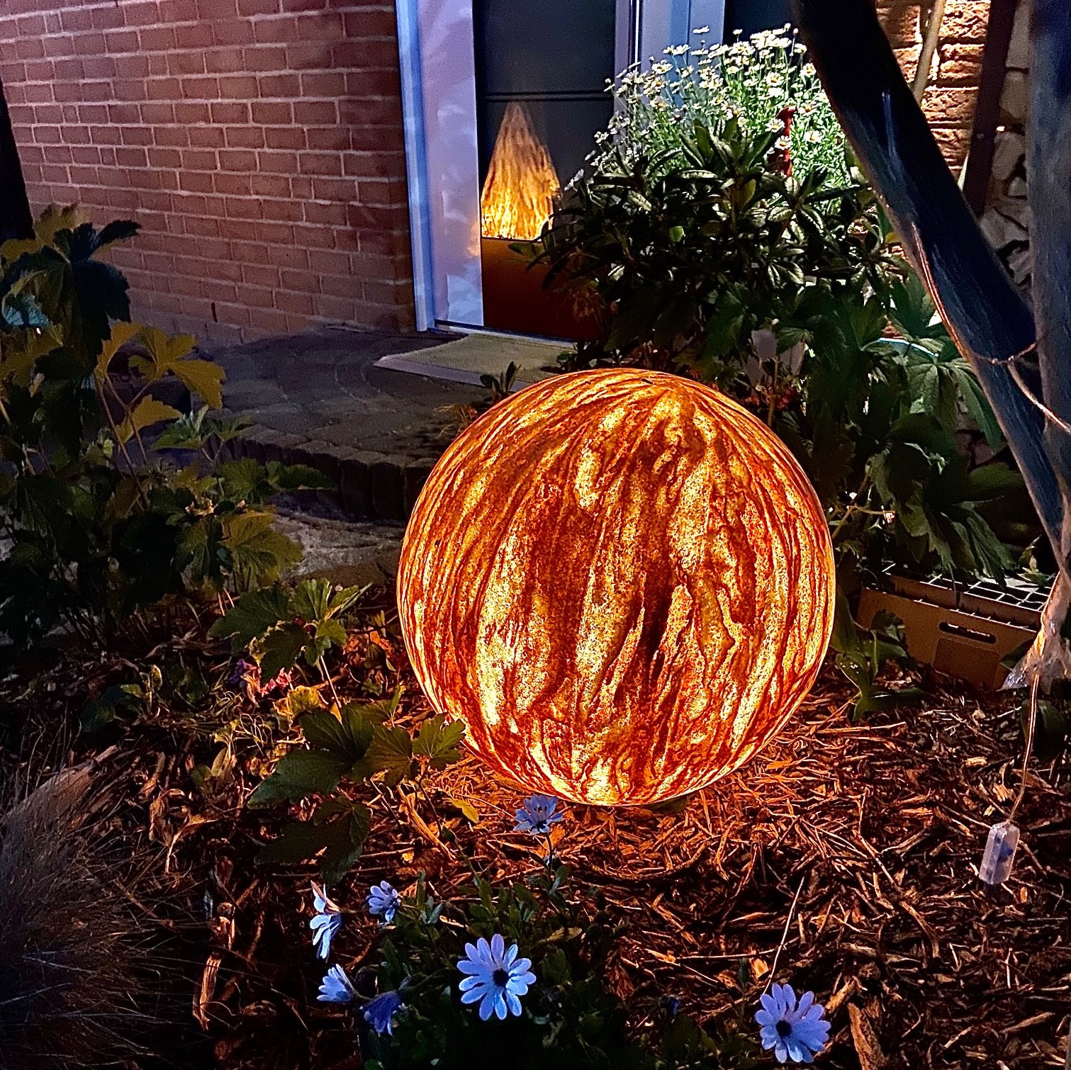 Die exklusive Oberflächenbeschichtung erfolgt bei der Kugelleuchte Edelstahlfuß 60cm Modell Dubai von Hand. Fachmännisch und sorgsam wird hierbei echter Quarzsandstein auf die Kugelhaube aufgetragen. Die stilvolle Gartenbeleuchtung ist zur ortsfesten Montage vorgesehen, um auch stärkerem Wind widerstehen zu können. Die dekorative Außenleuchte wird mit einem im Durchmesser 27x 27 cm großen hochwertigen Edelstahlfuß geliefert. Die gesamte Leuchtenhöhe beträgt 63 cm. Die Befestigung erfolgt mit den 4 vorhandenen Befestigungsbohrungen am Sockelfuß. Das Gehäuse der vom Design und Stil modernen bis zeitlosen Aussenbeleuchtung besteht aus robustem und formstabilem Polyethylen. Der Einsatz der exklusiven Designer-Aussenleuchte ist vielfältig. Die dekorative Kugelleuchte passt mit ihren erdfarbenen Tönen stilvoll in den Eingangsbereich, aber auch in den Terrassenbereich oder als optisches Highlight und Eye-Catcher in Ihre Beetanlagen- insbesondere in der Winterzeit schafft man damit beeindruckende farbige Lichteffekte in der Dunkelheit. Die dekorative Gartenleuchte erzeugt ein blendfreies, warmes, anheimelndes und natürliches Licht mit Farbnuancen und sorgt für die Beleuchtung von Flächen und Wegen in öffentlichen und privaten Bereich. Für eine besondere Langlebigkeit werden bei der wetterfesten Garten-Kugelleuchte hochwertige Materialien, z.B. auch ausschließlich Edelstahlschrauben, verwendet. Die exklusive Kugelleuchte mit Natursteinbeschichtung ist UV-beständig sowie auch beständig gegen chlorhaltiges Schwimmbadwasser und Seewasser. Die Leuchte entspricht der Schutzart IP 45 und ist durchaus geeignet, im Außenbereich und Umgebung Ihrer Pool- oder Teichanlagen für ein stimmungsvolles Lichtambiente eingesetzt zu werden. Wer eine noch größere Kugelleuchte sucht, der findet unter dem folgenden Link Kugel Aussenleuchte Dubai 100 eine 100 cm große Kugelleuchte ebenfalls mit Natursteinbeschichtung, aber ohne Edelstahlfuß.