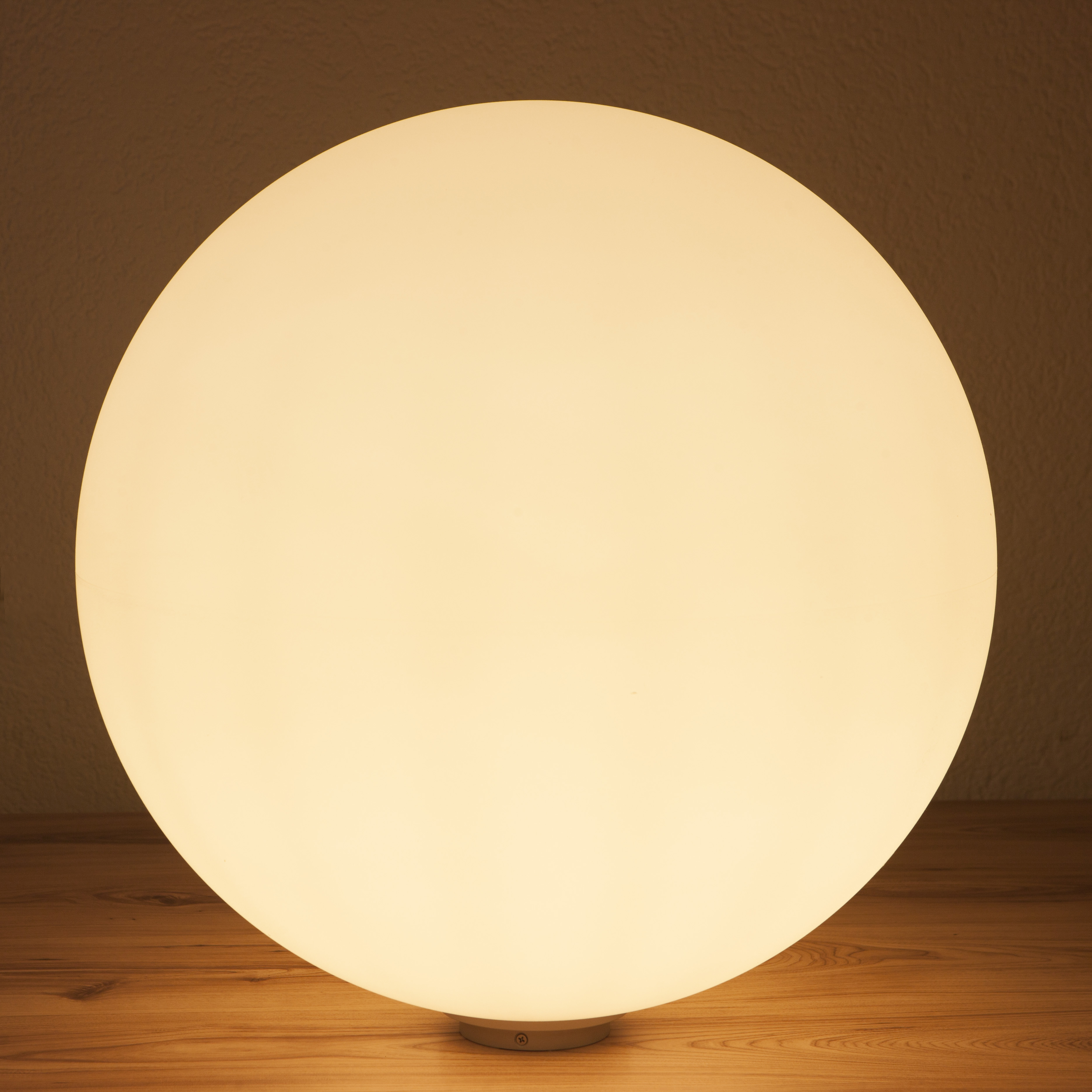 Die große Kugelleuchte mit Bewegungsmelder 100cm aus unserer Leuchtenserie Olymp ist mit einem Kugel-Durchmesser von 100 cm das größte Leuchtenmodell dieser Serie. Mit dieser besonders auffallenden und von der Größe außergewöhnlichen Aussenleuchte setzen Sie tolle Lichtakzente in Ihren Aussenanlagen, die so manche Blicke auf sich ziehen werden. Die voluminöse Außenleuchte ist allein von der Größe schon ein absoluter Eyecatcher- insbesondere beleuchtet überzeugt die Leuchte sowohl funktional mit viel Helligkeit als auch vom Design mit ihrer weiß satinierten Oberfläche. Die vom Design modern bis zeitlose Kugelleuchte mit Bewegungsmelder ist mit zwei E-27- Lampenfassungen ausgestattet. Sie bestücken die Kugel Aussenleuchte mit Glühlampen oder energieeffizienten langlebigen LED-Leuchtmitteln bis 40 Watt je Lampenfassung. Leuchtmittel sind im Lieferumfang nicht enthalten. Energiesparlampen lassen sich dabei technisch bedingt nicht mit dem Bewegungsmelder kombinieren. Bevorzugen Sie ein stimmungsvolles Lichtambiente? Dann empfehlen wir Ihnen Leuchtmittel mit der Lichtfarbe 2700 bis 3200 Kelvin für ein warm-weißes Licht.
