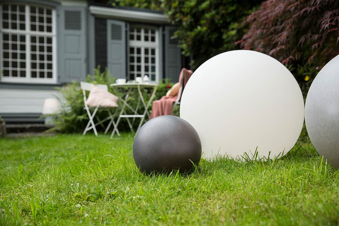 Die anthrazitfarbene Gartenkugel ist in 4 verschiedenen Größen, 30 cm, 40 cm, 50 cm und 60 cm erhältlich. Kombinieren Sie doch als Idee verschiedene Kugelgrößen in der gleichen Farbe miteinander. Auch verschiedene Farben lassen sich als Eye-Catcher toll als Leuchtenkombination gestalten. Werten Sie damit Rasenflächen auf oder nutzen Sie die moderne Gartenbeleuchtung dekorativ für dunkle Ecken Ihres Außenbereichs. Wir empfehlen Ihnen für tolle Lichteffekte in Ihrem Außenbereich auch unsere Solarleuchte Steinoptik ebenfalls in der Farbe anthrazit.