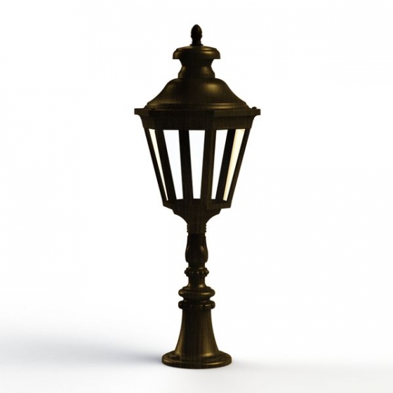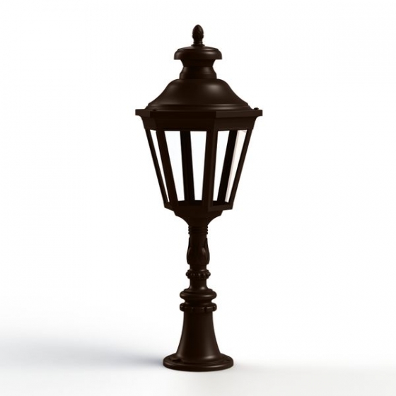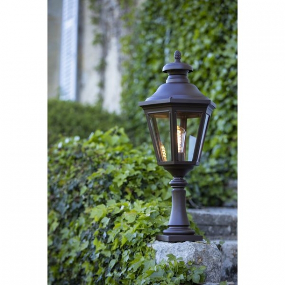Die stilvolle 89,5 cm hohe LED-Aussenleuchte klassisch Modell Louis XIII besteht aus hochwertigem Aluminium. Die im Design klassisch-antike Sockelleuchte ist mit der Schutzart IP 44 wetterfest, so dass Sie sich sehr gut für den Einsatz im Freien eignet. Die stilvolle Gartenlaterne überzeugt mit detailreichen ringförmigen Verzierungen am Sockel. Die hochwertig verarbeitete Außenleuchte zeigt einen rundförmigen im Durchmesser 18,7 cm breiten Sockelfuß und kombiniert insgesamt verschiedene eckige Stilelemente mit rundförmigen Konturen. Die zierende dekorative Pinienzapfen-Spitze ist dabei ein wirklich schöner Hingucker. Zweifelsohne eignet sich die klassisch-antike Gartenlaterne sowohl als Außenbeleuchtung im Landhausstil, als stilgerechte Beleuchtung von Gehöften, historischen Villen und klassischen Architekturhäusern. Die dekorative Laternenleuchte ist auch als tolle Gastronomiebeleuchtung schön anzuschauen. Illuminieren Sie mit der stilvollen Gartenlaterne mit Sockel Ihre Außenwege, Mauerabsätze, Treppenabsätze oder andere Sockelbereiche, wo eben eine neue Außenbeleuchtung gewünscht wird. Der französische Hersteller bietet die Leuchte hier mit einer LED-Platine integriert im Leuchtendach an. Die flache LED-Platine sorgt mit 3000 Kelvin in der Lichtfarbe für ein warmweißes Licht. Mit 13 Watt Leistung ist die LED-Gartenleuchte absolut stromsparend und energieeffizient.