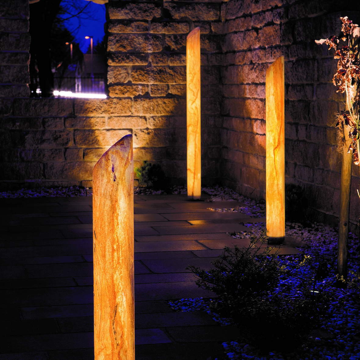 Die ortsfeste und freistrahlende Säulenleuchte Modell Dubai wird aus hochwertigen Materialien hergestellt. Der innere Korpus besteht aus Acrylglas (PMMA XT) und für die besondere Optik sorgt eine Natursteinbeschichtung. Die Quarzsandsteinbeschichtung wird dabei in sehr sorgfältiger Arbeit von Hand aufgetragen und versiegelt. Der Fuß aus eloxiertem Aluminium (matt/silber E6/EV1) sorgt für Standfestigkeit. Der Hersteller verwendet dabei ausschließlich witterungsresistente Edelstahlschrauben. Die exklusive Design-Außenleuchte lässt mit ihrer umlaufend symmetrischen Lichtstärkenverteilung auch an der oberen Schräge Licht austreten. Die Leuchte ist sowohl am Tage als auch abends beleuchtet ein sehr schöner Eyecatcher. Tolle Lichtakzente im Hauseingangsbereich werten das äußere Erscheinungsbild mit beginnender Dämmerung entsprechend auf. Sie wählen bei der Gartenbeleuchtung mit LED zwischen drei verschiedenen LED-Varianten: