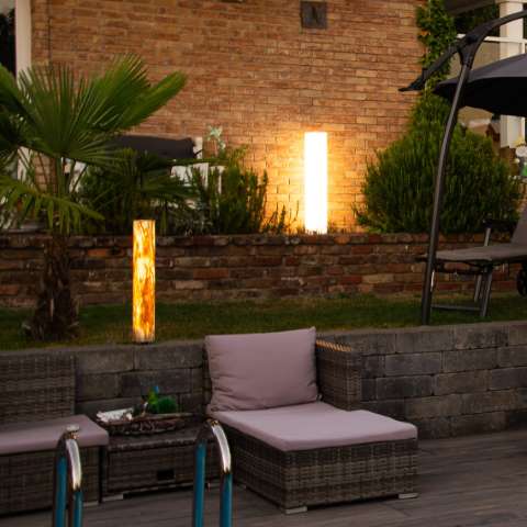 Die lichtstarke Luxus LED-Aussenleuchte Dubai 132 bietet Ihnen vielfältige Gestaltungsmöglichkeiten. Die außergewöhnlich stimmungsvolle Lichtwirkung basiert auf der edlen Natursteinbeschichtung, die fachmännisch von Hand aufgetragen wird und diese Leuchte damit zu einem Unikat macht. Das schlagfeste 21 cm tiefe Rohrgehäuse wird aus PMMA XT (hochwertiges Acrylglas) gefertigt und der Sockelfuß besteht aus eloxiertem Aluminium. Der obere Abschluß/ Deckel besteht bei der stilvollen Aussenleuchte mit LED aus Edelstahl. Die Aussenleuchte mit LED ist seitens des deutschen Herstellers mit einer 3-jährigen Garantie auf die Leuchte versehen. Die dekorative Pollerleuchte ist ortsfest und hat bei einem Lichtaustritt von 360° eine symmetrische Lichtverteilung. Die 1,32 meterhohe Luxus LED-Aussenleuchte Dubai erzeugt ein blendfreies, warmes Licht und sorgt so für eine angenehme und außergewöhnlich stimmungsvolle Beleuchtung von Flächen und Wegen im öffentlichen als auch privaten Bereich. Die exklusive Terrassenbeleuchtung der Serie Dubai erhalten Sie bei uns in weiteren Größen. Die langlebigen LEDs sind aus Gründen der Nachhaltigkeit später leicht austauschbar. Sie wählen bei der Säulenleuchte zwischen drei verschiedenen LED-Ausführungen: