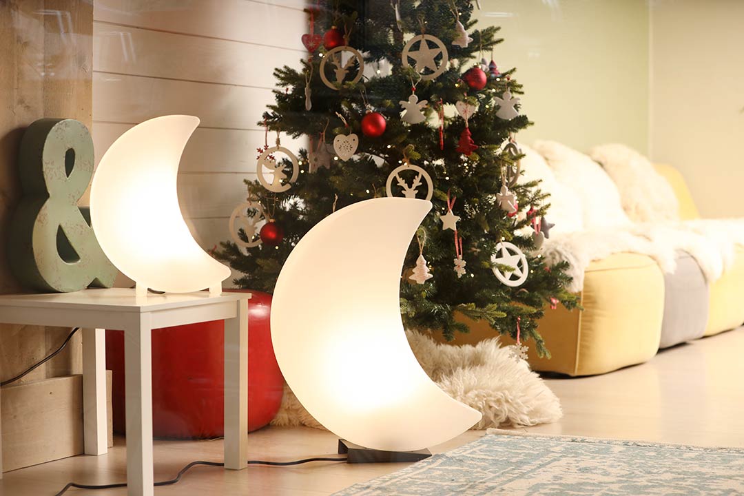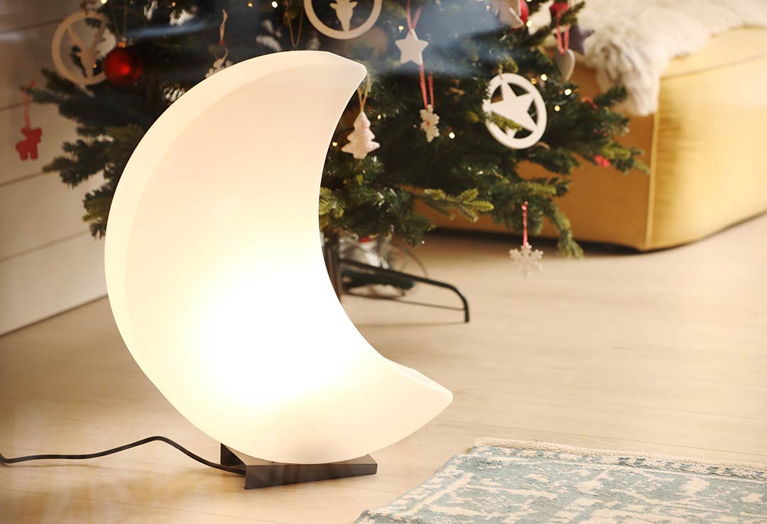 Unsere winterlich-weihnachtliche Mondleuchte Garten wird in Deutschland unter dem Aspekt der Nachhaltigkeit aus robustem Polyethylen hergestellt. Die Außenbeleuchtung entspricht der Schutzart IP 44 und ist damit wetterfest und robust gegen Schnee, Regen und Kälte. Die im Design moderne LED-Motivleuchte lässt sich mit Hilfe einer Fernbedienung einfach an-und ausschalten oder auch 5-stufig dimmen. Der beleuchtete LED-RGB-Mond lässt sich sowohl im Freien als auch in Innenräumen als dekorative Beleuchtung stilvoll einsetzen. Die E 27-Lampenfassung wird standardmäßig inklusive einem LED-RGB-Leuchtmittel geliefert. 15 verschiedene Farben können mit entsprechendem Farbverlauf bequem per Fernbedienung gewechselt werden. Sie lassen den Lichtmond somit jeder Stimmung und Gelegenheit entsprechend in einem passenden Licht erstrahlen. Die verwendeten Leuchtmittel sind langlebig, ökonomisch und später ohne viel Aufwand leicht austauschbar. Dazu werden lediglich drei Schrauben gelöst und das Leuchtmittel ausgedreht und ersetzt. Die dekorative Außenbeleuchtung ist hitze-und kältebeständig und eignet sich daher auch sehr gut für den gewerblichen Außenbereich. Erzeugen Sie mit dieser originellen Gartenleuchte winterliche Gemütlichkeit bei Ihren Gästen und Besuchern.
