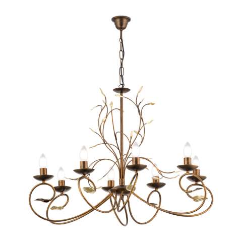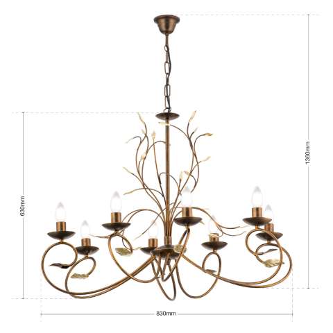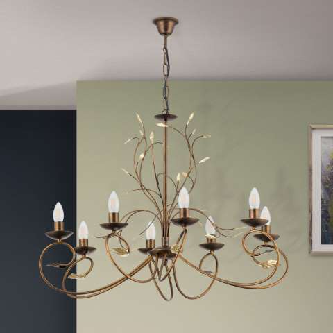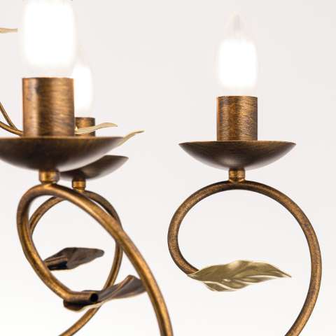 Die Pendelleuchte Vintage aus unserer Modellserie Tirol kombiniert rustikale Schmiedekunst mit einer eleganten floralen Gestaltung. Ihre acht geschwungenen Arme wachsen in der Form filigraner Zweige empor und sind mit edlen, vergoldeten Blättern verziert. Die detailreiche Verarbeitung und die antike Oberflächenveredelung in Antik-Gold verleihen der Indoor- Hängeleuchte Tirol ihren einzigartigen Vintage-Charme und machen sie zum perfekten Highlight für stilvolle Wohnräume. Die Pendelleuchte Vintage – Modellserie Tirol bringt mit ihrem detailreichen Schmiededesign eine romantisch-rustikale Note in Ihr Zuhause. Sie vereint nostalgischen Charme mit moderner Beleuchtungstechnik und sorgt für eine stilvolle Atmosphäre in Ihrewn Innenräumen.