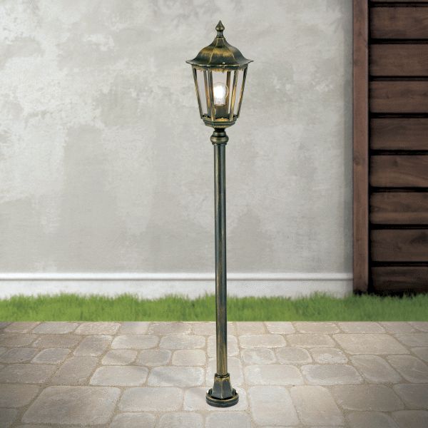 Die zeitgenössische Restaurant Außenbeleuchtung 140cm gehört zu unserer Modellserie Kaprun und ist, wie es der Name bereits sagt, insgesamt 140 cm hoch. Die Laternenhaube ist in der Breite 22 cm tief. Die dekorative Gartenlaterne wird aus Siluminguss hergestellt, einer besonders widerstandsfähigen Aluminiumgusslegierung aus Aluguss in Verbindung mit Silicium. Silicium wird z.B. auch im KfZ- und Flugzeugbau als Material verwendet. Die sechs Fenstereinsätze werden bei dem sechseckigen Laternenkorpus aus hochwertigem Rauchglas gefertigt. Rauchglas erfreute sich schon bereits in den sechziger Jahren in der Beleuchtung großer Beliebtheit und besticht in seiner Lichtwirkung mit eher weichen Linien. Die Restaurant Außenbeleuchtung 140cm kommt vom österreichischen Hersteller Orion-Leuchten und hat ein Gesamtgewicht von 3,5 Kilogramm. Wir empfehlen die dekorative Aussenleuchte insbesondere als stilvolle Gastronomie Außenbeleuchtung. Ob in den Außenanlagen eines Restaurants, eines Hotels oder einer Gaststätte, die im Design rustikale Aussenleuchte Kaprun ist sowohl beleuchtet als auch unbeleuchtet schön anzuschauen. Das dekorative Leuchtendach überzeugt das Auge des Betrachters mit seiner extravaganten Form. Die schwarz-goldene Outdoor-Leuchte eignet sich als dekorative Wegbeleuchtung, als Terrassenbeleuchtung oder auch als Lichtquelle in den umgebenden Beeten. Die Gartenleuchte Kaprun eignet sich mit der Schutzart IP 43 eher für etwas geschütztere Standorte. Der österreichische Hersteller gibt auf die Leuchte ab Werk 2 Jahre Garantie. Setzen Sie mit der Gartenlaterne Kaprun tolle Lichtakzente in Ihrem Außenbereich.