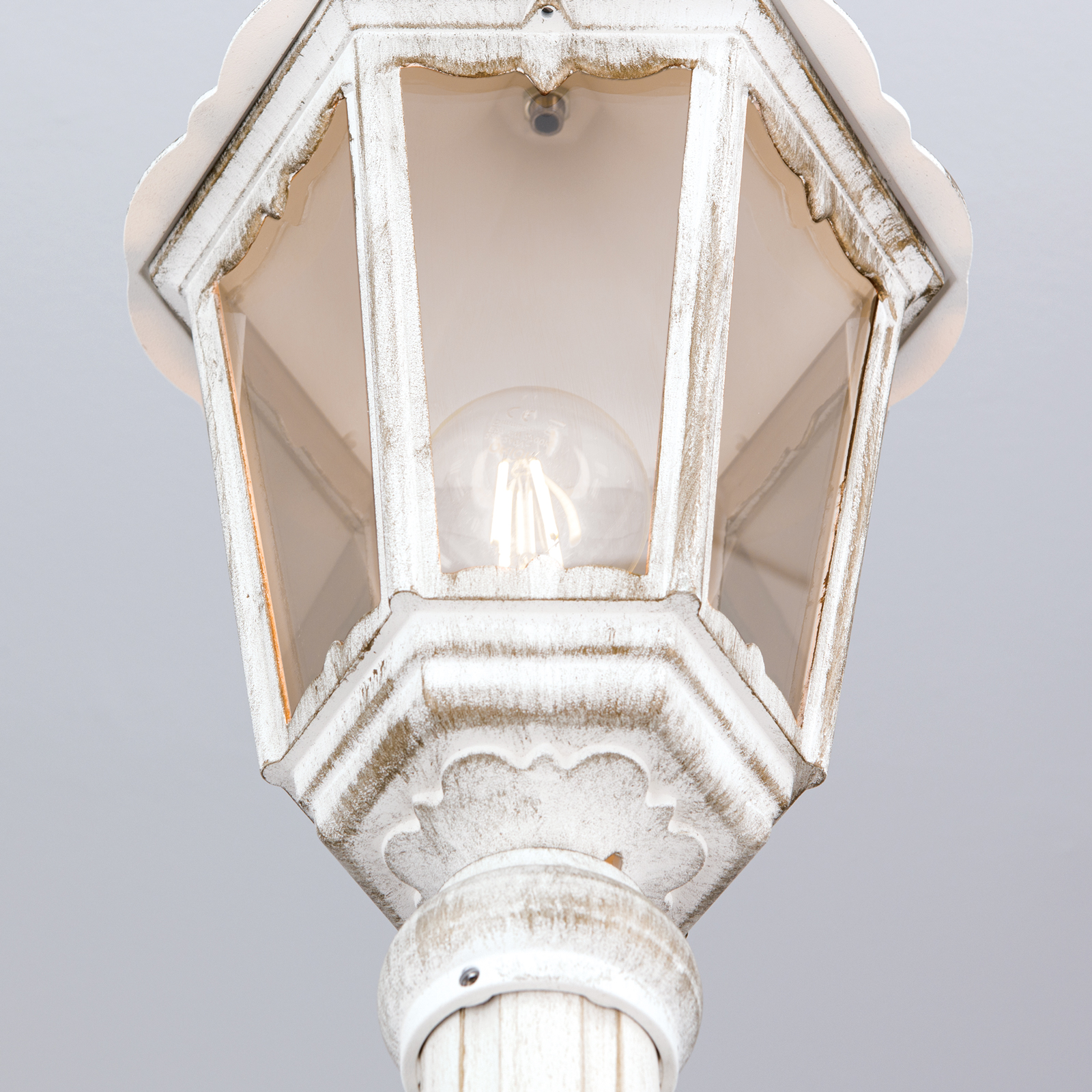 Die dekorative Restaurant Aussenbeleuchtung 211cm unserer Leuchtenserie Graz ist von ihren Maßen 2,11 Meter hoch. Der Leuchtenkorpus/ Laternenhaube hat einen Durchmesser von 22 Zentimetern und ist mit hochwertigen Rauchglaseinsätzen bestückt. Die vom Design eher verspielt elegante Außenbeleuchtung erinnert einen an den italienischen Rokoko-Stil. Die verspielte Form passt sehr schön zu weiß verklinkerten Immobilien im klassischen auch mediterranen Baustil. Die hochwertige Restaurant Aussenbeleuchtung Modell Graz besticht mit ihrem besonderen Antlitz, einem Farb- Melange aus Weiß und Gold. Die stilvolle Gartenbeleuchtung wird aus Siluminguss hergestellt, einer besonders widerstandsfähigen Aluminiumguss-Legierung aus Aluguss in Verbindung mit Silicium. Silicium wird z.B. auch im Flugzeugbau verwendet. Die klassisch-nostalgische Standleuchte gibt es in dieser Ausführung auch mit 2,49 Metern Gesamthöhe und einer etwas größeren Laterne, unsere klassische Gartenlaterne.