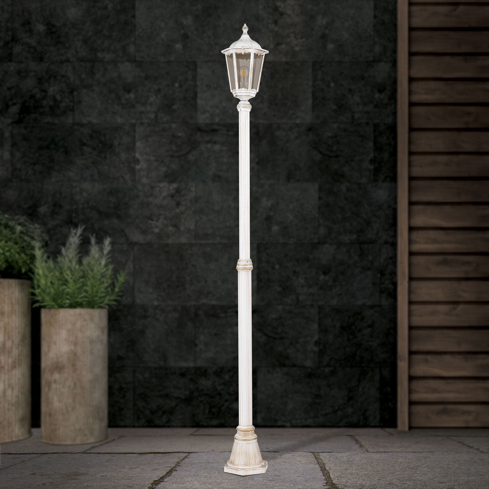 Die einflammige Garten-Mastleuchte eignet sich als vom Design antik-klassische Wegbeleuchtung, Beleuchtung im Vorgarten oder auch als stilgerechte Außenbeleuchtung im Terrassenbereich. Setzen Sie mit dieser Gartenlaterne tolle Lichtakzente in Ihren Außenanlagen und schaffen Sie damit optisch auch in der Dunkelheit in Ihrer betrieblichen Umgebung räumliche Tiefe. Gäste und Besucher sollen sich schließlich auch im Dunkeln bei Ihnen wohlfühlen. Die vom Design eher klassische und verspielte Gartenleuchte eignet sich mit der Schutzart IP 43 eher für etwas geschütztere Standorte. Der österreichische Hersteller gibt auf die Außenleuchte ab Werk 2 Jahre Garantie. Das Eigengewicht der Leuchte beträgt 7,8 Kilogramm. Leuchtmittel sind bei Lieferung nicht enthalten.