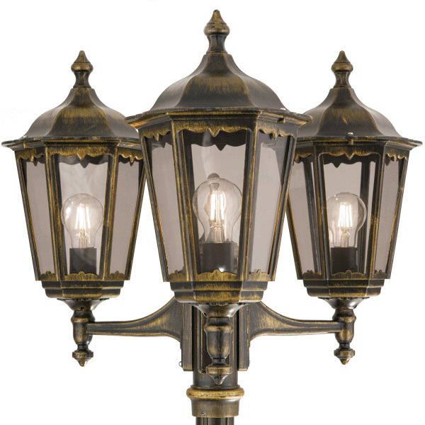 Die stilistisch antik-rustikale Restaurant Aussenbeleuchtung 3-flammig gehört zu unserer Leuchtenserie Kaprun. Die stilvolle Außenbeleuchtung für Gastronomie und Gewerbe wird aus Siluminguss hergestellt, einer besonders widerstandsfähigen Aluminiumgusslegierung aus Aluguss in Verbindung mit Silicium. Silicium wird z.B. auch im KfZ- und Flugzeugbau als Material verwendet. Die Fenstereinsätze werden aus hochwertigem Rauchglas gefertigt. Rauchglas erfreute sich schon bereits in den sechziger Jahren in der Beleuchtung großer Beliebtheit und kommt auch heute wieder immer mehr in Mode. Die Restaurant Aussenbeleuchtung 3-flammig ist insgesamt 255 cm hoch. Der Durchmesser der gesamten Gartenleuchte beträgt 64 cm. Weitere Maßangaben zum Kandelaber: Sockel-Durchmesser: 23 cm bzw 26 cm, Sockelhöhe: 6,10 cm, Glaseinsatz (Laternenhaube): oben 8,5 cm breit, unten 5,5 cm breit, Höhe der einzelnen Laternenhaube 46 cm. Der gusseiserne Garten-Kandelaber Kaprun eignet sich daher auch für Örtlichkeiten mit weniger Platz. Die hochwertige Restaurant Aussenbeleuchtung 3-flammig eignet sich insbesondere als ergänzende Außenbeleuchtung für den altdeutschen Archtitekturstil. Setzen Sie mit dem Kandelaber aus unserer Modellserie Kaprun stilvoll tolle Lichtakzente in Ihren Außenanlagen. Die schwarz-goldfarbene Außenleuchte mit sechsseitigen Leuchtenhauben eignet sich gut als Wegbeleuchtung, als Terrassenbeleuchtung oder auch mal als kreative Beetbeleuchtung für die abendliche Ausleuchtung dunkler Ecken.
