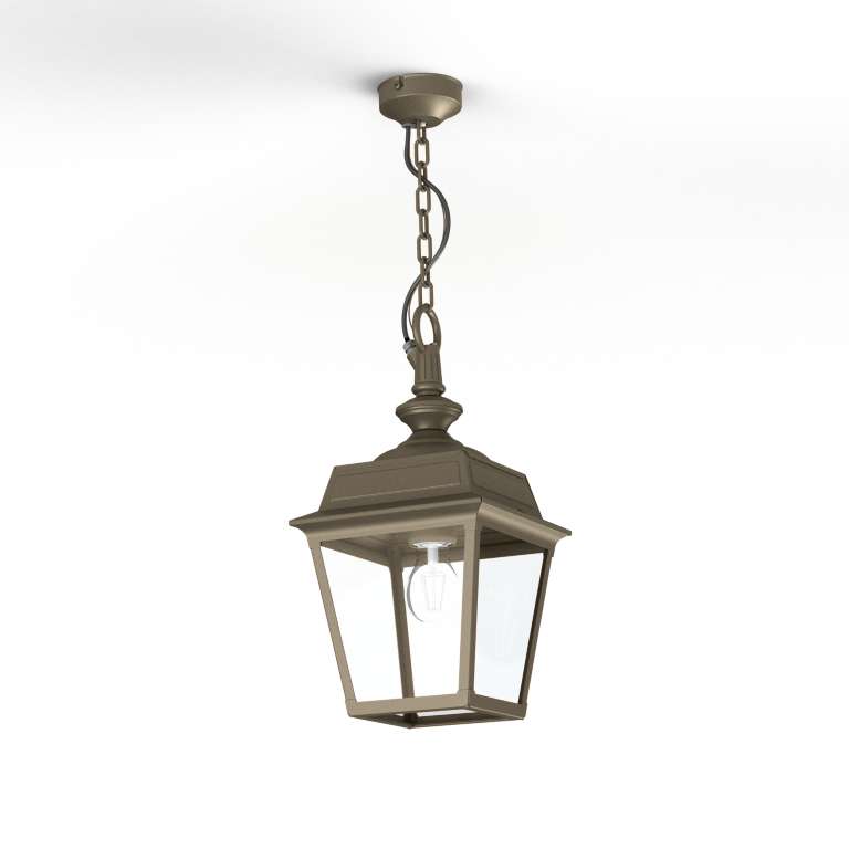 Die klassische Restaurant Außenbeleuchtung Vogese ist eine qualitativ hochwertige Hängelaterne mit 4 Echtglaseinsätzen. Die dekorative Laternen-Hängelampe ist inklusive der Kettenvorrichtung und Deckenmanschette von ihren Maßen 66,4 cm hoch und 21,4 cm breit sowie auch 21,4 cm tief. Die Laternenhaube weist allein eine Höhe von 32,9 cm auf. Die Decken-Pendelleuchte besticht durch ihr klassisches und zugleich doch auch modernes Design. Die wetterfeste Pendelleuchte wird mit Aluminium oder wahlweise auch mit Messing angeboten. Die Variante Messing ist versiegelt und getönt. In der Ausführung mit Aluminium stehen Ihnen bis zu 8 verschiedene Farben/RAL-Farben in der Auswahl zur Verfügung. Wählen Sie zwischen tiefschwarz (RAL 9005), weiß, schiefergrau, tannengrün (RAL 6009), sandsteinfarben, alt-rustikal (rostbraun), Grünspan-Patina oder goldfarbener Patina. Der französische Hersteller gibt bei der Designerleuchte Modell Vogese ab Werk auf das beschichtete Aluminium eine 25-jährige Anti-Korrosionsgarantie*. Die vier Glaseinsätze werden aus Echtglas gefertigt. Alternativ bietet der französische Hersteller Klarglas oder Mattglas (Opalglas) an. Wer es also absolut blendfrei benötigt, sollte sich für Opalglas entscheiden.